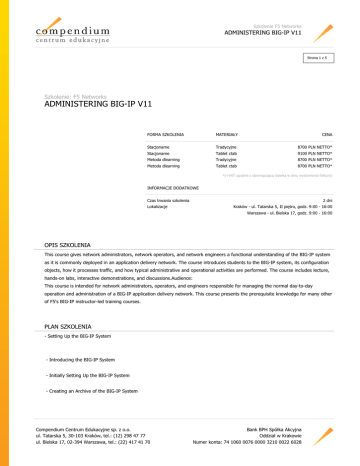 Szkolenie F5 Networks ADMINISTERING BIG-IP V11 Strona 1 z 5 Szkolenie: F5 Networks ADMINISTERING BIG-IP V11 FORMA SZKOLENIA MATERIAŁY CENA Stacjonarne Tradycyjne 8700 PLN NETTO* Stacjonarne Tablet ctab 9100 PLN NETTO* Metoda dlearning Tradycyjne 8700 PLN NETTO* Metoda dlearning Tablet ctab 8700 PLN NETTO* *(+VAT zgodnie z obowiązującą stawką w dniu wystawienia faktury) INFORMACJE DODATKOWE Czas trwania szkolenia Lokalizacje 2 dni Kraków - ul. Tatarska 5, II piętro, godz. 9:00 - 16:00 Warszawa - ul. Bielska 17, godz. 9:00 - 16:00 OPIS SZKOLENIA This course gives network administrators, network operators, and network engineers a functional understanding of the BIG-IP system as it is commonly deployed in an application delivery network. The course introduces students to the BIG-IP system, its configuration objects, how it processes traffic, and how typical administrative and operational activities are performed. The course includes lecture, hands-on labs, interactive demonstrations, and discussions.Audience: This course is intended for network administrators, operators, and engineers responsible for managing the normal day-to-day operation and administration of a BIG-IP application delivery network. This course presents the prerequisite knowledge for many other of F5's BIG-IP instructor-led training courses. PLAN SZKOLENIA - Setting Up the BIG-IP System - Introducing the BIG-IP System - Initially Setting Up the BIG-IP System - Creating an Archive of the BIG-IP System Compendium Centrum Edukacyjne sp. z o.o. ul. Tatarska 5, 30-103 Kraków, tel.: (12) 298 47 77 ul. Bielska 17, 02-394 Warszawa, tel.: (22) 417 41 70 Bank BPH Spółka Akcyjna Oddział w Krakowie Numer konta: 74 1060 0076 0000 3210 0022 6028 Szkolenie F5 Networks ADMINISTERING BIG-IP V11 Strona 2 z 5 - Traffic Processing Building Blocks - Identifying BIG-IP Traffic Processing Objects - Network Packet Flow - Configuring Virtual Servers and Pools - Load Balancing Concepts - Viewing Statistics and Logs - Using NATs and SNATs - Address Translation on the BIG-IP System - NAT Concepts - Solving Routing Issues with SNATs - Configuring SNAT Auto Map on a Virtual Server - Monitoring for and Mitigating Port Exhaustion - Using the Traffic Management Shell (tmsh) - Traffic Management Shell (tmsh) - BIG-IP Configuration State and Files - Saving and Replicating Configuration Data (UCS and SCF) Compendium Centrum Edukacyjne sp. z o.o. ul. Tatarska 5, 30-103 Kraków, tel.: (12) 298 47 77 ul. Bielska 17, 02-394 Warszawa, tel.: (22) 417 41 70 Bank BPH Spółka Akcyjna Oddział w Krakowie Numer konta: 74 1060 0076 0000 3210 0022 6028 Szkolenie F5 Networks ADMINISTERING BIG-IP V11 Strona 3 z 5 - Viewing the BIG-IP Connection Table - Monitoring Application Health - Introducing Monitors - Types of Monitors - Monitor Interval and Timeout Settings - Configuring Monitors - Assigning Monitors to Resources - Managing Pool, Pool Member, and Node Status - Using the Network Map - Modifying Traffic Behavior with Profiles - Introducing Profiles - Understanding Profile Types and Dependencies - Configuring and Assigning Profiles - Introducing SSL Termination - Modifying Traffic Behavior with Persistence - Understanding the Need for Persistence Compendium Centrum Edukacyjne sp. z o.o. ul. Tatarska 5, 30-103 Kraków, tel.: (12) 298 47 77 ul. Bielska 17, 02-394 Warszawa, tel.: (22) 417 41 70 Bank BPH Spółka Akcyjna Oddział w Krakowie Numer konta: 74 1060 0076 0000 3210 0022 6028 Szkolenie F5 Networks ADMINISTERING BIG-IP V11 Strona 4 z 5 - Introducing Source Address Affinity Persistence - Introducing Cookie Persistence - Managing Object State - Troubleshooting the BIG-IP System - Configuring Logging - Monitoring the BIG-IP System Remotely with SNMP - Using tcpdump on the BIG-IP System - Leveraging the BIG-IP iHealth System - Working with F5 Technical Support - Administering the BIG-IP System - Monitoring Network Health - Always-On Management (AOM) - License Dates and Upgrade Considerations - BIG-IP Disk and Software Management - Expanding Availability with Device Service Clustering - User Roles and Administrative Partitions - CMP and vCMP - iApps Overview Compendium Centrum Edukacyjne sp. z o.o. ul. Tatarska 5, 30-103 Kraków, tel.: (12) 298 47 77 ul. Bielska 17, 02-394 Warszawa, tel.: (22) 417 41 70 Bank BPH Spółka Akcyjna Oddział w Krakowie Numer konta: 74 1060 0076 0000 3210 0022 6028 Szkolenie F5 Networks ADMINISTERING BIG-IP V11 Strona 5 z 5 - Customizing Application Delivery with iRules - iRules Concepts - iRules Events - iRules Resources WYMAGANIA DLA UCZESTNIKA Students should understand: - Network concepts and configuration CERTYFIKATY The participants will obtain certificates signed by F5 Networks (course completion). This course also will help to prepare you for the F5 Networks Administrator certification (F5-CA) exams Exam 101 - Application Delivery Fundamentals and Exam 201 - TMOS Administration, which is available through the Pearson VUE test centers. PROWADZĄCY Certified F5 Networks Trainer. Compendium Centrum Edukacyjne sp. z o.o. ul. Tatarska 5, 30-103 Kraków, tel.: (12) 298 47 77 ul. Bielska 17, 02-394 Warszawa, tel.: (22) 417 41 70 Bank BPH Spółka Akcyjna Oddział w Krakowie Numer konta: 74 1060 0076 0000 3210 0022 6028