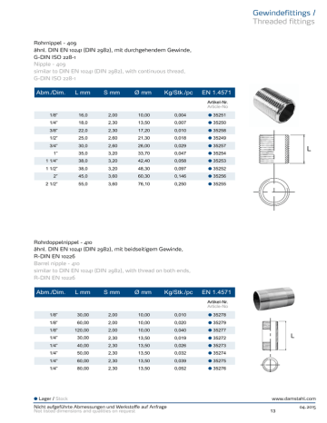 Gewindefittings / Threaded fittings Rohrnippel - 409 ähnl. DIN EN 10241 (DIN 2982), mit durchgehendem Gewinde, G-DIN ISO 228-1 Nipple - 409 similar to DIN EN 10241 (DIN 2982), with continuous thread, G-DIN ISO 228-1 Abm./Dim. L mm S mm Ø mm Kg/Stk./pc EN 1.4571 Artikel-Nr. Article-No 1/8” 16,0 2,00 10,00 0,004 ● 35251 1/4” 18,0 2,30 13,50 0,007 ● 35250 3/8” 22,0 2,30 17,20 0,010 ● 35258 1/2” 25,0 2,60 21,30 0,018 ● 35249 3/4” 30,0 2,60 26,00 0,029 ● 35257 1” 35,0 3,20 33,70 0,047 ● 35254 1 1/4” 38,0 3,20 42,40 0,058 ● 35253 1 1/2” 38,0 3,20 48,30 0,097 ● 35252 2” 45,0 3,60 60,30 0,146 ● 35256 2 1/2” 55,0 3,60 76,10 0,250 ● 35255 L Rohrdoppelnippel - 410 ähnl. DIN EN 10241 (DIN 2982), mit beidseitigem Gewinde, R-DIN EN 10226 Barrel nipple - 410 similar to DIN EN 10241 (DIN 2982), with thread on both ends, R-DIN EN 10226 Abm./Dim. L mm S mm Ø mm Kg/Stk./pc EN 1.4571 Artikel-Nr. Article-No 1/8” 30,00 2,00 10,00 0,010 ● 35278 1/8” 60,00 2,00 10,00 0,020 ● 35279 1/8” 120,00 2,00 10,00 0,040 ● 35277 1/4” 30,00 2,30 13,50 0,019 ● 35272 1/4” 40,00 2,30 13,50 0,026 ● 35273 1/4” 50,00 2,30 13,50 0,032 ● 35274 1/4” 60,00 2,30 13,50 0,039 ● 35275 1/4” 80,00 2,30 13,50 0,052 ● 35276 ● Lager / Stock Nicht aufgeführte Abmessungen und Werkstoffe auf Anfrage Not listed dimensions and qualities on request L www.damstahl.com 13 04.2015