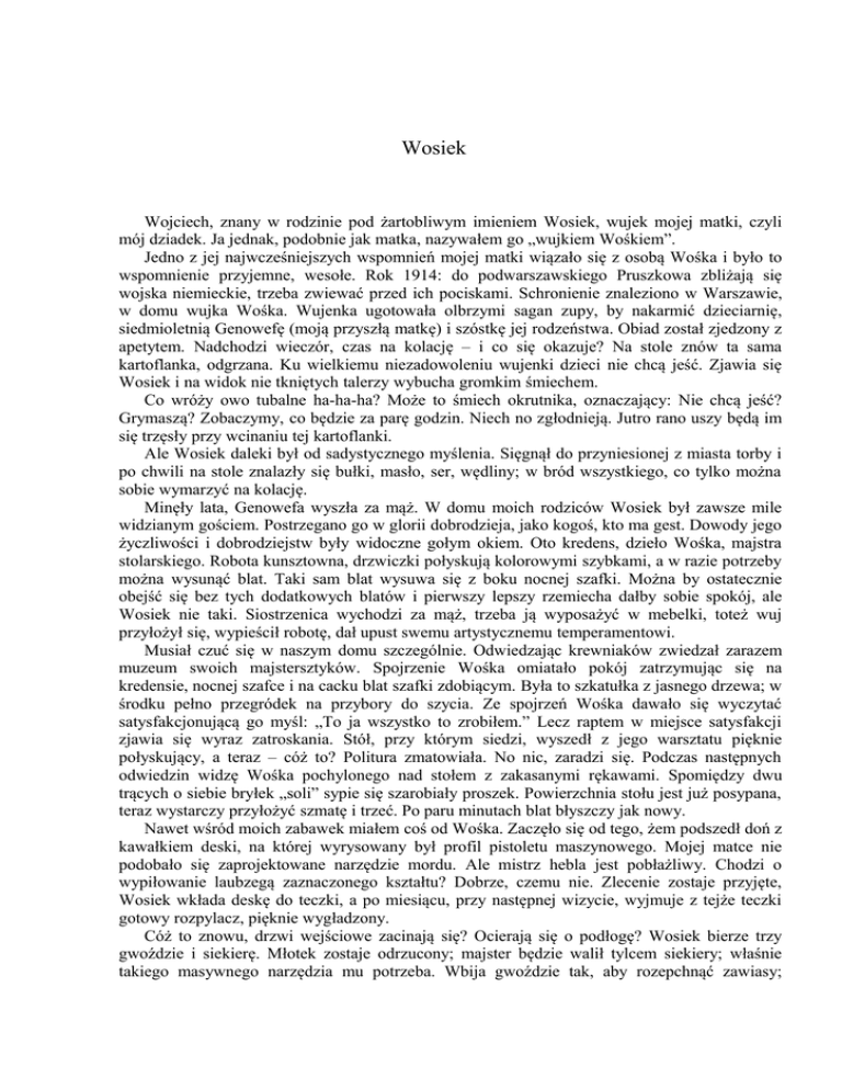Wosiek Wojciech, znany w rodzinie pod żartobliwym imieniem Wosiek, wujek mojej matki, czyli mój dziadek. Ja jednak, podobnie jak matka, nazywałem go „wujkiem Wośkiem”. Jedno z jej najwcześniejszych wspomnień mojej matki wiązało się z osobą Wośka i było to wspomnienie przyjemne, wesołe. Rok 1914: do podwarszawskiego Pruszkowa zbliżają się wojska niemieckie, trzeba zwiewać przed ich pociskami. Schronienie znaleziono w Warszawie, w domu wujka Wośka. Wujenka ugotowała olbrzymi sagan zupy, by nakarmić dzieciarnię, siedmioletnią Genowefę (moją przyszłą matkę) i szóstkę jej rodzeństwa. Obiad został zjedzony z apetytem. Nadchodzi wieczór, czas na kolację – i co się okazuje? Na stole znów ta sama kartoflanka, odgrzana. Ku wielkiemu niezadowoleniu wujenki dzieci nie chcą jeść. Zjawia się Wosiek i na widok nie tkniętych talerzy wybucha gromkim śmiechem. Co wróży owo tubalne ha-ha-ha? Może to śmiech okrutnika, oznaczający: Nie chcą jeść? Grymaszą? Zobaczymy, co będzie za parę godzin. Niech no zgłodnieją. Jutro rano uszy będą im się trzęsły przy wcinaniu tej kartoflanki. Ale Wosiek daleki był od sadystycznego myślenia. Sięgnął do przyniesionej z miasta torby i po chwili na stole znalazły się bułki, masło, ser, wędliny; w bród wszystkiego, co tylko można sobie wymarzyć na kolację. Minęły lata, Genowefa wyszła za mąż. W domu moich rodziców Wosiek był zawsze mile widzianym gościem. Postrzegano go w glorii dobrodzieja, jako kogoś, kto ma gest. Dowody jego życzliwości i dobrodziejstw były widoczne gołym okiem. Oto kredens, dzieło Wośka, majstra stolarskiego. Robota kunsztowna, drzwiczki połyskują kolorowymi szybkami, a w razie potrzeby można wysunąć blat. Taki sam blat wysuwa się z boku nocnej szafki. Można by ostatecznie obejść się bez tych dodatkowych blatów i pierwszy lepszy rzemiecha dałby sobie spokój, ale Wosiek nie taki. Siostrzenica wychodzi za mąż, trzeba ją wyposażyć w mebelki, toteż wuj przyłożył się, wypieścił robotę, dał upust swemu artystycznemu temperamentowi. Musiał czuć się w naszym domu szczególnie. Odwiedzając krewniaków zwiedzał zarazem muzeum swoich majstersztyków. Spojrzenie Wośka omiatało pokój zatrzymując się na kredensie, nocnej szafce i na cacku blat szafki zdobiącym. Była to szkatułka z jasnego drzewa; w środku pełno przegródek na przybory do szycia. Ze spojrzeń Wośka dawało się wyczytać satysfakcjonującą go myśl: „To ja wszystko to zrobiłem.” Lecz raptem w miejsce satysfakcji zjawia się wyraz zatroskania. Stół, przy którym siedzi, wyszedł z jego warsztatu pięknie połyskujący, a teraz – cóż to? Politura zmatowiała. No nic, zaradzi się. Podczas następnych odwiedzin widzę Wośka pochylonego nad stołem z zakasanymi rękawami. Spomiędzy dwu trących o siebie bryłek „soli” sypie się szarobiały proszek. Powierzchnia stołu jest już posypana, teraz wystarczy przyłożyć szmatę i trzeć. Po paru minutach blat błyszczy jak nowy. Nawet wśród moich zabawek miałem coś od Wośka. Zaczęło się od tego, żem podszedł doń z kawałkiem deski, na której wyrysowany był profil pistoletu maszynowego. Mojej matce nie podobało się zaprojektowane narzędzie mordu. Ale mistrz hebla jest pobłażliwy. Chodzi o wypiłowanie laubzegą zaznaczonego kształtu? Dobrze, czemu nie. Zlecenie zostaje przyjęte, Wosiek wkłada deskę do teczki, a po miesiącu, przy następnej wizycie, wyjmuje z tejże teczki gotowy rozpylacz, pięknie wygładzony. Cóż to znowu, drzwi wejściowe zacinają się? Ocierają się o podłogę? Wosiek bierze trzy gwoździe i siekierę. Młotek zostaje odrzucony; majster będzie walił tylcem siekiery; właśnie takiego masywnego narzędzia mu potrzeba. Wbija gwoździe tak, aby rozepchnąć zawiasy; wystarczy parę precyzyjnych uderzeń. Łup-łup i już gwoźdź do połowy wbity; łup-łup i już zagięty. Drzwi chodzą jak ta lala, a Wosiek odstępuje od progu jak gdyby nigdy nic, jak bokser, co powaliwszy przeciwnika zmierza do swego narożnika z niewzruszoną twarzą. Jeszcze jeden w naszym mieszkaniu przedmiot pochodził od Wośka, już nie mebel z jego warsztatu. Wosiek, zgodnie z okupacyjnym zarządzeniem, gotów był oddać hitlerowcom radio. Mój ojciec, dowiedziawszy się o tym, wybawił Wośka z kłopotu; zabrał radio i zakopał je na własnym podwórku. Odkopane po wojnie, spoczęło na stoliku w kącie pokoju i wszyscy troje, ojciec, matka i ja, uważaliśmy, że mamy radio; nasze własne, bynajmniej nie wypożyczone, lecz coś, do czego mamy pełne prawo. Nie zdawaliśmy sobie sprawy, że inaczej patrzy na to Wosiek. Odwiedziwszy nas w roku 1950 Wosiek targnął głową w stronę odbiornika. – Przecież ja bym to wziął, ale po co? Żeby słuchać komunistycznej propagandy? Słysząc to matka spojrzała na swego wujka dziwnym wzrokiem. Więc jak to? Gdyby program był ciekawszy, radio zostałoby odebrane? Toć przecież myśmy życiem ryzykowali za ukrywanie aparatu i jeśli go przechowaliśmy, to dla siebie, a nie dla Wośka, który z radia gotów był zrezygnować odstępując je Niemcom. Zdziwienie było obopólne. Matka dziwiła się Wośkowi, że rości sobie jeszcze jakieś pretensje do radia, a Wosiek skrycie dziwił się nam, że ani myślimy o zwrocie, o oddaniu właścicielowi jego niezaprzeczonej własności. Ostatnia wizyta Wośka w naszym domu była krótka. Stojąc na środku pokoju, blady z irytacji, niezdolny do wykrztuszenia słowa, wskazywał ręką aparat. Mój ojciec, także bez słów, wyjął wtyczkę z kontaktu i wręczył skrzynkę Wośkowi. Co też strzeliło do głowy temu człowiekowi, zawsze skłonnemu do dawania, by raptem tak bezwzględnie upomnieć się o rzecz niegdyś należącą do niego, ale – niegdyś. Czy już tak zbiedniał na stare lata, że nie stać go było na nowe radio? A może nie podobała mu się nowa moda w przemyśle elektronicz