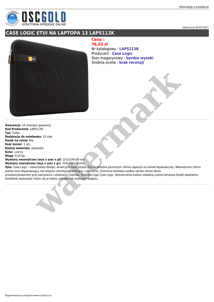 Informacje o produkcie Utworzono 03-03-2017 CASE LOGIC ETUI NA LAPTOPA 13 LAPS113K Cena : 76,53 zł er m ar k Nr katalogowy : LAPS113K Producent : Case Logic Stan magazynowy : bardzo wysoki Średnia ocena : brak recenzji w at Gwarancja: 24 miesiące gwarancji Kod Producenta: LAPS113K Typ: Torba Dedykacja do notebooka: 13 cale Pasek na ramię: Nie Ilość komór: 1 szt. Rodzaj materiału: polyester Kolor: czarny Waga: 0,16 kg Wymiary wewnętrzne (wys x szer x gł): 231x330x28 mm Wymiary zewnętrzne (wys x szer x gr): 254x356x28 mm Opis: Case Logic - nowoczesny design, atrakcyjna kolorystyka. Etui w układzie poziomym. Górne zapięcie na zamek błyskawiczny. Wewnętrzna 10mm pianka oraz dopasowujący się neopren amortyzują wstrząsy i uderzenia. Ochronna lamówka wzdłuż zamka chroni ekran przedzarysowaniem przy zamykaniu i otwieraniu futerału. Ozdobne logo Case Logic. Wykończenie boków ozdobną czarną lamówką Dzięki płaskiemu kształtowi doskonale mieści się w torbie, plecaku lub większym bagażu. Wygenerowano w programie www.oscGold.com