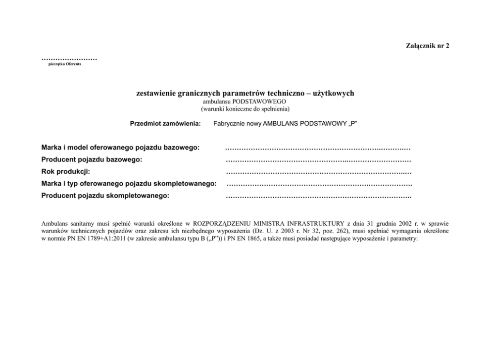 Załącznik nr 2 …………………… pieczątka Oferenta zestawienie granicznych parametrów techniczno – użytkowych ambulansu PODSTAWOWEGO (warunki konieczne do spełnienia) Przedmiot zamówienia: Fabrycznie nowy AMBULANS PODSTAWOWY „P” Marka i model oferowanego pojazdu bazowego: ………………………………………………………….……….… Producent pojazdu bazowego: ……………………………………………..……………………… Rok produkcji: …………………………………………………………………..… Marka i typ oferowanego pojazdu skompletowanego: …………………………………………………….………………. Producent pojazdu skompletowanego: …………………………………………………………………….. Ambulans sanitarny musi spełnić warunki określone w ROZPORZĄDZENIU MINISTRA INFRASTRUKTURY z dnia 31 grudnia 2002 r. w sprawie warunków technicznych pojazdów oraz zakresu ich niezbędnego wyposażenia (Dz. U. z 2003 r. Nr 32, poz. 262), musi spełniać wymagania określone w normie PN EN 1789+A1:2011 (w zakresie ambulansu typu B („P”)) i PN EN 1865, a także musi posiadać następujące wyposażenie i parametry: Lp. Wymagania dla samochodu bazowego i przedziału medycznego Spełniane warunki TAK/NIE Rok produkcji– 2013 lub 2012 fabrycznie nowy (potwierdzić) ……………………………………… I NADWOZIE 1 Typu „furgon” o dopuszczalnej masie całkowitej do 3,5 t częściowo przeszklony. 2 Drzwi tylne wysokie, przeszklone, otwierane na boki , kąt otwarcia min. 180 stopni, wyposażone w ograniczniki oraz blokady położenia skrzydeł (podać kąt otwarcia drzwi). 3 Drzwi boczne prawe przesuwane do tyłu z otwieranym oknem, ze stopniem stałym wewnętrznym lub ze stopniem mechanicznie wysuwanym 4 Dywaniki gumowe dla kierowcy i pasażera w kabinie kierowcy zapobiegające zbieraniu się wody na podłodze. 5 Stopień tylny antypoślizgowy stanowiący zderzak tylny ochronny. 6 Chlapacze kół przednich i tylnych. 7 Kolor nadwozia żółty (RAL 1016) lub biały zgodnie z PN EN 1789. 8 Centralny zamek wszystkich drzwi (łącznie z drzwiami zewnętrznego schowka) sterowany pilotem. 9 Autoalarm. 10 Immobilizer. 11 Minimalne wymiary przedziału ładunkowego: Długość 3,10m, szerokość 1,70m, wysokość 1,80m (podać). 12 Wizualna lub dźwiękowa sygnalizacja niedomkniętych drzwi w kabinie kierowcy oraz przedziale medycznym widoczna dla kierowcy. 13 Fotel kierowcy regulowany w min 3 płaszczyznach (góra – dół, przód – tył, z lędźwiową regulacją oparcia) oraz z podłokietnikiem 14 Elektrycznie podnoszone szyby w kabinie kierowcy. 15 Elektrycznie sterowane i podgrzewane lusterka boczne. Wbudowane światła kierunkowskazów 16 Poduszka powietrzna kierowcy i pasażera. 17 Radioodtwarzacz z CD, MP3, AUX z nagłośnieniem obu przedziałów: kierowcy i medycznego. Z możliwością regulacji głośności z przedziału medycznego. Opis spełnienia (dokładnie podać markę, model, oferowane urządzenia) 18 19 20 21 22 23 24 25 26 II 1 2 3 4 5 III 1 2 3 IV 1 2 3 4 5 6 7 V 1 Fabryczna klimatyzacja kabiny kierowcy z filtrem przeciw pyłkowym. Minimum dwa fabryczne gniazda 12V w kabinie kierowcy. Zamykany schowek w przedziale kierowcy mieszczący dokumenty o formacie min. A4. Reflektory przeciwmgielne przednie Lampka zamontowana w kabinie kierowcy na prawym słupku typu “gęsia szyja” Czujniki parkowania min. tylnie Przystosowany do przewozu min. 5 osób personelu medycznego wraz z kierowcą w pozycji siedzącej oraz 1 osoby w pozycji leżącej na noszach (podać ilość osób). Okna przedziału medycznego pokryte w 2/3 wysokości folią półprzeźroczystą. Izolacja termiczna i akustyczna ścian. SILNIK Zasilany olejem napędowym z zapłonem samoczynnym turbodoładowany, elastyczny zapewniający przyśpieszenie od 0 do 80 km/h w ciągu min. 35s. Pojemność silnika minimum 1950 cm³ Moc silnika min. 160 KM Maksymalny moment obrotowy minimum 350 Nm Norma emisji spalin Euro 5 NAPĘD Skrzynia biegów manualna synchronizowana Napęd na jedną oś ( na koła przednie lub tylne) Min 6 biegów do przodu i jeden bieg wsteczny UKŁAD HAMULCOWY i SYSTEMY BEZPIECZEŃSTWA Układ hamulcowy ze wspomaganiem Hamulce tarczowe na obu osiach (przód i tył) System zapobiegający zablokowaniu kół podczas hamowania – ABS lub równoważny System stabilizacji toru jazdy – ESP lub równoważny System zapobiegający poślizgowi kół w trakcie ruszania – ASR lub równoważny Elektroniczny układ rozdziału siły hamowania – EBD lub równoważny System wspomagania ruszania pod górę – AAS, HILL lub równoważny UKŁAD KIEROWNICZY Ze wspomaganiem 2 VI 1 2 VII 1 2 VIII 1 2 3 4 5 IX 1 2 Kolumna kierownicy regulowana min. w jednej płaszczyźnie ZAWIESZENIE Stabilizator osi przedniej i tylnej lub zawieszenie pneumatyczne (hydropneumatyczne) ze stabilizacją lub zawieszenie niezależne Zawieszenie gwarantujące dobrą przyczepność kół do nawierzchni , stabilność i manewrowość w trudnym terenie oraz odpowiedni komfort transportu pacjenta KOŁA I OGUMIENIE Rozmiar felg min. 16 cali , ogumienie letnie (na wyposażeniu ambulansu ) Dodatkowy kpl kół z ogumieniem zimowym (Radialne) OGRZEWANIE I WENTYLACJA Ogrzewanie postojowe - grzejnik elektryczny zasilany z sieci 230V z termostatem o mocy min. 2,0 kW (podać markę i model oraz moc oferowanego urządzenia). Mechaniczna wentylacja nawiewno-wywiewna zapewniająca min. 20-krotną wymianę powietrza na godzinę (podać wydajność w m3/godzinę). Dwuparownikowa klimatyzacja przedziału sanitarnego i kabiny kierowcy, z niezależną regulacją chłodzenia i siły nawiewu dla kabiny kierowcy i przedziału medycznego; Niezależny od silnika system ogrzewania przedziału medycznego (typu powietrznego) z możliwością ustawienia temperatury termostatem, umożliwiający ogrzanie przedziału medycznego zgodnie z PN EN 1789 (po