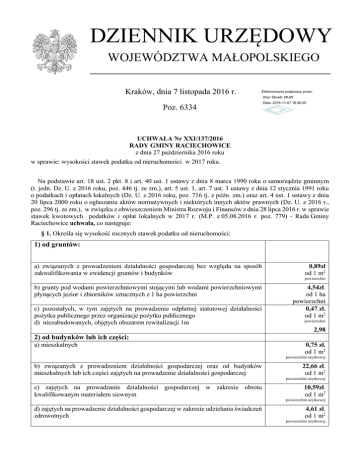 DZIENNIK URZĘDOWY WOJEWÓDZTWA MAŁOPOLSKIEGO Kraków, dnia 7 listopada 2016 r. Elektronicznie podpisany przez: Artur Słowik; MUW Poz. 6334 Data: 2016-11-07 16:40:20 UCHWAŁA Nr XXI/137/2016 RADY GMINY RACIECHOWICE z dnia 27 października 2016 roku w sprawie: wysokości stawek podatku od nieruchomości w 2017 roku. Na podstawie art. 18 ust. 2 pkt. 8 i art. 40 ust. 1 ustawy z dnia 8 marca 1990 roku o samorządzie gminnym (t. jedn. Dz. U. z 2016 roku, poz. 446 tj. ze zm.), art. 5 ust. 1, art. 7 ust. 3 ustawy z dnia 12 stycznia 1991 roku o podatkach i opłatach lokalnych (Dz. U. z 2016 roku, poz. 716 tj. z późn. zm.) oraz art. 4 ust. 1 ustawy z dnia 20 lipca 2000 roku o ogłaszaniu aktów normatywnych i niektórych innych aktów prawnych (Dz. U. z 2016 r., poz. 296 tj. ze zm.), w związku z obwieszczeniem Ministra Rozwoju i Finansów z dnia 28 lipca 2016 r. w sprawie stawek kwotowych podatków i opłat lokalnych w 2017 r. (M.P. z 05.08.2016 r. poz. 779) - Rada Gminy Raciechowice uchwala, co następuje: § 1. Określa się wysokość rocznych stawek podatku od nieruchomości: 1) od gruntów: a) związanych z prowadzeniem działalności gospodarczej bez względu na sposób zakwalifikowania w ewidencji gruntów i budynków 0,89zł od 1 m2 powierzchni b) grunty pod wodami powierzchniowymi stojącymi lub wodami powierzchniowymi płynących jezior i zbiorników sztucznych z 1 ha powierzchni c) pozostałych, w tym zajętych na prowadzenie odpłatnej statutowej działalności pożytku publicznego przez organizacje pożytku publicznego d) niezabudowanych, objętych obszarem rewitalizacji 1m 4,54zł. od 1 ha powierzchni 0,47 zł. od 1 m2 powierzchni 2,98 2) od budynków lub ich części: a) mieszkalnych 0,75 zł. od 1 m2 powierzchni użytkowej b) związanych z prowadzeniem działalności gospodarczej oraz od budynków mieszkalnych lub ich części zajętych na prowadzenie działalności gospodarczej 22,66 zł. od 1 m2 powierzchni użytkowej c) zajętych na prowadzanie działalności gospodarczej w zakresie obrotu kwalifikowanym materiałem siewnym 10,59zł. od 1 m2 powierzchni użytkowej d) zajętych na prowadzenie działalności gospodarczej w zakresie udzielania świadczeń zdrowotnych 4,61 zł. od 1 m2 powierzchni użytkowej Dziennik Urzędowy Województwa Małopolskiego –2– Poz. 6334 e) od pozostałych, w tym zajętych na prowadzenie odpłatnej statutowej działalności pożytku publicznego przez organizacje pożytku publicznego 7,62 zł. od 1 m2 powierzchni użytkowej A) budynków letniskowych 7,62zł. od 1 m2 7,62 zł. od 1 m2 B) garaży wolnostojących stanowiących własność osób fizycznych powierzchni użytkowej 3) od budowli 2% wartości określonej na podstawie art.4 ust. 1pkt.3 i ust. 3-7 § 2. Traci moc uchwała Nr XI/84/2015 Rady Gminy Raciechowice z dnia 29 października 2015 r. w sprawie wysokości stawek podatku od nieruchomości w 2016 roku. § 3. Wykonanie uchwały powierza się Wójtowi Gminy Raciechowice. §4. Uchwała wchodzi w życie po upływie 14 dni od dnia jej ogłoszenia w Dzienniku Urzędowym Województwa Małopolskiego i ma zastosowanie od dnia 1 stycznia 2017 roku. Przewodniczący Rady Gminy Raciechowice Jadwiga Dudzik