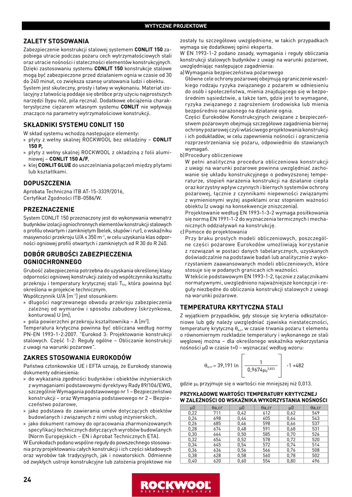 WYTYCZNE PROJEKTOWE ZALETY STOSOWANIA Zabezpieczenie konstrukcji stalowej systemem CONLIT 150 zapobiega utracie podczas pożaru cech wytrzymałościowych stali oraz utracie nośności i stateczności elementów konstrukcyjnych. Dzięki zastosowaniu systemu CONLIT 150 konstrukcje stalowe mogą być zabezpieczone przed działaniem ognia w czasie od 30 do 240 minut, co zwiększa szansę uratowania ludzi i obiektu. System jest skuteczny, prosty i łatwy w wykonaniu. Materiał izolacyjny z łatwością poddaje się obróbce przy użyciu najprostszych narzędzi (typu nóż, piła ręczna). Dodatkowe obciążenia charakterystyczne ciężarem własnym systemu CONLIT nie wpływają znacząco na parametry wytrzymałościowe konstrukcji. SKŁADNIKI SYSTEMU CONLIT 150 W skład systemu wchodzą następujące elementy: » płyty z wełny skalnej ROCKWOOL bez okładziny – CONLIT 150 P, » płyty z wełny skalnej ROCKWOOL z okładziną z folii aluminiowej – CONLIT 150 A/F, » klej CONLIT GLUE do uszczelniania połączeń między płytami lub kształtkami. DOPUSZCZENIA Aprobata Techniczna ITB AT-15-3339/2016, Certyfikat Zgodności ITB-0586/W. PRZEZNACZENIE System CONLIT 150 przeznaczony jest do wykonywania wewnątrz budynków izolacji ogniochronnych elementów konstrukcji stalowych o profilu otwartym i zamkniętym (belek, słupów i rur), o wskaźniku masywności przekroju U/A ≤ 350 m-1, w celu uzyskania klas odporności ogniowej profili otwartych i zamkniętych od R 30 do R 240. DOBÓR GRUBOŚCI ZABEZPIECZENIA OGNIOCHRONNEGO Grubość zabezpieczenia potrzebna do uzyskania określonej klasy odporności ogniowej konstrukcji zależy od współczynnika kształtu przekroju i temperatury krytycznej stali Tkr, która powinna być określona w projekcie technicznym. Współczynnik U/A [m-1] jest stosunkiem: » długości nagrzewanego obwodu przekroju zabezpieczenia zależnej od wymiarów i sposobu zabudowy (skrzynkowa, konturowa) U [m], » pola powierzchni przekroju kształtownika – A [m2]. Temperatura krytyczna powinna być obliczana według normy PN-EN 1993-1-2:2007. "Eurokod 3: Projektowanie konstrukcji stalowych. Część 1-2: Reguły ogólne – Obliczanie konstrukcji z uwagi na warunki pożarowe". zostały tu szczegółowo uwzględnione, w takich przypadkach wymaga się dodatkowej opinii eksperta. W EN 1993-1-2 podano zasady, wymagania i reguły obliczania konstrukcji stalowych budynków z uwagi na warunki pożarowe, uwzględniając następujące zagadnienia: a) Wymagania bezpieczeństwa pożarowego Główne cele ochrony pożarowej obejmują ograniczenie wszelkiego rodzaju ryzyka związanego z pożarem w odniesieniu do osób i społeczeństwa, mienia znajdującego się w bezpośrednim sąsiedztwie, a także tam, gdzie jest to wymagane, ryzyka związanego z zagrożeniem środowiska lub mienia bezpośrednio narażonego na działanie ognia. Części Eurokodów Konstrukcyjnych związane z bezpieczeństwem pożarowym obejmują szczegółowe zagadnienia biernej ochrony pożarowej czyli właściwego projektowania konstrukcji i ich podukładów, w celu zapewnienia nośności i ograniczenia rozprzestrzeniania się pożaru, odpowiednio do stawianych wymagań. b) Procedury obliczeniowe W pełni analityczna procedura obliczeniowa konstrukcji z uwagi na warunki pożarowe powinna uwzględniać zachowanie się układu konstrukcyjnego o podwyższonej temperaturze, stopień narażenia konstrukcji na działanie ciepła oraz korzystny wpływ czynnych i biernych systemów ochrony pożarowej, łącznie z czynnikami niepewności związanymi z wymienionymi wyżej aspektami oraz stopniem ważności obiektu (z uwagi na konsekwencje zniszczenia). Projektowanie według EN 1993-1-3-2 wymaga posiłkowania się normą EN 1991-1-2 do wyznaczenia termicznych i mechanicznych oddziaływań na konstrukcję. c) Pomoce do projektowania Przy braku prostych modeli obliczeniowych, poszczególne części pożarowe Eurokodów umożliwiają korzystanie z rozwiązań w postaci danych tabelarycznych, uzyskanych doświadczalnie na podstawie badań lub analitycznie z wykorzystaniem zaawansowanych modeli obliczeniowych, które stosuje się w podanych granicach ich ważności. W tekście podstawowym EN 1993-1-2, łącznie z załącznikami normatywnymi, uwzględniono najważniejsze koncepcje i reguły niezbędne do obliczania konstrukcji stalowych z uwagi na warunki pożarowe. TEMPERATURA KRYTYCZNA STALI Z wyjątkiem przypadków, gdy stosuje się kryteria odkształceniowe lub gdy należy uwzględniać zjawiska niestateczności, temperaturę krytyczną a,cr w czasie trwania pożaru t elementu o równomiernym rozkładzie temperatury i wykonanego ze stali węglowej można – dla określonego wskaźnika wykorzystania nośności 0 w czasie t=0 – wyznaczać według wzoru: ZAKRES STOSOWANIA EUROKODÓW Państwa członkowskie UE i EFTA uznają, że Eurokody stanowią dokumenty odniesienia: » do wykazania zgodności budynków i obiektów inżynierskich z wymaganiami podstawowymi dyrektywy Rady 89/106/EWG, szczególnie Wymagania podstawowego nr 1 – Bezpieczeństwo konstrukcji – oraz Wymagania podstawowego nr 2 – Bezpieczeństwo pożarowe, » jako podstawa do zawierania umów dotyczących obiektów budowlanych i związanych z nimi usług inżynierskich, » jako dokument ramowy do opracowania zharmonizowanych specyfikacji technicznych dotyczących wyrobów budowlanych (Norm Europejskich – EN i Aprobat Technicznych ETA). W Eurokodach podano wspólne reguły do powszechnego stosowania przy projektowaniu całych konstrukcji i ich części składowych oraz wyrobów tak tradycyjnych, jak i nowatorskich. Odmienne od zwykłych ustroje konstrukcyjne lub założenia projektowe nie 24 a,cr 39,191 ln 1 0,967403,833 -1 +482 gdzie 0 przyjmuje się o wartości nie mniejszej niż 0,013. PRZYKŁADOWE WARTOŚCI TEMPERATURY KRYTYCZNEJ W ZALEŻNOŚCI OD WSKAŹNIKA WYKORZYSTANIA NOŚNOŚCI 0 0,22 0,24 0,26 0,28 0,30 0,32 0,34 0,36 0,38 0,40 a,cr 711 698 685 674 664 6