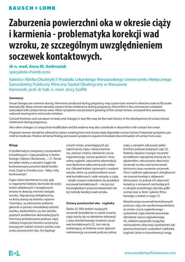 Zaburzenia powierzchni oka w okresie ciąży i karmienia - problematyka korekcji wad wzroku, ze szczególnym uwzględnieniem soczewek kontaktowych. dr n. med. Anna M. Ambroziak specjalista chorób oczu Katedra i Klinika Okulistyki II Wydziału Lekarskiego Warszawskiego Uniwersytetu Medycznego Samodzielny Publiczny Kliniczny Szpital Okulistyczny w Warszawie Kierownik: prof. dr hab. n. med. Jerzy Szaflik Summary: Visual changes are common during. Hormones produced during pregnancy may cause most women’s refractive state to fluctuate dramatically. Many women develop contact lenses intolerance during pregnancy. Discomfort is the commonest complaint associated with contact lenses wear. Other symptoms are persistent greasing of the contact lenses, increased lens awareness, reduced wearing time and ocular irritation. Corneal thickness and curvature increase and changes in tear film may be the main factors in the development of contact lenses intolerance during pregnancy. Also other changes i.e conjuctival modification and lid oedema may also contribute in discomfort with contact lens wear. Pregnant women should be advised to reduce wearing time and choose daily disposible contact lenses if reported symptoms are mild to moderate. Positive slit lamp finding and severe symptoms require immediate discontinuation of contact lens wear. Wstęp O problematyce związanej z soczewkami kontaktowymi i ciążą pisaliśmy w Kontaktologii i Optyce Okularowej .... (1). Temat ten jakże istotny a zarazem ciągle tak kontrowersyjny powrócił dzieki konferencji „Ciąża a choroby oczu - fakty, mity, kontrowersje”. Ciąża i okres karmienia to czas, gdy w organizmie kobiety dochodzi do wielu zmian układowych i narządowych, zmiany te dotyczą również narządu wzroku. Najczęstszą dolegliwością, na którą skarżą się kobiety ciężarne i karmiące, są zaburzenia widzenia głównie w postaci niestabilnej ostrości wzroku, dyskomfortu czy też szeroko pojetych problemów akomodacyjnych. Hormony produkowane podczas ciąży i laktacji mogą być bowiem przyczyną znaczących wahań ostrości wzroku oraz zmian powierzchni oka. Do fizjologi- cznych zmian, przemijających po zakończeniu ciąży i okresu karmienia, zaliczyć można: obniżenie czucia rogówkowego, wzrost grubości i krzywizny rogówki, zaburzenia akomodacji oraz dyskretne zaburzenia pola widzenia. Odsetek kobiet ciężarnych z wadami wzroku, które są użytkownikami soczewek kontaktowych, stale wzrasta, a ciąża – dzięki nowym materiałom do produkcji soczewek kontaktowych – nie jest już bezwzglednym przeciwwskazaniem do tej metody korekcji wad wzroku. Zmiany powierzchni oka - rogówka Około 25-30% kobiet noszących soczewki kontaktowe w czasie trwania ciąży skarży się na obniżenie tolerancji i czasu komfortowego noszenia soczewek kontaktowych (2). Jest rzeczą zaskakującą, że kobieta może zgłaszać nietolerancję soczewek podczas jednej ciąży, a zarazem odczuwać pełen komfort podczas kolejnych ciąż (3). Kobiety ciężarne noszące soczewki kontaktowe najczęściej skarżą się na dyskomfort, odczuwanie obecności soczewki na oku oraz konieczność skrócenia czasu noszenia soczewek. Choć nasilenie zgłaszanych dolegliwości nie zawsze koreluje z objawami klinicznymi, to jednak ich obecność świadczy o zmianach zachodzących w obrębie przedniego odcinka gałki ocznej oraz w ilości i jakości filmu łzowego u kobiet w ciąży (1). Nietolerancja soczewek kontaktowych podczas ciąży nie wynika bezpośrednio ze zmian czucia rogówkowego – aczkolwiek ciąża istotnie powoduje obniżenie czucia rogówkowego (4), niektóre pacjentki mogą być nieświadome obecności podrażnień lub powierzchownych uszkodzeń nabłonka rogówki, które w konsekwencji mogą www.academyofvisioncare.com prowadzić do poważnych powikłań. Głównymi czynnikami rozwoju nietolerancji soczewek są najprawdopodobniej zmiany grubości rogówki i jej krzywizny oraz zmiany w filmie łzowym. Rogówka zawiera 80% wody. Steroidowe hormony produkowane podczas ciąży i karmienia (progesteron i estrogeny), będące przyczyną zaburzeń elektrolitowych, prowadzą do zwiększonej retencji płynów, wzrostu uwodnienia tkanek i ich obrzęku. Dodatkowym czynnikiem, który może ten obrzęk nasilać, jest sama soczewka kontaktowa o niskiej tlenotransmisyjności. Według różnych autorów zmiana grubości rogówki podczas ciąży waha się pomiędzy 1 mikron a 16 mikronów (2,3,5). Jeśli do tego dodamy problemy wynikające ze zmiany dopasowania oraz zwiększonych wymagań tlenowych, możemy zaobserwować wzrost centralnej grubości rogówki do 30 mikronów. Tak istotny wzrost grubości rogówki może nastąpić już w pierwszych tygodniach ciąży i w różnym stopniu utrzymywać się aż do zakończenia okresu karmienia. Kolejną zmianą towarzyszącą ciąży jest wzrost krzywizny rogówki (3). Pomiary keratometryczne przeprowadzane w każdym trymestrze ciąży wykazały znaczące różnice pomiędzy pierwszym, drugim a trzecim trymestrem ciąży. Wzrost krzywizny rogówki może wahać się między 0,25 dioptrii a 1,50 dioptrii (2). Podobne zmiany keratometryczne obserwuje się u kobiet przyjmujących doustne preparaty antykoncepcyjne zawierające estrogeny (6). Zmiany krzywizny rogówki są bezpośrednią przyczyną spadku tolerancji soczewek kontaktowych z powodu ich gorszego dopasowania. Na skutek wzrostu grubości rogówki i jej krzywizny może dojść do niewielkich zmian wady refrakcji. Niektórzy autorzy opisują w tym specyficznym okresie również niewielką niedomogę akomodacji u kobiet (7). Dlatego też z ostatecznym doborem okularów należy czasem poczekać do zakończenia ciąży, a nawet okresu karmienia. Jest to zarazem okres, w którym mogą ujawnić się objawy związane z niewyrównaną wadą wzroku i/ lub zaburzeniami forii i tropii. Przypadki te są zatem wskazaniem do doboru korekcji oraz ewentualnej jej weryfikacji po z
