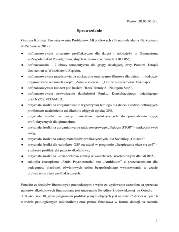 Pszów, 20.03.2013 r. Sprawozdanie Gminna Komisja Rozwiązywania Problemów Alkoholowych i Przeciwdziałania Narkomanii w Pszowie w 2012 r.: dofinansowywała programy profilaktyczne dla dzieci i młodzieży w Gimnazjum, w Zespole Szkół Ponadgimnazjalnych w Pszowie w ramach XIII DPZ, dofinansowała – 2 obozy terapeutyczne dla grupy działającej przy Poradni Terapii Uzależnień w Wodzisławiu Śląskim, dofinansowywała przedstawienia edukacyjne oraz seanse filmowe dla dzieci i młodzieży organizowane w ramach akcji”, „Zima w mieście” „Lato w mieście” oraz Mikołajek, dofinansowywała koncert pod hasłem ”Rock Trendy 8 - Nałogom Stop”, dofinansowywała prowadzenie działalności Punktu Konsultacyjnego działającego przy NZOZ VITAMED, przyznała środki na zorganizowanie wypoczynku letniego dla dzieci z rodzin dotkniętych problemem uzależnienia od alkoholu objętych opieką OPS, przyznała środki na zakup materiałów dydaktycznych do prowadzenia zajęć profilaktycznych dla gimnazjum, przyznała środki na zorganizowanie rajdu rowerowego „Nałogm STOP” – narkotyki twój wróg, przyznała środki na zakup materiałów profilaktycznych dla Świetlicy „Gniazdo” przyznała środki dla członków OSP na udział w programie „Bezpiecznie chce się żyć” – z zakresu profilaktyki przeciwalkoholowej, przyznała środki na udział członka komisji w warsztatach szkoleniowych dla GKRPA, zakupiła czasopisma „Fenix Psychoterapia” raz „Antidotum” z przeznaczeniem dla pedagogów placówek oświatowych celem bezpośredniego wykorzystania w czasie prowadzenie zajęć profilaktycznych. Ponadto ze środków finansowych pochodzących z wpłat za wydawanie zezwoleń za sprzedaż napojów alkoholowych finansowane jest utrzymanie Świetlicy Środowiskowej na Osiedlu T. Kościuszki 38, gdzie programem profilaktycznym objętych jest na stałe 25 dzieci w tym 16 z rodzin patologicznych (alkoholizm) oraz pomoc finansowa w formie dotacji na zadania 1 realizowane przez Świetlicę Gniazdo i Jadłodajnię działające przy Stowarzyszeniu Pomóżmy Sobie. Skład Gminnej Komisji Rozwiązywania Problemów Alkoholowych i Przeciwdziałania Narkomani w załączniku nr 1, zestawienie wydatków stanowi załącznik Nr 2 do niniejszego sprawozdania. Przeciwdziałanie Narkomanii W tym zakresie realizowano programy profilaktyczne w czasie XIII Dni Promocji Zdrowia prowadząc bezpłatne anonimowe badania na wykrycie wirusa HIV oraz pogadanki i prelekcje w ZSP w Pszowie z psychologiem – „Spotkania z rzeczywistością”. Ponadto podjęto współpracę z Komisariatem Policji w Pszowie i przeprowadzono analizę problemu dot. zagrożenia narkomanią na terenie naszego miasta. W wyniku analizy stwierdzono, że w 2012 roku były prowadzone 4 postępowania przygotowawcze dotyczące posiadania środków odurzających, z czego w jednym przypadku stwierdzono popełnienie przestępstwa posiadania narkotyków przez mieszkańca Pszowa. Nie odnotowano przypadków handlu środkami odurzającymi. W ramach codziennej służby patrolowej na terenie miasta były monitorowane miejsca gromadzenia się młodzieży tj dworzec autobusowy, park jordanowski oraz lodowisko. W zakresie przeciwdziałania narkomani na bieżąco prowadzona jest współpraca z dyrektorami i pedagogami szkół z terenu naszego miasta. W 2012 roku zrealizowano n/w programy profilaktyczne: Szkoła Podstawowa nr 1 w Pszowie. Zagadnienia z zakresu profilaktyki były realizowane w roku 2012 w oparciu o Program Profilaktyki Szkoły i Program wychowawczy. 1. "Co to jest nałóg" , „Co wiemy o alkoholu”- uczniowie kl.V 2. "Agresja i przemoc" kl. I 3. "Papierosy – Alkohol - Narkotyki" kl. III 4. "Szkodliwość palenia tytoniu", Znajdź własne rozwiązanie nie pal”, „Zdrowe ciało a nałogi”, ”Co wiemy o narkotykach i innych używkach”, ”Wpływ narkotyków na nasz organizm” kl. VI 2 5. ”Uzależnienia i ich profilaktyka” kl. V Szkoła Podstawowa nr 2 1. Światowy Dzień Rzucania Palenia- ilość uczniów biorących udział w programie: 133wszyscy uczniowie klas I- VI, ilość rodziców- 130 , ilość nauczycieli- wychowawcy klas IVI ( 6), pedagog szkolny, pielęgniarka Osiągnięte cele: Uczniowie znają skutki biernego palenia Uczniowie wiedzą jak zdrowo spędzać czas wolny Uczniowie wiedzą jak reagować jeżeli dorośli przy nich palą Rodzice uczniów są świadomi szkodliwości biernego palenia 2. Światowy Dzień Bez Papierosa- ilość uczniów: 133, ilość nauczycieli- wychowawcy klas I- VI ( 6), pedagog szkolny, pielęgniarka Osiągnięte cele Uczniowie znają niebezpieczeństwa wynikające z nałogu palenia papierosów Uczniowie są asertywni Uczniowie są świadomi, że palenie jest szkodliwe 3. Światowy Dzień Walki z AIDS- ilość uczniów:133, ilość nauczycieli- wychowawcy klas I- VI ( 6), pedagog szkolny, pielęgniarka Osiągnięte cele: Uczniowie znają sposoby zarażenia się AIDS Uczniowie znają skutki choroby Uczniowie znają profilaktykę AIDS Szkoła Podstawowa Nr 3 w Pszowie. Zrealizowano następujące programy edukacyjne i profilaktyczne: program profilaktyczny „Kolorowy Świat” składa się z 6 części, każda część adresowana jest do poszczególnych klas: Cz. I „Moja klasa to ja” kl. I Cz.II „Samodzielniak” kl. II Cz.III „ Rozwiń skrzydła” kl. III Cz. IV „ Kumpel OK.” kl. IV Cz. V „Gadu-gadu”-kl. V Cz. VI „I co dalej szóstoklasisto?”-kl.VI Założeniem programu był rozwój umiejętności społecznych uczniów. Zdobywali oni wiedzę o zagrożeniach jakie niesie Internet, używki, kontakty z nieznajomymi, uczyli się - 3 odpowiedniego zachowania i właściwych relacji z innymi, odkrywali swoje mocne strony i zainteresowania. Uczestnicy programu lepiej się poznali i bardziej się ze sobą integrowali. Od września do grudnia 2012r. w programie uczestniczyli uczniowie klas I-VI (tj. około 166 osób) oraz wychowawcy poszczególnych klas. Realizowan