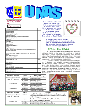 Gazetka SP w Kleosinie Rok szkolny 2013/2014 MAJ W tym numerze: V Konkurs Pieśni Religijnej 1 Sprzątanie świata Promocja zdrowia O jajku… prawie wszystko Baje, bajki, bajeczki W młodym ciele zdrowy duch-igraszki ze zdrowiem Spotkanie z pielęgniarką Dogoterapia 2 Zumba Kids Zdrowa Majówka Kłopoty krasnali Zajęcia w galerii klasy II a Emocje Zajęcia kuglarskie Szkolny Turniej Wiedzy o Zjednoczonym Królestwie Wielkiej Brytanii Wizyta na Politechnice 3 XII Gminny Konkurs Plastyczny "Przyroda wokół nas-co w trawie piszczy" Dzień Matki w przedszkolu Wycieczki klas II, III i IV 4 Kącik papieski. 7 Kalendarium Kącik zoologiczny ABC roślinności co miesiąc u nas gości 8 Bajki naszych rodziców Krzyżówka z hasłem... 9 Kategoria wiekowa Oddziały przedszkolne klasy "O" i klasy I-III Klasy IV-VI Gimnazjum Kategoria wiekowa Oddziały przedszkolne klasy "O" i klasy I-III V Konkurs Pieśni Religijnej odbył się dnia 29 kwietnia 2014 roku. Wzięło w nim udział 110 uczniów z 20 placówek oświatowych. Swoim honorowym patronatem objęli przedsięwzięcie: Jego Ekscelencja Ksiądz Arcybiskup Edward Ozorowski, pan Jerzy Kiszkiel– Podlaski Kurator Oświaty oraz pan Krzysztof Marcinowicz - Wójt Gminy Juchnowiec Kościelny Uczestnicy konkursu zaprezentowali 32 pieśni religijne. Jury V Konkursu Pieśni Religijnej w składzie: Joanna Januszewska, Małgorzata Natalia Trojanowska, Zbigniew Brzozowski, ojciec rektor Feliks Kubicz, ksiądz Anthony Erragudi spośród 24 solistów i 8 zespołów wyłoniło zwycięzców w trzech kategoriach wiekowych: oddziały przedszkolne klasy „0”, I-III, IV – VI, gimnazjum. Jury nie przyznało żadnej nagrody w kategorii zespoły gimnazjum. Przyznało jedno wyróżnienie: Wojciechowi Wasilewskiemu. Miejsce I miejsce II miejsce III miejsce I miejsce II miejsce III miejsce I miejsce II miejsce III miejsce Zwycięzca Aleksandra Domanowska Kornela Zajkowska Magdalena Jurguć Bartosz Skarżyński Katarzyna Bagińska Weronika Dudzińska Agnieszka Wilczewska Ewelina Duchnowska Zuzanna Dworakowska Miejsce I miejsce Zwycięzca Motylki” Niepubliczne Przedszkole nr 6 im. Błogosławionej Bolesławy Lament Białystok oraz Zespół wokalny trzylatków ze SP w Księżynie Zespół w składzie Gabriela Piekut, Wiktoria Piekut SP 14 im K. Pułaskiego Białystok Zespół wokalny Szkoły Podstawowej nr 1 Zespół wokalny Szkoły Podstawowej nr 50 I miejsce Klasy IV-VI Z okazji Twego święta, Mamo życzę Ci zdrowia, sił i codziennej radości wraz ze słowami największej wdzięczności. Za wszystkie dla mnie trudy i starania składam Ci dzisiaj podziękowania. V Konkurs Pieśni Religijnej 5,6 Zielona szkoła klas V i VI Choć serduszko moje małe, Tobie dziś oddaję całe. Byś na zawsze pamiętała I podziękę moją znała. Za to wszystko coś zrobiła, Za to żeś mnie urodziła, I że byłaś mą ostoją, Za to żeś jest matką moją. Ślę życzenia a nie kwiatki Oraz miłość na Dzień Matki. II miejsce III miejsce Sprzątanie świata Baje, bajki, bajeczki Około 200 uczniów z klas IV-VI w dniu 16.04.2014 r. 8.05. 2014 r. w Ośrodbrało udział w sprzątaniu Kleosina. Celem akcji było podkreślenie ku Kultury w Juchnowcu Koznaczenia Światowego Dnia Ziemi, przypadającego na dzień ścielnym odbyły się gminne 22 kwietnia. eliminacje do XXVI Małego Około godziny 12.00 rozpoczęto sprzątanie. Pomimo złej K onku rs u R e c yta t ors ki epogody wszystkim dopisywał dobry humor. Akcja przebiegała go ,,Baje, bajki, bajeczki” orgadość sprawnie, gdyż uczniowie mocno się zaangażowali w pracę. nizowanego przez Wojewódzki Każdy dostał po dwie rękawiczki oraz worek. Nikt nie stał obojętOśrodek Animacji Kultury nie, ponieważ było dużo śmieci do sprzątania. Zebrano między w Białymstoku. innymi: torebki foliowe, opony, butelki plastikowe oraz szklane, W kategorii klas I-III zwyciężyła uczennica naszej puszki, ubrania. W ustalonym miejscu pozostawiono pełne worki szkoły Sandra Dominkiewicz, a w kategorii IV-VI Karolina Graw celu późniejszego wywiezienia ich na wysypisko śmieci. bowska. Obie dziewczynki będą reprezentowały nasza gminę w O godzinie 13.00 wróciliśmy do szkoły. konkursie wojewódzkim. To była kolejna lekcja, jak dbać o środowisko, które nas otacza. W młodym ciele zdrowy duch - igraszki ze zdrowiem Grupa Leśne ludki uczestniczy w projekcie „W młodym ciele zdrowy duch – igraszki ze zdrowiem” organizowanym przez Bibliotekę Publiczną w Kleosinie. Celem projektu jest wspieranie i rozwój zdrowego stylu życia wśród najmłodszych. Dzieci nauczą się świadomie dbać o własne zdrowie, poznają działania prozdrowotne i proekologiczne. Kolejnym celem jest rozwijanie aktywności poznawczej poprzez stosowanie technik twórczego myślenia oraz wykorzystanie dziecięcej ekspresji. Spotkanie z pielęgniarką Promocja zdrowia 23 kwietnia 2014 r. był dniem poświęconym promocji zdrowia. Uczniowie klasy I c przedsta wili s połecznoś ci szkolnej inscenizację teatralną o tematyce profilaktyczno - ekologicznej pt. „Chroniąc środowisko, dbam o swoje zdrowie”. Następnie pani Beata Klimczuk w ramach realizacji programu „Nie pal przy mnie, proszę”, wygłosiła referat poparty prezentacją multimedialną. O jajku… prawie wszystko Uczniowie z Koła Przyrodniczego oraz Koła Aktywności Twórczej Ucznia obejrzeli ekspozycję jaj w Uniwersyteckim Centrum Przyrodniczym. Różniły się wielkością i kolorystyką. Szczególną ciekawość wzbudziła wierna replika jaja dinozaura. Str. 2 Grupa Leśne ludki spotkała się z panią pielęgniarką, która pracuje w naszej szkole. Podczas spotkania pani pielęgniarka uświadomiła bardzo wiele ważnych spraw. Zwróciła uwagę na to, że dzieci nie mogą sięgać same po lekarstwa oraz rożnego rodzaju środki chemiczne, bo grozi to zatruciem. Podkreślała, również, że pyszne i słodkie witaminki to nie cukierki i nie można ich zażywać ile się