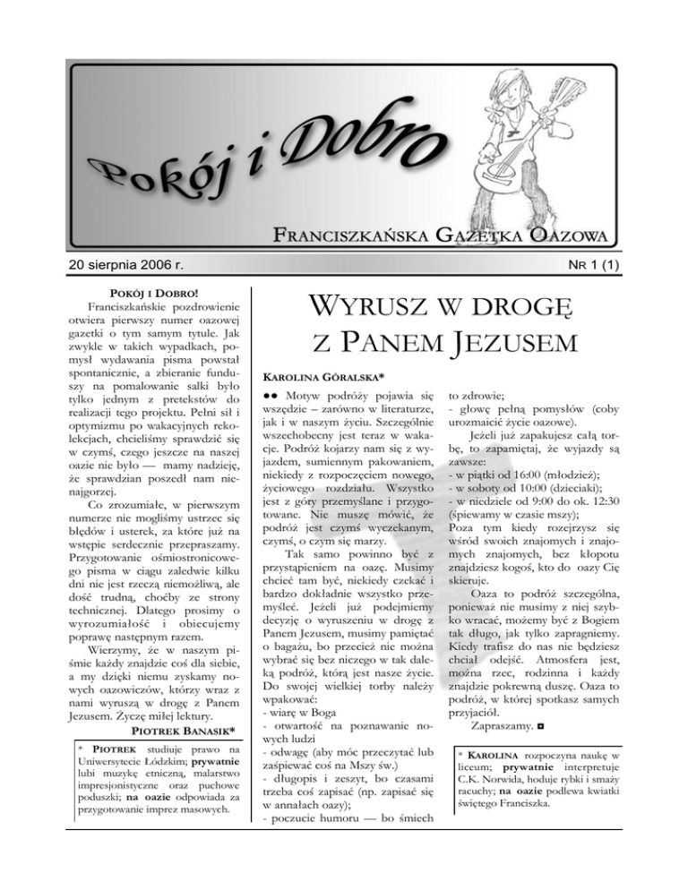 20 sierpnia 2006 r. POKÓJ I DOBRO! Franciszkańskie pozdrowienie otwiera pierwszy numer oazowej gazetki o tym samym tytule. Jak zwykle w takich wypadkach, pomysł wydawania pisma powstał spontanicznie, a zbieranie funduszy na pomalowanie salki było tylko jednym z pretekstów do realizacji tego projektu. Pełni sił i optymizmu po wakacyjnych rekolekcjach, chcieliśmy sprawdzić się w czymś, czego jeszcze na naszej oazie nie było — mamy nadzieję, że sprawdzian poszedł nam nienajgorzej. Co zrozumiałe, w pierwszym numerze nie mogliśmy ustrzec się błędów i usterek, za które już na wstępie serdecznie przepraszamy. Przygotowanie ośmiostronicowego pisma w ciągu zaledwie kilku dni nie jest rzeczą niemożliwą, ale dość trudną, choćby ze strony technicznej. Dlatego prosimy o wyrozumiałość i obiecujemy poprawę następnym razem. Wierzymy, że w naszym piśmie każdy znajdzie coś dla siebie, a my dzięki niemu zyskamy nowych oazowiczów, którzy wraz z nami wyruszą w drogę z Panem Jezusem. Życzę miłej lektury. PIOTREK BANASIK* * PIOTREK studiuje prawo na Uniwersytecie Łódzkim; prywatnie lubi muzykę etniczną, malarstwo impresjonistyczne oraz puchowe poduszki; na oazie odpowiada za przygotowanie imprez masowych. NR 1 (1) WYRUSZ W DROGĘ Z PANEM JEZUSEM KAROLINA GÓRALSKA* ●● Motyw podróży pojawia się wszędzie – zarówno w literaturze, jak i w naszym życiu. Szczególnie wszechobecny jest teraz w wakacje. Podróż kojarzy nam się z wyjazdem, sumiennym pakowaniem, niekiedy z rozpoczęciem nowego, życiowego rozdziału. Wszystko jest z góry przemyślane i przygotowane. Nie muszę mówić, że podróż jest czymś wyczekanym, czymś, o czym się marzy. Tak samo powinno być z przystąpieniem na oazę. Musimy chcieć tam być, niekiedy czekać i bardzo dokładnie wszystko przemyśleć. Jeżeli już podejmiemy decyzję o wyruszeniu w drogę z Panem Jezusem, musimy pamiętać o bagażu, bo przecież nie można wybrać się bez niczego w tak daleką podróż, którą jest nasze życie. Do swojej wielkiej torby należy wpakować: - wiarę w Boga - otwartość na poznawanie nowych ludzi - odwagę (aby móc przeczytać lub zaśpiewać coś na Mszy św.) - długopis i zeszyt, bo czasami trzeba coś zapisać (np. zapisać się w annałach oazy); - poczucie humoru — bo śmiech to zdrowie; - głowę pełną pomysłów (coby urozmaicić życie oazowe). Jeżeli już zapakujesz całą torbę, to zapamiętaj, że wyjazdy są zawsze: - w piątki od 16:00 (młodzież); - w soboty od 10:00 (dzieciaki); - w niedziele od 9:00 do ok. 12:30 (śpiewamy w czasie mszy); Poza tym kiedy rozejrzysz się wśród swoich znajomych i znajomych znajomych, bez kłopotu znajdziesz kogoś, kto do oazy Cię skieruje. Oaza to podróż szczególna, ponieważ nie musimy z niej szybko wracać, możemy być z Bogiem tak długo, jak tylko zapragniemy. Kiedy trafisz do nas nie będziesz chciał odejść. Atmosfera jest, można rzec, rodzinna i każdy znajdzie pokrewną duszę. Oaza to podróż, w której spotkasz samych przyjaciół. Zapraszamy. ◘ * KAROLINA rozpoczyna naukę w liceum; prywatnie interpretuje C.K. Norwida, hoduje rybki i smaży racuchy; na oazie podlewa kwiatki świętego Franciszka. 2 KIM JESTEŚMY? To pytanie, na które chyba najtrudniej odpowiedzieć, bo nie da się w kilku słowach scharakteryzować naszej wspólnoty. Każdy z nas jest inny, jedyny w swoim rodzaju i niepowtarzalny, każdy wnosi do oazy cząstkę siebie – cząstkę, której nie może zabraknąć. Jak mówią słowa piosenki – nikt nie ma z nas tego, co mamy razem, kiedy każdy wnosi z sobą to, co ma najlepszego. Choć mamy różne charaktery, różni nas wiek, zainteresowania i poglądy, to połączyła nas miłość do Boga. I jeśli nawet mówi się, że każdy sam pracuje na swoją wieczność, to my pracujemy razem dla każdego z nas – bo w grupie łatwiej. ◘ CO ROBIMY? Poprzez wspólną modlitwę i śpiew urozmaicamy msze święte i nabożeństwa w naszym klasztorze, co każdy może zobaczyć i usłyszeć. W ciągu całego roku (oprócz wakacji) raz w tygodniu odbywają się spotkania formacyjne w małych grupach, na których przez dyskusję próbujemy poznać Boga i zbliżyć się do Niego. W zależności od poziomu wiedzy i wieku, każdy uczestniczy w spotkaniach formacyjnych na swoim poziomie. Przy naszym klasztorze działa również Oaza Dzieci Bożych, która jest niejako wstępem do starszej oazy. W ODB spotykają się dzieci ze szkoły podstawowej, zaś w FMO uczestniczy młodzież gimnazjalna i ponadgimnazjalna, a także studenci. ◘ KRZYSIEK ŁĘCKI*, PIOTREK BANASIK MODLITWA Oaza to nie tylko śpiew, spotkania, uczestnictwo we mszy świętej czy w nabożeństwach – często spotykamy się na wspólnej modlitwie przy adoracji Najświętszego Sakramentu czy przy modlitwie różańcowej. Swoistym rodzajem modlitwy są koncerty i spektakle, które gramy w naszym kościele. Organizujemy też wyjazdy do świątyń bernardyńskich w całej Polsce, by tam modlić się w swoich intencjach. ◘ FRANCISZKAŃSKA MŁODZIEŻ OAZOWA SPORT Na to hasło wypadałoby poświęcić odrębną stronę, bo znajduje się on w naszym życiu dość blisko Boga. I nie mówimy tutaj tylko o umiłowaniu sportu przez oglądanie go w telewizji – oazowicze chętnie grają, skaczą, pływają i biegają na różnych sportowych arenach. Dość wspomnieć o turnieju halowej piłki nożnej o Puchar Biskupa Łowickiego, który w debiutanckim sezonie zakończył się całkiem dobrym – piątym miejscem (na trzydzieści kilka drużyn z całej diecezji). Oprócz tego niemal co niedziela gramy w piłkę na trawie (bądź błocie czy śniegu, w zależności od pogody), a tradycją stały się nasze mecze po niedzielnym śniadaniu wielkanocnym, gdy każdą strzeloną bramkę należy uczcić PO GODZINACH… głośnym „Alleluja!”. Oazowe dziewczęta Oaza to nie tylko modlitwa i praca, ale również grupa dobrych nie ogr