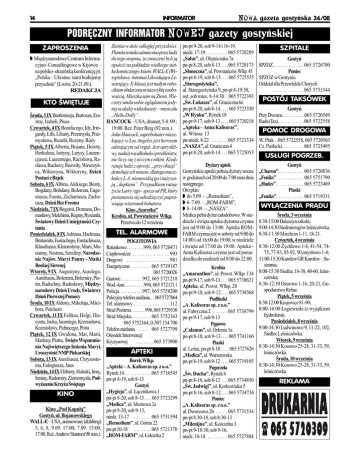 14 INFORMATOR NOWA gazeta gostyñska 36/08 PODRÊCZNY INFORMATOR NOWEJ gazety gostyñskiej ZAPROSZENIA w Miêdzynarodowe Centrum InformacyjnoConsultingowe w Kijowie na polskoukraiñsk¹ konferencjê pt. Polska Ukraina: sami budujemy przysz³oæ (Lwów, 20-21.09.). REDAKCJA KTO WIÊTUJE roda, 3 IX Bart³omieja, Bartosza, Erazmy, Izabeli, Piusa Czwartek, 4 IX Bonifacego, Idy, Irmgardy, Lilii, Liliany, Przemys³a, Przemys³awa, Rozalii, Rozyny, Ró¿y Pi¹tek, 5 IX Alberta, Bojana, Doroty, Herkulesa, Justyny, Larysy, Laurencjusza, Laurentego, Racis³awa, Rac³awa, Rac³awy, Rozwity, Wawrzyñca, Wiktoryna, Wiktoryny, Dzieñ Postaci z Bajek Sobota, 6 IX Albina, Aleksego, Beaty, Bogdany, Bohdany, Bolemira, Eugeniusza, Fausta, Zachariasza, Zacheusza, Dzieñ Bez Freonu Niedziela, 7 IX Begonii, Domana, Domas³awy, Melchiora, Reginy, Ryszarda, wiatowy Dzieñ Umiejêtnoci Czytania Poniedzia³ek, 8 IX Adriana, Hadriana, Bratumi³a, Eustachego, Eustachiusza, Klaudiusza, Klementyny, Marii, Marianny, Nestora, Serafiny, Narodzenie Najw. Maryi Panny - Matki Boskiej Siewnej Wtorek, 9 IX Augustyny, Aurelego, Aureliusza, Bolemira, Bolemiry, Piotra, Radochny, Rados³awy, Miêdzynarodowy Dzieñ Urody, wiatowy Dzieñ Pierwszej Pomocy roda, 10 IX Aldony, Miko³aja, Mcibora, Pulcherii Czwartek, 11 IX Feliksa, Helgi, Hiacynta, Jacka, Jacentego, Krzesis³awa, Krzesis³awy, Pafnucego, Prota Pi¹tek, 12 IX Gwidona, Mai, Marii, Marleny, Piotra, wiêto Wspomnienia Najwiêtszego Imienia Maryi, Uroczystoæ NMP Piekarskiej Sobota, 13 IX Aureliusza, Chryzostoma, Eulogiusza, Jana Niedziela, 14 IX El¿biety, Halszki, Irmy, Irminy, Radomiry, Ziemomys³a, Podwy¿szenie Krzy¿a wiêtego Ziemia w doæ odleg³ej przysz³oci. Planeta zosta³a zamiecona przez ludzi do tego stopnia, ¿e zmuszeni byli j¹ opuciæ na pok³adzie wielkiego statku kosmicznego Axiom. WALL-E (Wysypiskowy Automat Likwiduj¹co Lewaruj¹cy. E-klasa) jest ma³ym robocikiem obdarzonym niezwyk³¹ osobowoci¹. Mieszka sam na Ziemi. Wieczory umila sobie ogl¹daniem jedynej ocala³ej wideokasety musicalu Hello Dolly. HANCOCK USA, dramat, 5-8. 09.; 19:00. Re¿. Peter Berg (92 min.). John Hancock, superbohater mieszkaj¹cy w Los Angeles jest herosem odstaj¹cym od regu³. Jest opryskliwy, nadu¿ywa alkoholu i przekleñstw, nie liczy siê z niczym i nikim. Kiedy ratuje ludzi z opresji, przy okazji demoluje ich miasto, dlatego mieszkañcy L.A. nienawidz¹ go i nazywaj¹ dupkiem. Przypadkiem ratuje ¿ycie Larryego - speca od PR, który postanawia siê odwdziêczyæ poprawiaj¹c wizerunek bohatera. Kino Szarotka Krobia, ul. Powstañców Wlkp. Przerwa do 12 wrzenia pn-pt 9-20, sob 9-14 i 16-19, niedz. 17-19. . . . . . . . . . 065 5720289 Salus, ul. Olejniczaka 7a pn-pt 8-20, sob 8-13. . . .065 5720173 S³oneczna, ul. Powstañców Wlkp. 45 pn-pt 8-19, sob 8-13. . . . 065 5725555 Starogostyñska, ul. Starogostyñska 9, pn-pt 8-19:30, ost. sob mies. 8-14:30. . 065 5722393 w. £ukasza, ul. Graniczna 6e pn-pt 8-20, sob 8-14 . . . . 065 5723350 W Rynku, Rynek 18 pn-pt 9-17, sob 9-13 . . . . 065 5720218 Apteka Anna Kalisoras, ul. Witosa 13 pn-niedz. 8-22 . . . . . . .065 5723334 NASZA, ul. Graniczna 4 pn-pt 8-20, sob 8-14 . . . 065 5725053 Dy¿ury aptek Gostyñskie apteki pe³ni¹ dy¿ury nocne w godzinach od 20:00 do 7:00 rano dnia nastêpnego. Oto plan: w do 5.09. Remedium, w 67.09. ROM-FARM, w 814.09. NASZA. Medica pe³ni dy¿ur ca³odobowo. W niedziele i wiêta apteka dy¿urna czynna jest od 9:00 do 13:00. Apteka ROMTEL. ALARMOWE FARM czynna jest w soboty od 9:00 do 14:00 i od 16:00 do 19:00, w niedziele POGOTOWIA Ratunkowe. . . . . . . . .999, 065 5720471 i wiêta od 17:00 do 19:00. Apteka Ciep³ownicze . . . . . . . . . . . . . . 993 Anna Kalisoras czynna jest od ponieDrogowe . . . . . . . . . . . . . . . . 981 dzia³ku do niedzieli od 8:00 do 22:00. Energetyczne . . . . . . . 065 5739187 Krobia 065 5720026 Amaranthus, ul. Powst. Wlkp. 134 Gazowe. . . . . . . . . . 992, 065 5721218 pn-pt 9-17, sob 9-13 . . . 065 5738621 Wod.-kan.. . . . . . . . . .994, 065 5721211 Apteka, ul. Powst. Wlkp. 28 Policja. . . . . . . . . . .997, 065 5758200 pn-pt 9-18, sob 9-12. . . . 065 5738568 Policyjny telefon zaufania. . . 065 5727864 Pudliszki Tel. alarmowy . . . . . . . . . . . . . .112 A. Kalisoras sp. z o.o. Stra¿ Po¿arna. . . . . . . . 998, 065 5729530 ul. Fabryczna 2 . . . . . . 065 5738799 Stra¿ Miejska. . . . . . . . 065 5752163 pn-pt 9-17, sob 9-13 065 5752164, 0-507 154 706 Pêpowo Telefon zaufania . . . . . 065 5727799 Calamus, ul. Or³onia 1a Orodek Interwencji pn-pt 8-18, sob 9-13. . . . 065 5741166 Kryzysowej . . . . . . . 065 573900 Piaski ul. Lena, pn-pt 8-18. . . . . 065 5727626 APTEKI Medica, ul. Warszawska Borek Wlkp. pn-pt 8-19, sob 9-12 . . . . 065 5719105 Apteki A. Kalisoras sp. z o.o. Pogorzela Rynek 14 . . . . . . . . . . .065 5716545 w. Ducha, Rynek 6 pn-pt 8-19, sob 8-13 pn-pt 8-18, sob 8-12 . . .065 5734850 Gostyñ w. Jadwigi, ul. Kotkowiaka 5 Hygieja, ul. £¹cznikowa 1 pn-pt 8-16, sob 8-12. . . . 065 5734734 KINO pn-pt 8-20, sob 8-13 . . . 065 5723299 Poniec Medica, ul. Mostowa 2a A. Kalisoras sp. z o.o. Kino Pod Kopu³¹ pn-pt 8-20, sob 9-13, ul. Dworcowa 2b. . . . . . 065 5731534 Gostyñ, ul. Bojanowskiego niedz. 13-17 . . . . . . . 065 5751594 pn-pt 8:30-18, sob 8:30-13 WALL-E USA, animowany (dubbing) Remedium, ul. Górna 22 Milenijna, ul. Kocielna 3 5, 6, 8, 9.09. 17:00; 7.09. 15:00, pn-pt 10-18 . . . . . . . 065 5721370 pn-pt 9-18:30, sob 9-16, 17:00. Re¿. Andrew Stanton (98 min.). ROM-FARM, ul. £okietka 2 niedz. 10-14 . . . . . . . . 065 5727804 SZPITALE Gostyñ SPZOZ. . . . . . . . . . . . 065 5726700 Poniec SPZOZ w Gostyniu Oddzia³ dla Przewlekle Chorych . . . . . . . . . . . . 065 5731544 POSTÓJ TAKSÓWEK Gostyñ Przy Dworcu. . . . . . . . . .065 5720549 RadioTaxi. . . . . . . . . . .065 5722558 POMOC DROGOWA W. Ptak . .065 5722558, 065 5720563 Cz. Pulecki. . . . . . . . . 065 5725495 US£UGI POGRZEB. Gostyñ Charon. . . . . . . . . . . 065 57