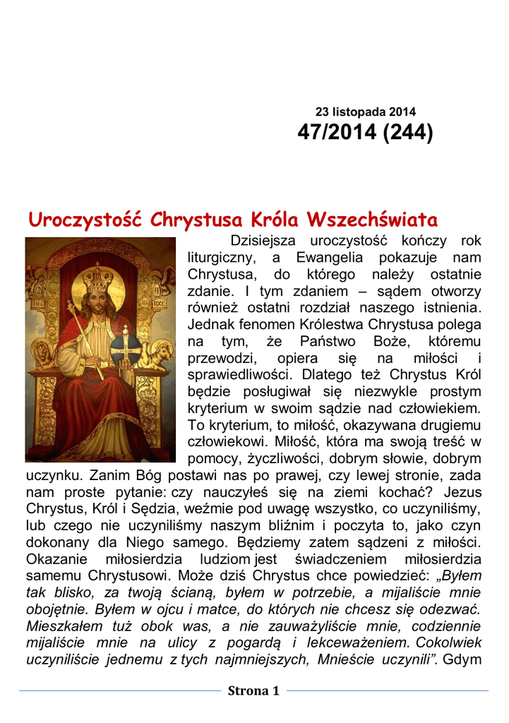 23 listopada 2014 47/2014 (244) Uroczystość Chrystusa Króla Wszechświata Dzisiejsza uroczystość kończy rok liturgiczny, a Ewangelia pokazuje nam Chrystusa, do którego należy ostatnie zdanie. I tym zdaniem – sądem otworzy również ostatni rozdział naszego istnienia. Jednak fenomen Królestwa Chrystusa polega na tym, że Państwo Boże, któremu przewodzi, opiera się na miłości i sprawiedliwości. Dlatego też Chrystus Król będzie posługiwał się niezwykle prostym kryterium w swoim sądzie nad człowiekiem. To kryterium, to miłość, okazywana drugiemu człowiekowi. Miłość, która ma swoją treść w pomocy, życzliwości, dobrym słowie, dobrym uczynku. Zanim Bóg postawi nas po prawej, czy lewej stronie, zada nam proste pytanie: czy nauczyłeś się na ziemi kochać? Jezus Chrystus, Król i Sędzia, weźmie pod uwagę wszystko, co uczyniliśmy, lub czego nie uczyniliśmy naszym bliźnim i poczyta to, jako czyn dokonany dla Niego samego. Będziemy zatem sądzeni z miłości. Okazanie miłosierdzia ludziom jest świadczeniem miłosierdzia samemu Chrystusowi. Może dziś Chrystus chce powiedzieć: „Byłem tak blisko, za twoją ścianą, byłem w potrzebie, a mijaliście mnie obojętnie. Byłem w ojcu i matce, do których nie chcesz się odezwać. Mieszkałem tuż obok was, a nie zauważyliście mnie, codziennie mijaliście mnie na ulicy z pogardą i lekceważeniem. Cokolwiek uczyniliście jednemu z tych najmniejszych, Mnieście uczynili”. Gdym Strona 1 Tabor wiedział, że to Ty… Chrystus także i dziś chodzi wśród nas. Zagląda do naszych mieszkań, domów. Tylko my nieraz szukamy tego Pana Jezusa, takiego ładnego, jak z obrazka. Długa biała szata, piękne włosy, taki śliczny Pan Jezus. A On przychodzi w drugim człowieku. I może kiedyś nam odpowie: byłem u ciebie, ale ty najpierw poszczułeś Mnie psami, a potem przepędziłeś… ~~*~~ Wspomnienie świętej Cecylii Cecylia była olśniewająco piękna. Była też bogata - pochodziła ze znakomitej rzymskiej rodziny. Była utalentowana, czuła i współczująca. Jako młoda dziewczyna zakochała się w Jezusie Chrystusie. Oczywiście o tym nie mówiła nikomu, rodzicom również nie zwierzyła się z własnej namiętności. Modląc się, ślubowała Jezusowi wierność bez względu na wszystko. Nieświadomi niczego rodzice przeznaczyli córkę dobrze urodzonemu rzymskiemu chłopcu Walerianowi. Cecylia była prawą dziewczyną i nie zamierzała narzeczonego okłamywać, toteż przed ślubem wyznała skrywaną przed ludźmi tajemnicę. Walerian okazał się wspaniałym człowiekiem i uszanował ślub czystości. Przekonał się również sam, a potem przekonał swojego brata do tego, co o wierze, o zbawieniu wiecznym i o Jezusie opowiadała poślubiona Cecylia. Uwierzywszy, przyjął chrzest z rąk papieża św. Urbana. Chrzest przyjął także jego brat. Niestety, nie były to spokojne dla Rzymu lata. Krwawe prześladowania chrześcijan wybuchały co jakiś czas. Kwitło płatne donosicielstwo. Cecylię, jej męża i szwagra skazano na śmierć. Żołnierze, którzy przyszli, by ją aresztować, byli pod tak wielkim wrażeniem jej urody, że błagali ją uniżenie, iżby odstąpiła od wiary, a wówczas zostanie ocalona. Cecylia nie bała się, mocno wierzyła w życie po śmierci i baz wahania odpowiedziała żołnierzom: „Umrzeć nie znaczy stracić swą młodość, lecz zamienić ją na lepszą. Jest to tak, jakby oddać błoto w zamian za złoto. Mój Pan daje stokroć więcej, niż Mu się ofiaruje”. Rozwścieczyło to żołnierzy i dlatego zginęła okrutną śmiercią na przełomie II i III wieku. Historia jej męczeństwa, Strona 2 23 listopada 2014 powtarzana z szacunkiem dla tej bohaterskiej postawy młodej, pięknej dziewczyny obrosła przez wieki pobożną legendą. Św. Cecylia stała się jedną z najbardziej czczonych rzymskich męczennic. W życiu Cecylii i w tworzonej po jej śmierci hagiografii zetknęły się trzy żywioły: miłość, śmierć i piękno. Do tej triady znacznie później dodana została muzyka. Może dlatego, że ku chwale Boga Cecylia „wyśpiewała” swoim życiem najpiękniejszą z pieśni, jaką możemy ofiarować Panu. Kochając wierzyła, wierząc pracowała nad udoskonaleniem siebie i innych, udoskonalając, cieszyła się, a gdy pojawiał się smutek i w nim znajdowała wartość. Szybciej od innych dojrzała do pełnego człowieczeństwa w Panu. ~~*~~ OGŁOSZENIA DUSZPASTERSKIE NIEDZIELA CHRYSTUSA KRÓLA 1.W tym tygodniu w liturgii Kościoła przeżywamy wspomnienie: w poniedziałek – św. męczenników Andrzeja Dung Lac i towarzyszy we wtorek- św. Katarzyny Aleksandryjskiej, dziewicy, męczennicy 2. Różaniec z wypominkami naszych bliskich zmarłych codziennie o 17.30, a w niedzielę o godz. 17.30 - Nieszpory za zmarłych. 3. We wtorek po wieczornej Mszy św. odbędzie się próba chóru. 4. W piątek po Mszy św. wieczornej – katecheza dla dorosłych 5. Relikwie św. Jana Pawła II – przyjmują mieszkańcy ul. Okrężnej i Lipowej. 6. Przed II Niedzielą Adwentu (od 5 grudnia) rozpoczną się w naszej parafii rekolekcje adwentowe, które wygłosi Ks. Tadeusz Dobrowolski SDS. Prosimy przed rekolekcjami przeczytać Księgę Rut (najkrótsza w Piśmie Św.) 7. Dzisiejsze ofiary na tacę będą przeznaczone na organizację ŚDM w Krakowie w 2016 roku. –––––––––––––––––––––––––––––– Dziękuję za wszelkie ofiary, pracę i troskę o nasz kościół i życzę Wam wszystkim Bożego błogosławieństwa –––––––––––––––––––––––––––––– Strona 3 Tabor INTENCJE MSZALNE (24 listopada – 30 listopada 2014 r.) Poniedziałek, 24 listopada 7.30 Za zmarłego Kazimierza Połajdowicza (30 dni po śmierci) oraz ś.p. Kazimierza Połajdowicza (ojca) 18.00 Za zmarłego Kazimierza Połajdowicza (30 dni po śmierci) oraz ś.p. Kazimierza Połajdo