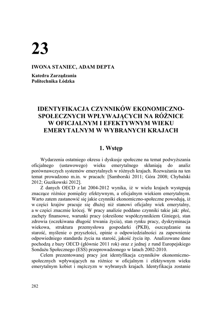 WSPÓŁCZESNE ZABEZPIECZENIE EMERYTALNE. WYBRANE ASPEKTY … 23 IWONA STANIEC, ADAM DEPTA Katedra Zarządzania Politechnika Łódzka IDENTYFIKACJA CZYNNIKÓW EKONOMICZNOSPOŁECZNYCH WPŁYWAJĄCYCH NA RÓŻNICE W OFICJALNYM I EFEKTYWNYM WIEKU EMERYTALNYM W WYBRANYCH KRAJACH 1. Wstęp Wydarzenia ostatniego okresu i dyskusje społeczne na temat podwyższania oficjalnego (ustawowego) wieku emerytalnego skłaniają do analiz porównawczych systemów emerytalnych w różnych krajach. Rozważania na ten temat prowadzono m.in. w pracach: [Samborski 2011; Góra 2008; Chybalski 2012; Guzikowski 2012]. Z danych OECD z lat 2004-2012 wynika, iż w wielu krajach występują znaczące różnice pomiędzy efektywnym, a oficjalnym wiekiem emerytalnym. Warto zatem zastanowić się jakie czynniki ekonomiczno-społeczne powodują, iż w części krajów pracuje się dłużej niż stanowi oficjalny wiek emerytalny, a w części znacznie krócej. W pracy analizie poddano czynniki takie jak: płeć, zachęty finansowe, warunki pracy (określone współczynnikiem Giniego), stan zdrowia (oczekiwana długość trwania życia), stan rynku pracy, dyskryminacja wiekowa, struktura przemysłowa gospodarki (PKB), oszczędzanie na starość, myślenie o przyszłości, opinie o odpowiedzialności za zapewnienie odpowiedniego standardu życia na starość, jakość życia itp. Analizowane dane pochodzą z bazy OECD (głównie 2011 rok) oraz z jednej z rund Europejskiego Sondażu Społecznego (ESS) przeprowadzonego w latach 2002-2010. Celem prezentowanej pracy jest identyfikacja czynników ekonomicznospołecznych wpływających na różnice w oficjalnym i efektywnym wieku emerytalnym kobiet i mężczyzn w wybranych krajach. Identyfikacja zostanie 282 CZĘŚĆ III. WIEK I DEMOGRAFIA A ZABEZPIECZENIE EMERYTALNE przeprowadzona z wykorzystaniem analizy opisowej, w oparciu o korelacje ekologiczne1 [Robinson 1950, s. 351-357]. 2. Determinanty różnic w oficjalnym i efektywnym wieku emerytalnym Czynniki wpływające na różnice w oficjalnym i efektywnym wieku emerytalnym w poszczególnych krajach europejskich z teoretycznego punktu widzenia powinny być związane z wydłużaniem aktywności zawodowej, zaistnieniem dezaktywizacji zawodowej, wiekiem, w którym następuje dezaktywizacja, czynnikami wpływającymi na moment dezaktywizacji oraz charakterystyką jakości życia [Góra 2008, s. 71-77]. Jak wskazują raporty KNF różnice w oficjalnym i efektywnym wieku emerytalnym wynikają z podnoszenia wieku emerytalnego oraz wydłużania się oczekiwanej długości trwania życia. Warto w tym miejscu zastanowić się nad tym, jakie czynniki powodują te różnice. Istnieje wiele dowodów na to, iż kluczowe znaczenie mają tutaj zachęty finansowe, stanowiące integralną część systemu emerytalnego. Jeżeli przepisy prawa umożliwiają przechodzenie na wcześniejszą emeryturę, zapewniając przy tym odpowiednie uposażenie, wiele osób korzysta z takiej możliwości. Z punktu widzenia systemu emerytalnego zachęty finansowe powinny raczej skłaniać do pracy ponad oficjalny wiek emerytalny, a nie faworyzować osoby przechodzące na wcześniejsze emerytury, a właściwie dobrane zachęty finansowe istotne są zarówno z punktu widzenia efektywności ekonomicznej, jak i sprawiedliwości społecznej [Samborski 2011, s. 33]. Według M. Guzikowskiego, w Polsce w 2060 roku liczebność populacji w wieku powyżej 65 lat będzie stanowiła ponad 60% populacji osób w wieku produkcyjnym [Guzikowski 2012]. Co oznacza, że Polska znajdować się będzie w pierwszej trójce krajów, w których starzenie demograficzne będzie najbardziej widoczne i w znaczący sposób – przy braku zwiększenia podaży pracy – osłabi tempo wzrostu gospodarczego. Nieznacznie gorsza sytuacja będzie obserwowana jedynie w Rumunii i na Łotwie. Starzenie demograficzne znajdzie również swoje odzwierciedlenie we wzroście współczynnika obciążenia ekonomicznego (relacji ogółu osób niepracujących w wieku powyżej 65 lat do ogółu osób pracujących w wieku produkcyjnym) z 31 do 99%. W związku ze zwiększaniem się w całej UE tych wskaźników dostrzeżono konieczność podnoszenia oficjalnego wieku emerytalnego i ten kierunek wybrała większość 1 Korelacje ekologiczne wybrano ze względu na pomiar oficjalnego i efektywnego wieku tylko na poziomie krajowym. Przy ich wykorzystaniu błędne jest wnioskowanie o badanych czynnikach na poziomie indywidualnym, a nie krajowym, ze względu na korelacje między danymi opisującymi własności krajowe [Kocór M. 2006, s. 75-103]. 283 WSPÓŁCZESNE ZABEZPIECZENIE EMERYTALNE. WYBRANE ASPEKTY … krajów członkowskich UE, w tym Polska, różnice dotyczą jednak tempa podnoszenia wieku oficjalnego, które wynosi od dwóch do sześciu miesięcy rocznie. Z analiz społecznych wynika, że zachęty do pracy ponad oficjalny wiek emerytalny nie stanowią jedynego wyjaśnienia różnic w oficjalnym i efektywnym wieku emerytalnym w poszczególnych krajach. Istotne znaczenie mają warunki pracy, stan zdrowia poszczególnych grup zawodowych, czy też pojedynczych osób. Czyli czynniki, takie jak warunki makroekonomiczne, stan rynku pracy, dyskryminacja wiekowa, struktura przemysłowa gospodarki są równie istotne. Ważne są również programy ukierunkowane na pomoc pracownikom starszym2. Warto zauważyć, że badania empiryczne pokazują, iż praca osób starych i młodych nie jest względem siebie całkowicie (lub w wysokim stopniu) wymienna (substytucyjna). Z analiz gospodarczych wynika, że przyczyn wydłużenia efektywnego wieku emerytalnego należy upatrywać przede wszystkim w postępie technologicznym, w ochronie zdrowia (wyraźnej poprawie stanu zdrowia społeczeństwa) oraz wydłużaniu się oczekiwanej długości życia. Zatem w zależności od postrzegania różnic w oficjalnym i efektywnym wieku emerytalnym można wymieniać nieskończenie wiele czynników na nie wpływających. Aby uniknąć w badaniach 
