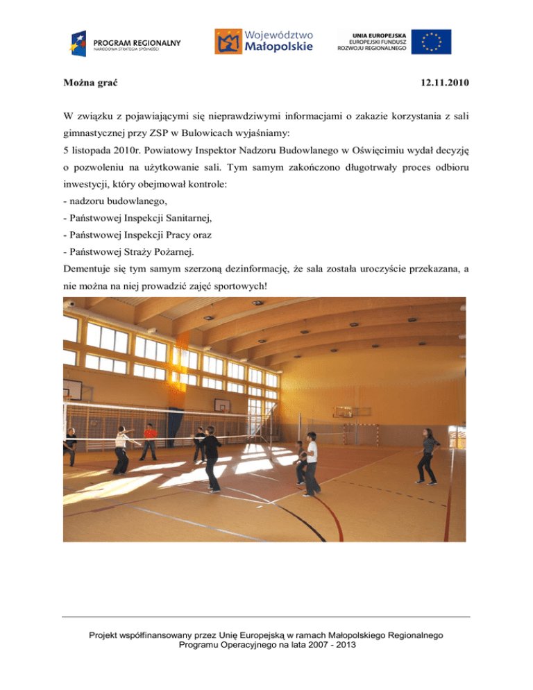 Mo na gra 12.11.2010 W zwi zku z pojawiaj cymi si nieprawdziwymi informacjami o zakazie korzystania z sali gimnastycznej przy ZSP w Bulowicach wyja niamy: 5 listopada 2010r. Powiatowy Inspektor Nadzoru Budowlanego w O wi cimiu wyda decyzj o pozwoleniu na u ytkowanie sali. Tym samym zako czono d ugotrwa y proces odbioru inwestycji, który obejmowa kontrole: - nadzoru budowlanego, - Pa stwowej Inspekcji Sanitarnej, - Pa stwowej Inspekcji Pracy oraz - Pa stwowej Stra y Po arnej. Dementuje si tym samym szerzon dezinformacj , e sala zosta a uroczy cie przekazana, a nie mo na na niej prowadzi zaj sportowych! Projekt wspó finansowany przez Uni Europejsk w ramach Ma opolskiego Regionalnego Programu Operacyjnego na lata 2007 - 2013 Najwi ksza w powiecie 27.10.2010 27 pa dziernika 2010 roku na trwale wpisa si w najnowsz histori Bulowic. Tego dnia oddano do u ytku najwi ksza w powiecie sale gimnastyczn powsta przy szkole podstawowej i gimnazjum. Nic dziwnego, e w uroczysto ciach wzi o udzia liczne grono zaproszonych go ci. Wymie my tylko ks. bp Tadeusza Rakoczego - Ordynariusza Diecezji Bielsko- ywieckiej, Romana Olejarza – Burmistrza Gminy K ty, Józefa Skudlarskiego - Przewodnicz cego Rady Miejskiej w K tach oraz dyrektorów gminnych szkó , radnych, delegatów organizacji spo ecznych w Bulowicach licznie uczestniczyli te mieszka cy Bulowic oraz komplet dzieci i m odzie y z ZSP w Bulowicach. Projekt wspó finansowany przez Uni Europejsk w ramach Ma opolskiego Regionalnego Programu Operacyjnego na lata 2007 - 2013 Uroczysto ci rozpocz a msza wi ta po której wszyscy ruszyli do ZSP w Bulowicach gdzie now sal po wi ci ks. bp Tadeusz Rakoczy. Podkre li On trud i determinacj osób zaanga owanych w budow sali – w adz gminnych, so eckich i szkolnych oraz w adzom województwa za przyznanie dotacji. Zaproszeni go cie wyrazili przekonanie, e nowa sala dobrze spe ni swoje zadania s c nie tylko uczniom, ale równie mieszka com so ectwa. Burmistrz Roman Olejarz podkre li , e budowa sali by a realizacj pró b uczniów i Rady Rodziców ZSP w Bulowicach oraz Rady So eckiej. Otwarcie hali spowodowa o wielkie o ywienie w So ectwie, a hala t tni a sportow i artystyczn rado ci . Opraw artystyczn uroczysto ci zapewni y dzieci z ZSP w Bulowicach oraz Orkiestr D ta OSP Bulowice. Umowa na sale podpisana W dniu 31.05.2010 r. podpisano umow 21.06.2010 o dofinansowanie projektu „Budowa sali gimnastycznej przy Zespole Szkolno-Przedszkolnym w Bulowicach”. Pozyskane rodki w wysoko ci 3 000 000,00 z pochodz z Europejskiego Funduszu Rozwoju Regionalnego w ramach Ma opolskiego Regionalnego Programu Operacyjnego na lata 2007 –2013, O Priorytetowa 6 Spójno wewn trzregionalna, Dzia anie 6.2 Rozwój obszarów wiejskich, Schemat B: Infrastruktura spo eczna, w tym edukacyjna i sportowa. Projekt wspó finansowany przez Uni Europejsk w ramach Ma opolskiego Regionalnego Programu Operacyjnego na lata 2007 - 2013 Umow podpisali w imieniu Zarz du Województwa Ma opolskiego: Marsza ek Województwa Ma opolskiego Marek Nawara oraz Cz onek Zarz du Województwa Marek Sowa a w imieniu Gminy K ty Burmistrz Roman Olejarz oraz Skarbnik Gra yna Z tek. Celem projektu jest poprawa warunków kszta cenia i dost pu spo eczno ci lokalnej do podstawowej infrastruktury sportowej i edukacyjnej. Stworzone zostan odpowiednie warunki do prowadzenia zaj w perspektywie przed z wychowania fizycznego co y si na wzrost jako ci kszta cenia oraz poprawy kondycji fizycznej uczniów. Projekt wspó finansowany przez Uni Europejsk w ramach Ma opolskiego Regionalnego Programu Operacyjnego na lata 2007 - 2013 Inwestycja jest w trakcie realizacji, przekazanie placu budowy nast pi o 7 maja 2009r. Zakres prac obejmuje budow sali gimnastycznej z boiskiem wielofunkcyjnym o wymiarach 18x30m z mo liwo ci podzia u jej na dwie mniejsze oraz z widowni na 275 osób wraz z zapleczem szatniowo-sanitarnym zlokalizowanym w kubaturze obecnej sali. Na pi trze istniej cego obiektu powstanie ma a salka gimnastyczna z kompletnym zapleczem. Obie budowle utworz jedn kubatur , poprzez po czenie przewi zk z hallem wej ciowym. Termin zako czenia robót planowany jest na 30.09.2010 r. Projekt wspó finansowany przez Uni Europejsk w ramach Ma opolskiego Regionalnego Programu Operacyjnego na lata 2007 - 2013 Budowa sali gimnastycznej w Bulowicach Uchwa Zarz du Województwa Ma opolskiego w sprawie wyboru projektów do dofinansowania w ramach Dzia ania 6.2 Rozwój obszarów wiejskich Schemat B Infrastruktura spo eczna, w tym edukacyjna i sportowa Ma opolskiego Regionalnego Programu Operacyjnego na lata 2007-2013 Gmina K ty uzyska a dofinansowanie w wysoko ci 3 000 000 z na budow sali gimnastycznej przy Zespole Szkolno-Gimnazjalnym w Bulowicach. Projekt wspó finansowany przez Uni Europejsk w ramach Ma opolskiego Regionalnego Programu Operacyjnego na lata 2007 - 2013