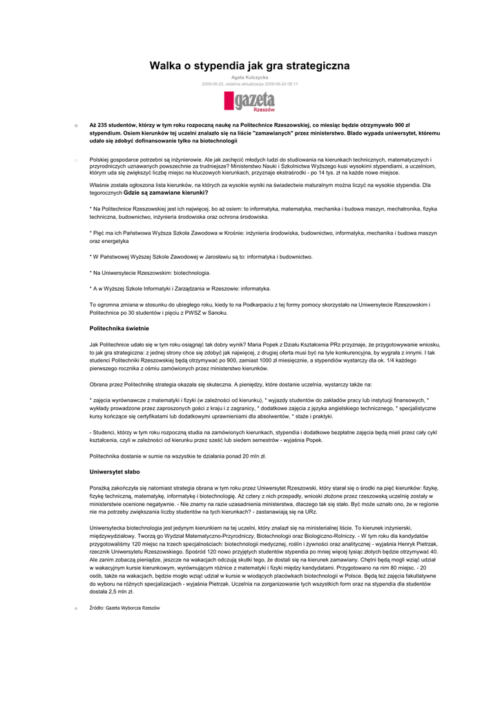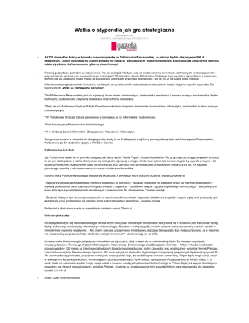 Walka o stypendia jak gra strategiczna Agata Kulczycka 2009-06-23, ostatnia aktualizacja 2009-06-24 08:11 o AŜ 235 studentów, którzy w tym roku rozpoczną naukę na Politechnice Rzeszowskiej, co miesiąc będzie otrzymywało 900 zł stypendium. Osiem kierunków tej uczelni znalazło się na liście "zamawianych" przez ministerstwo. Blado wypada uniwersytet, któremu udało się zdobyć dofinansowanie tylko na biotechnologii o Polskiej gospodarce potrzebni są inŜynierowie. Ale jak zachęcić młodych ludzi do studiowania na kierunkach technicznych, matematycznych i przyrodniczych uznawanych powszechnie za trudniejsze? Ministerstwo Nauki i Szkolnictwa WyŜszego kusi wysokimi stypendiami, a uczelniom, którym uda się zwiększyć liczbę miejsc na kluczowych kierunkach, przyznaje ekstraśrodki - po 14 tys. zł na kaŜde nowe miejsce. Właśnie została ogłoszona lista kierunków, na których za wysokie wyniki na świadectwie maturalnym moŜna liczyć na wysokie stypendia. Dla tegorocznych Gdzie są zamawiane kierunki? * Na Politechnice Rzeszowskiej jest ich najwięcej, bo aŜ osiem: to informatyka, matematyka, mechanika i budowa maszyn, mechatronika, fizyka techniczna, budownictwo, inŜynieria środowiska oraz ochrona środowiska. * Pięć ma ich Państwowa WyŜsza Szkoła Zawodowa w Krośnie: inŜynieria środowiska, budownictwo, informatyka, mechanika i budowa maszyn oraz energetyka * W Państwowej WyŜszej Szkole Zawodowej w Jarosławiu są to: informatyka i budownictwo. * Na Uniwersytecie Rzeszowskim: biotechnologia. * A w WyŜszej Szkole Informatyki i Zarządzania w Rzeszowie: informatyka. To ogromna zmiana w stosunku do ubiegłego roku, kiedy to na Podkarpaciu z tej formy pomocy skorzystało na Uniwersytecie Rzeszowskim i Politechnice po 30 studentów i pięciu z PWSZ w Sanoku. Politechnika świetnie Jak Politechnice udało się w tym roku osiągnąć tak dobry wynik? Maria Popek z Działu Kształcenia PRz przyznaje, Ŝe przygotowywanie wniosku, to jak gra strategiczna: z jednej strony chce się zdobyć jak najwięcej, z drugiej oferta musi być na tyle konkurencyjna, by wygrała z innymi. I tak studenci Politechniki Rzeszowskiej będą otrzymywać po 900, zamiast 1000 zł miesięcznie, a stypendiów wystarczy dla ok. 1/4 kaŜdego pierwszego rocznika z ośmiu zamówionych przez ministerstwo kierunków. Obrana przez Politechnikę strategia okazała się skuteczna. A pieniędzy, które dostanie uczelnia, wystarczy takŜe na: * zajęcia wyrównawcze z matematyki i fizyki (w zaleŜności od kierunku), * wyjazdy studentów do zakładów pracy lub instytucji finansowych, * wykłady prowadzone przez zaproszonych gości z kraju i z zagranicy, * dodatkowe zajęcia z języka angielskiego technicznego, * specjalistyczne kursy kończące się certyfikatami lub dodatkowymi uprawnieniami dla absolwentów, * staŜe i praktyki. - Studenci, którzy w tym roku rozpoczną studia na zamówionych kierunkach, stypendia i dodatkowe bezpłatne zajęcia będą mieli przez cały cykl kształcenia, czyli w zaleŜności od kierunku przez sześć lub siedem semestrów - wyjaśnia Popek. Politechnika dostanie w sumie na wszystkie te działania ponad 20 mln zł. Uniwersytet słabo PoraŜką zakończyła się natomiast strategia obrana w tym roku przez Uniwersytet Rzeszowski, który starał się o środki na pięć kierunków: fizykę, fizykę techniczną, matematykę, informatykę i biotechnologię. AŜ cztery z nich przepadły, wnioski złoŜone przez rzeszowską uczelnię zostały w ministerstwie ocenione negatywnie. - Nie znamy na razie uzasadnienia ministerstwa, dlaczego tak się stało. Być moŜe uznało ono, Ŝe w regionie nie ma potrzeby zwiększania liczby studentów na tych kierunkach? - zastanawiają się na URz. Uniwersytecka biotechnologia jest jedynym kierunkiem na tej uczelni, który znalazł się na ministerialnej liście. To kierunek inŜynierski, międzywydziałowy. Tworzą go Wydział Matematyczno-Przyrodniczy, Biotechnologii oraz Biologiczno-Rolniczy. - W tym roku dla kandydatów przygotowaliśmy 120 miejsc na trzech specjalnościach: biotechnologii medycznej, roślin i Ŝywności oraz analitycznej - wyjaśnia Henryk Pietrzak, rzecznik Uniwersytetu Rzeszowskiego. Spośród 120 nowo przyjętych studentów stypendia po mniej więcej tysiąc złotych będzie otrzymywać 40. Ale zanim zobaczą pieniądze, jeszcze na wakacjach odczują skutki tego, Ŝe dostali się na kierunek zamawiany. Chętni będą mogli wziąć udział w wakacyjnym kursie kierunkowym, wyrównującym róŜnice z matematyki i fizyki między kandydatami. Przygotowano na nim 80 miejsc. - 20 osób, takŜe na wakacjach, będzie mogło wziąć udział w kursie w wiodących placówkach biotechnologii w Polsce. Będą teŜ zajęcia fakultatywne do wyboru na róŜnych specjalizacjach - wyjaśnia Pietrzak. Uczelnia na zorganizowanie tych wszystkich form oraz na stypendia dla studentów dostała 2,5 mln zł. o Źródło: Gazeta Wyborcza Rzeszów