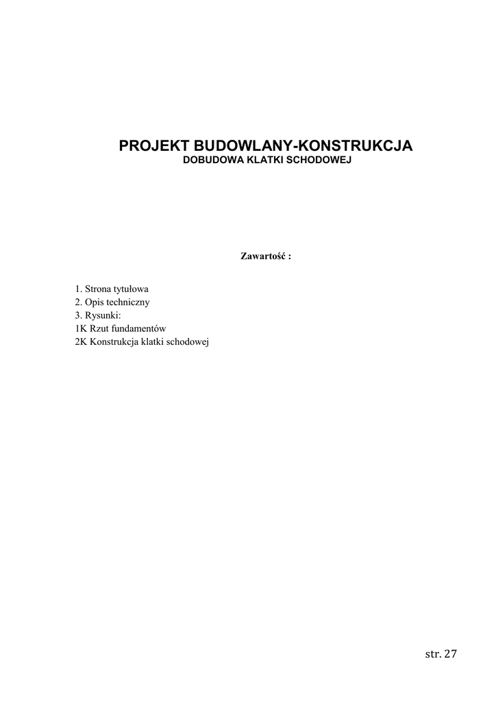 PROJEKT BUDOWLANY-KONSTRUKCJA DOBUDOWA KLATKI SCHODOWEJ Zawartość : 1. Strona tytułowa 2. Opis techniczny 3. Rysunki: 1K Rzut fundamentów 2K Konstrukcja klatki schodowej str. 27 PROJEKT BUDOWLANY-CZ. KONSTRUKCYJNA 1. Podstawa opracowania: 1.1 Umowa z Zamawiającym. 1.2 Projekt budowlany cz. architektoniczna wykonany przez arch. M Szczukieckiego 1.4 Wizja lokalna na obiekcie 1.5 Przepisy i normy branżowe m.in.: - Rozporządzenie Ministra Gospodarki Przestrzennej i Budownictwa z dnia 12 kwietnia 2002 r. w sprawie warunków technicznych, jakim powinny odpowiadać budynki i ich usytuowanie, -PN-82/B-02000. Obciążenia budowli. Zasady ustalania wartości., -PN-82/B-02001. Obciążenia budowli. Obciążenia stałe. -PN-82/B-02003. Obciążenia budowli. Obciążenia zmienne technologiczne., -PN-80/B-02010/Az:2006. Obciążenia w obliczeniach statycznych. Obciążenia śniegiem., -PN-77/B-02011/Az:2009. Obciążenia w obliczeniach statycznych. Obciążenia wiatrem., -PN-81/B-03020. Grunty budowlane. Posadowienie bezpośrednie budowli. Obliczenia statyczne i projektowanie., -PN-90/B-03200 Konstrukcje stalowe. Obliczenia statyczne i projektowanie., -PN—B-03264:2002. Konstrukcje betonowe, żelbetowe i sprężone. Obliczenia statyczne i projektowanie. 1.6 Program I.T.I. – Budownictwo Ogólne, Konstrukcja firmy Intersoft, Łódź 2. Zakres opracowania Opracowanie obejmuje projekt budowlany w zakresie konstrukcji dobudowy klatki schodowej do budynku mieszkalnego przy ul. Tysiąclecia 32c w Bolesławcu 3. Opis obiektu Rozwiązania materiałowo-konstrukcyjne Schematy statyczne Konstrukcję nośną klatki schodowej stanowią nowoprojektowane i istniejące ściany murowane. Uwzględniając przyrost obciążeń z podestu klatki schodowej na istniejącą ścianę pawilonu, oraz zwiększenie obciążenia istniejącego stropodachu nowym ociepleniem i warstwami papy krycia wierzchniego, uznaje się, że nośność ściany i stropodachu jest wystarczająca do przeniesienia dodatkowych obciążeń. Przyjęte założenia Obciążenia śniegiem i wiatrem - normowe. Warunki i sposób posadowienia Na podstawie odkrywek gruntu w pobliżu miejsca projektowanej lokalizacji budynku teren został zaliczony do pierwszej kategorii geotechnicznej. Stwierdzono jego przydatność do bezpośredniego posadowienia. str. 28 Fundamenty zaprojektowano w postaci ław żelbetowych, wylewanych na podkładzie gr. 0,10m z chudego betonu B10. Opis ogólny konstrukcji obiektu – podstawowy układ konstrukcyjny Podstawowym elementem konstrukcji nośnej są ściany murowane z bloczków gazobetonowych odmiany 07 , stanowiące oparcie dla stropodachu i schodów. Budynek położony poza obszarem oddziaływań eksploatacji górniczej. 6. Opis szczegółowy budynku – rozwiązania konstrukcyjno-materiałowe Fundamenty Ławy żelbetowe o wym. 0,50x0,30m, Beton C16/20, stal zbrojeniowa A-I 4Ø12, strzemiona Ø6 co 30cm . Pod ławami –wylewka z chudego betonu gr.10cm. Głębokość posadowienia – 0,80 m poniżej terenu. Głębokość posadowienia Ławy fundamentowej w pobliżu istniejącego fundamentu ściany dostosować do głębokości fundamentu istniejącego. Ławy nowoprojektowane oddylatować od ław istniejących. Na ławach wylać ściany wyrównawcze z betonu C16/20do poziomu terenu . Konstrukcja nośna Konstrukcji nośną stanowią ściany murowane, stanowiące oparcie dla stropodachu oraz stropu nad parterem. Gazobeton odmiany 07 na zaprawie cem.-wap. 3,0 MPa. Połączenie ściany nowej do istniejącej na strzępia lub kotwy .Na wysokości 3,83m wykonać wieniec żelbetowy 20x20cm zbrojony 4 Ø12, strzemiona Ø6 co 30cm, który stanowi jednocześnie nadproże okien półpiętra. Wieniec zakotwić w ścianach istn. na głębokość 20-25cm i ocieplić od zewnątrz styropianem gr. 8cm Strop stropodachu- poz.1 W dobudowywanej klatce schodowej strop żelbetowy w postaci płyty żelbetowej (opartej na nowoprojektowanych ścianach) grubości 15 cm, zbrojony dołem siatkąQ524 Φ 10 o oczkach150x150 mm , a wsporniki dachu – górą. Siatkę górną wspornika dozbroić pretami 6 c0 15cm , mijankowo z siatką i zakotwić w strefie dolnej płyty zgodnie z rysunkiem. Beton C20/25, stal zbrojeniowa BSt500 Schody - poz.3 Nowoprojektowane płyty biegowe schodów grubości 12cm. Schody zbrojone siatką Φ 8 10x25 cm górą i dołem, alternatywnie siatką R443 Φ7d,6 150x250mm (7d – pręty podwójne) . Oparcie płyt schodów na belkach spocznikowych. Belki spocznikowe – poz.4,5 Belki o wym. 20x30cm . Zbrojenie belek: poz.4 - 6 Φ 12, strzemiona Φ 6 co 20 cm. w odległości 75cm od podpór co 15cm poz.5 - 5 Φ 12, strzemiona Φ 6 co 20 cm. w odległości 75cm od podpór co 15cm Belki oprzeć na ścianie za pośrednictwem wieńca 20x20cm, dł.100cm Płyty spocznikowe – poz.2, 6 Płyty spocznikowe schodów grubości 10cm, zbrojone siatką Φ 6 10x25 cm dołem i przy belkach – górą według rysunku. Oparcie płyt spocznikowych – na belkach spocznikowych i ścianach. Beton C20/25, stal zbrojeniowa, żebrowana A-IIIN. Opracował: Kazimierz Grynienko str. 29 str. 30