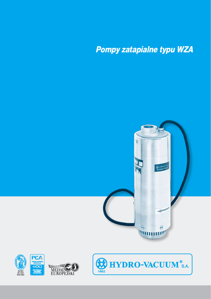 Pompy zatapialne typu WZA DA N E OGÓLN E POMPY ZATAPIALNE TYPU WZA Wielostopniowe, zatapialne pompy wirowe typu WZA idealnie nadają się do pompowania wody czystej, w tym również wody pitnej i użytkowej, wykorzystywanej w gospodarstwach domowych. Pompy typu WZA, powinny być instalowane, wszędzie tam, gdzie lustro wody w ujęciu uniemożliwia zastosowanie pompy samozasysającej, a głębokość ujęcia uniemożliwia zastosowanie pompy głębinowej. Pompy zatapialne WZA mogą być również stosowane do pompowania innych cieczy o współczynniku pH = 6 - 8, maksymalnej dopuszczalnej lepkości do 13 mm2/s i gęstości do 1000 kg/m3. Temperatura pompowanego medium nie powinna przekraczać 40 OC. Dopuszczalna jest zawartość w pompowanym medium wtrąceń stałych nieabrazyjnych o maksymalnej średnicy 0,5 mm i w ilości do 100 g/m3. Budowa pompy WZA Zastosowanie Agregaty pompowe WZA są stosowane między innymi w: w systemach zaopatrzenia w wodę (pompowanie wody ze studni o minimalnej średnicy 6” lub ujęć otwartych, zbiorników, rezerwuarów), w automatach wodociągowych (np. automat typu AGE.5), w instalacjach nawadniających, w systemach myjących, w układach odwadniających, w zagospodarowaniu wody deszczowej. Podstawowe parametry techniczne wydajność Q : 1,2 ÷ 21,0 m3/h wysokość podnoszenia H : 60,0 ÷ 8,0 m. Wykonania materiałowe pomp WZA Nazwa części Materiał Korpus łożyskowy górny Korpus łożyskowy dolny Korpus tłoczny Kierownica Wirnik Wał Płaszcz silnika Płaszcz zewnętrzny Kosz ssawny Części złączne Olej w komorze olejowej mosiądz Noryl leksan + mosiądz stal austenityczna olej wazelinowy biały Dane silnika Silnik Moc (kW) ln (A) cos f SKg 80 - 2B STKg 80x - 2C STKg 80x - 2D SKg 90L - 2PC 0,55 0,75 1,10 1,50 3,60 4,83 7,00 9,50 SKg 112M - 2 SKg 132S - 2A SKg 112M - 2PC SKg 132S - 2B SKg 132S - 2PC 0,55 0,75 1,10 1,50 2,20 1,50 1,90 2,50 3,40 4,90 h(%) Stopień Klasa lr/ln Mr/Mn ochrony izolacji Silniki jednofazowe 0,92 0,98 0,96 0,96 71,0 72,0 74,0 75,0 3,2 3,7 3,6 3,4 Kondensator rozruchowy 0,40 0,36 0,50 0,55 IP54 IP54 IP54 IP54 F F F F 2,00 2,20 2,30 2,80 3,50 IP54 IP54 IP54 IP54 IP54 F F F F F Silniki trójfazowe 0,80 0,86 0,87 0,88 0,83 70,0 70,0 77,0 77,0 82,0 1 - Korpus tłoczny 2 - Korpus łożyskowy górny 3 - Wał agregatu 4 - Płaszcz silnika 5 - Płaszcz pompy 6 - Pierścień uszczelniający 7 - Komora olejowa 8 - Korpus łożyskowy dolny 9 - Uszczelnienie mechaniczne 10 - Wirnik 11 - Korpus środkowy 12 - Kierownica 13 - Kosz ssawny 4,0 4,5 5,0 5,0 6,5 18mF/450V 25mF/450V 25mF/450V 30mF/450V Urządzenie zabezpieczające* UZS.4 (0,55 kW) UZS.4 (0,75 kW) UZS.4 (1,10 kW) UZS.4 (1,50 kW) UZS.4 (2,20 kW) Dla agregatów z silnikiem 1-fazowym załączony jest przewód H07RN-F 4 x 1,5 mm2 o długości 10 m. Dla agregatów z silnikiem 3-fazowym załączony jest przewód H07RN-F 4 x 1,0 mm2 o długości 10 m. W zależności od wymagań klienta przewód może być o innej długości. Możliwe są również inne dobory silników jako wykonania specjalne. * - nie wchodzi w konpletację dostawy Agregaty WZA to zatapialne, wielostopniowe, monoblokowe pompy odśrodkowe z silnikiem suchym przewijalnym. ul. Droga Jeziorna 8, 86-303 Grudziądz, Polska tel. +48(56) 45 07 410; fax: +48(56) 46 25 955 2 www.hv.pl [email protected] CH AR A KTERYST Y K A Charakterystyka pompy WZA.2 Charakterystyka pompy WZA.3 Charakterystyka pompy WZA.4 Oznaczenie agregatu WZA.2.02 WZA.2.03 WZA.2.04 WZA.2.05 WZA.2.06 WZA.3.02 WZA.3.03 WZA.3.04 WZA.3.05 WZA.3.06 WZA.4.01 WZA.4.02 WZA.4.03 WZA.4.04 Maksymalna Moc Średnica Średnica Długość Masa moc na wale silnika agregatu króćca agregatu agregatu pompy [kW] [kW] D [mm] d1 [cal] L [mm] [kg] 0.36 0.55 142 5/4 426 18.0 0.54 0.75 142 5/4 456 19.0 0.72 1.10 142 5/4 524 20.0 0.90 1.10 142 5/4 552 20.5 1.08 1.50 142 5/4 602 21.5 0.60 0.75 142 5/4 454 19.0 0.90 1.10 142 5/4 508 20.5 1.20 1.50 142 5/4 562 21.5 1.50 1.50 142 5/4 594 21.8 1.80 2.20 142 5/4 644 22.5 0.50 0.75 142 5/4 422 19.0 1.00 1.10 142 5/4 476 20.0 1.50 1.50 142 5/4 530 21.5 2.00 2.20 142 5/4 580 22.5 Wykonania konstrukcyjne pomp WZA Wykonania konstrukcyjne są oznaczone kodem – e1 e2 e3 e4 – z czego: e1 – określa ilość faz silnika e2 – typ uszczelnienia e3 – rezerwa oznaczona cyfrą „0” e4 – rezerwa oznaczona cyfrą „0” e1 = 1 silnik jednofazowy e1 = 2 silnik trójfazowy e2 = 1 uszczelnienie mech. typ MG.1 e2 = 2 uszczelnienie mech. typ 2100 W związku z tym, że agregat jest monoblokiem dostarczany jest tylko w jednej kompletności oznaczonej h=4 W przypadku agregatów WZA nie ma rozróżnienia w sposobie wykończenia. Kosmetyka określona jest zawsze cyfrą „1” Opis do charakterystyk pomp WZA.2, WZA.3, WZA.4 H[m] - H Wysokość podnoszenia • η[%]- Średnia sprawność pompy • Q[m3/h] - Q Wydajność www.hv.pl [email protected] ul. Droga Jeziorna 8, 86-303 Grudziądz, Polska tel. +48(56) 45 07 410; fax: +48(56) 46 25 955 3 Struktura oznaczenia wyrobu Kod oznaczenia pompy sporządzony jest wg. następującego schematu: W Z A a a a 3 b 0 4 c c 1 d 2 1 0 0 e1 e 2 e 3 e 4 4 h 0 0 5 i i i 1 k gdzie: a a a b c c d e e1 e1 e2 h i i i k - typ agregatu - typowielkość pompy - typowymiar (ilość stopni) pompy - wykonanie materiałowe pompy** - wykonanie konstrukcyjne pompy wg. pkt. „Wykonania konstrukcyjne” - kompletność dostaw (w przypadku WZA, zawsze h=4) - dobór agregatu* - kosmetyka (w przypadku WZA, zawsze k=1) *) dobór agregatu zakodowany wg wewnętrznej dokumentacji producenta - w przypadku agregatów WZA jest on jednoznaczny **) agregaty seryjnie wykonane są tylko w jednym wykonaniu materiałowym Zabezpieczenie silnika Dla prawidłowej i bezawaryjnej pracy należy stosować urządzenia zabezpieczające pracę silnika przed: w przeciążeniem, w zanikiem fazy i asymetrii zasilania, w symetrycznym spadkiem napięcia zasilania, w nadmierną ilością załączeń, suchobiegiem. Hydro-Vacuum S.A. proponuje urządzenie zabe