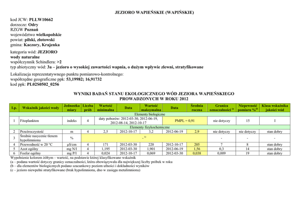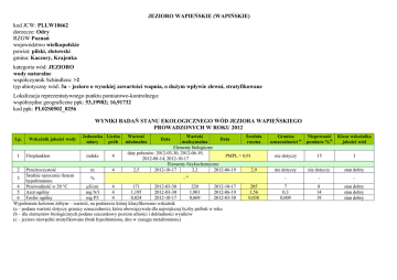 JEZIORO WAPIEŃSKIE (WAPIŃSKIE) kod JCW: PLLW10662 dorzecze: Odry RZGW Poznań województwo wielkopolskie powiat: pilski, złotowski gmina: Kaczory, Krajenka kategoria wód: JEZIORO wody naturalne współczynnik Schindlera: >2 typ abiotyczny wód: 3a – jezioro o wysokiej zawartości wapnia, o dużym wpływie zlewni, stratyfikowane Lokalizacja reprezentatywnego punktu pomiarowo-kontrolnego: współrzędne geograficzne ppk: 53,19982; 16,91732 kod ppk: PL02S0502_0256 WYNIKI BADAŃ STANU EKOLOGICZNEGO WÓD JEZIORA WAPIEŃSKIEGO PROWADZONYCH W ROKU 2012 Lp. 1 2 Wskaźnik jakości wody Fitoplankton Jednostka Liczba miary prób indeks 4 Wartość minimalna Wartość Średnia Data maksymalna roczna Elementy biologiczne daty poborów: 2012-03-30, 2012-06-19, PMPL = 0,91 2012-08-14, 2012-10-17 Elementy fizykochemiczne 2,5 2012-10-17 3,2 2012-06-19 2,9 Data Przeźroczystość m 4 Średnie nasycenie tlenem 3 - (c % hypolimnionu 4 Przewodność w 20 °C μS/cm 4 171 2012-03-30 220 2012-10-17 5 Azot ogólny mg N/l 4 1,195 2012-03-30 1,901 2012-06-19 6 Fosfor ogólny mg P/l 4 0,024 2012-10-17 0,069 2012-03-30 Wypełnienie kolorem żółtym – wartość, na podstawie której klasyfikowano wskaźnik (a – podana wartość dotyczy granicy oznaczalności, która obowiązywała dla największej liczby próbek w roku (b – dla elementów biologicznych podano szacunkowy poziom ufności i dokładności wyników (c – jezioro niewpełni stratyfikowane (brak hypolimnionu, dno w zasięgu metalimnionu) 205 1,56 0,038 Granica oznaczalności (a Niepewność pomiaru %(b Klasa wskaźnika jakości wód nie dotyczy 15 I nie dotyczy nie dotyczy stan dobry - - - 7 0,3 0,009 8 14 19 stan dobry stan dobry stan dobry KLASYFIKACJA ELEMENTÓW BIOLOGICZNYCH, FIZYKOCHEMICZNYCH I HYDROMORFOLOGICZNYCH W JEDNOLITEJ CZĘŚCI WÓD Klasyfikacja elementów: − biologicznych – I (STAN BARDZO DOBRY) − fizykochemicznych – STAN DOBRY − hydromorfologicznych – I KLASA