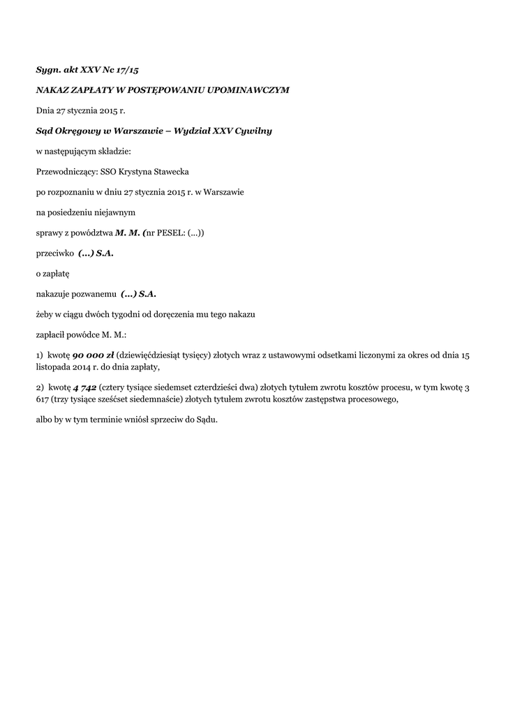 Sygn. akt XXV Nc 17/15 NAKAZ ZAPŁATY W POSTĘPOWANIU UPOMINAWCZYM Dnia 27 stycznia 2015 r. Sąd Okręgowy w Warszawie – Wydział XXV Cywilny w następującym składzie: Przewodniczący: SSO Krystyna Stawecka po rozpoznaniu w dniu 27 stycznia 2015 r. w Warszawie na posiedzeniu niejawnym sprawy z powództwa M. M. (nr PESEL: (...)) przeciwko (...) S.A. o zapłatę nakazuje pozwanemu (...) S.A. żeby w ciągu dwóch tygodni od doręczenia mu tego nakazu zapłacił powódce M. M.: 1) kwotę 90 000 zł (dziewięćdziesiąt tysięcy) złotych wraz z ustawowymi odsetkami liczonymi za okres od dnia 15 listopada 2014 r. do dnia zapłaty, 2) kwotę 4 742 (cztery tysiące siedemset czterdzieści dwa) złotych tytułem zwrotu kosztów procesu, w tym kwotę 3 617 (trzy tysiące sześćset siedemnaście) złotych tytułem zwrotu kosztów zastępstwa procesowego, albo by w tym terminie wniósł sprzeciw do Sądu.