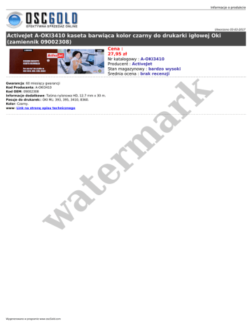 Informacje o produkcie Utworzono 03-03-2017 ActiveJet A-OKI3410 kaseta barwiąca kolor czarny do drukarki igłowej Oki (zamiennik 09002308) Cena : 27,95 zł Nr katalogowy : A-OKI3410 Producent : ActiveJet Stan magazynowy : bardzo wysoki Średnia ocena : brak recenzji w at er m ar k Gwarancja: 60 miesięcy gwarancji Kod Producenta: A-OKI3410 Kod OEM: 09002308 Informacje dodatkowe: Taśma nylonowa HD, 12.7 mm x 30 m. Pasuje do drukarek:: OKI ML: 393, 395, 3410, 8360. Kolor: Czarny. www: Link na stronę opisu technicznego Wygenerowano w programie www.oscGold.com