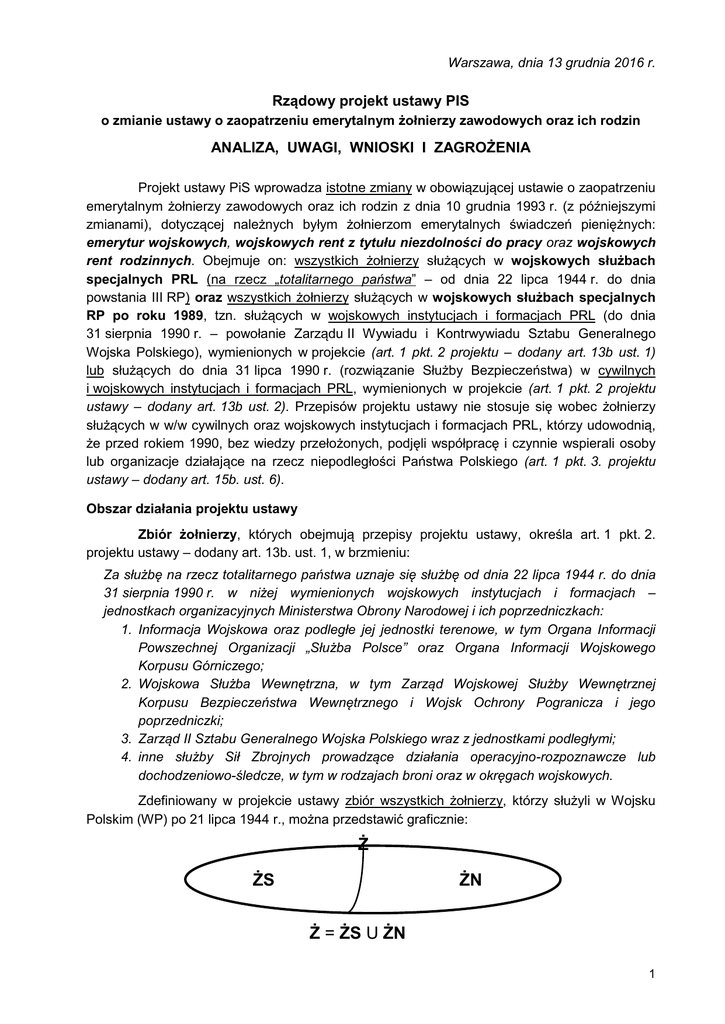 Warszawa, dnia 13 grudnia 2016 r. Rządowy projekt ustawy PIS o zmianie ustawy o zaopatrzeniu emerytalnym żołnierzy zawodowych oraz ich rodzin ANALIZA, UWAGI, WNIOSKI I ZAGROŻENIA Projekt ustawy PiS wprowadza istotne zmiany w obowiązującej ustawie o zaopatrzeniu emerytalnym żołnierzy zawodowych oraz ich rodzin z dnia 10 grudnia 1993 r. (z późniejszymi zmianami), dotyczącej należnych byłym żołnierzom emerytalnych świadczeń pieniężnych: emerytur wojskowych, wojskowych rent z tytułu niezdolności do pracy oraz wojskowych rent rodzinnych. Obejmuje on: wszystkich żołnierzy służących w wojskowych służbach specjalnych PRL (na rzecz „totalitarnego państwa” – od dnia 22 lipca 1944 r. do dnia powstania III RP) oraz wszystkich żołnierzy służących w wojskowych służbach specjalnych RP po roku 1989, tzn. służących w wojskowych instytucjach i formacjach PRL (do dnia 31 sierpnia 1990 r. – powołanie Zarządu II Wywiadu i Kontrwywiadu Sztabu Generalnego Wojska Polskiego), wymienionych w projekcie (art. 1 pkt. 2 projektu – dodany art. 13b ust. 1) lub służących do dnia 31 lipca 1990 r. (rozwiązanie Służby Bezpieczeństwa) w cywilnych i wojskowych instytucjach i formacjach PRL, wymienionych w projekcie (art. 1 pkt. 2 projektu ustawy – dodany art. 13b ust. 2). Przepisów projektu ustawy nie stosuje się wobec żołnierzy służących w w/w cywilnych oraz wojskowych instytucjach i formacjach PRL, którzy udowodnią, że przed rokiem 1990, bez wiedzy przełożonych, podjęli współpracę i czynnie wspierali osoby lub organizacje działające na rzecz niepodległości Państwa Polskiego (art. 1 pkt. 3. projektu ustawy – dodany art. 15b. ust. 6). Obszar działania projektu ustawy Zbiór żołnierzy, których obejmują przepisy projektu ustawy, określa art. 1 pkt. 2. projektu ustawy – dodany art. 13b. ust. 1, w brzmieniu: Za służbę na rzecz totalitarnego państwa uznaje się służbę od dnia 22 lipca 1944 r. do dnia 31 sierpnia 1990 r. w niżej wymienionych wojskowych instytucjach i formacjach – jednostkach organizacyjnych Ministerstwa Obrony Narodowej i ich poprzedniczkach: 1. Informacja Wojskowa oraz podległe jej jednostki terenowe, w tym Organa Informacji Powszechnej Organizacji „Służba Polsce” oraz Organa Informacji Wojskowego Korpusu Górniczego; 2. Wojskowa Służba Wewnętrzna, w tym Zarząd Wojskowej Służby Wewnętrznej Korpusu Bezpieczeństwa Wewnętrznego i Wojsk Ochrony Pogranicza i jego poprzedniczki; 3. Zarząd II Sztabu Generalnego Wojska Polskiego wraz z jednostkami podległymi; 4. inne służby Sił Zbrojnych prowadzące działania operacyjno-rozpoznawcze lub dochodzeniowo-śledcze, w tym w rodzajach broni oraz w okręgach wojskowych. Zdefiniowany w projekcie ustawy zbiór wszystkich żołnierzy, którzy służyli w Wojsku Polskim (WP) po 21 lipca 1944 r., można przedstawić graficznie: Ż ŻS ŻN Ż = ŻS U ŻN 1 gdzie: Ż – zbiór żołnierzy służących w WP po dniu 21 lipca 1944 r. ŻS – zbiór żołnierzy służących w wojskowych służbach specjalnych WP po dniu 21 lipca 1944 r. ŻN – zbiór żołnierzy nie służących w wojskowych służbach specjalnych WP po dniu 21 lipca 1944 r., czyli służących poza wojskowymi służbami specjalnymi w PRL i RP. Natomiast zbiór żołnierzy służących w wojskowych służbach specjalnych w PRL (od dnia 22 lipca 1944 r. do dnia 31 sierpnia 1990 r.) – zbiór ŻS, można przedstawić graficznie: Projekt ustawy obejmuje PRL Projekt ustawy nie obejmuje RP ŻS ŻSPRL(E,Z) ŻSRP(C,E,Z) ŻSRP-PC(P,E,Z) ŻSPRL-RP(C,E,Z) ŻSPRL-PC(P,E,Z) gdzie: ŻS – zbiór żołnierzy służących w służbach specjalnych WP po dniu 21 lipca 1944 r. ŻSPRL(E,Z) – zbiór żołnierzy służących w służbach PRL (Emeryci, Zmarli) ŻSPRL-RP(C,E,Z) – zbiór żołnierzy służących w służbach PRL i RP (Czynni, Emeryci, Zmarli) ŻSPRL-PC(P,E,Z) – zbiór żołnierzy służących w służbach PRL i pracujących w RP (Pracujący, Emeryci, Zmarli) ŻSRP(C,E,Z) – zbiór żołnierzy służących w służbach RP (Czynni, Emeryci, Zmarli) ŻSRP-PC(P,E,Z) – zbiór żołnierzy służących w służbach RP i pracujących w RP (Pracujący, Emeryci, Zmarli) Powyższy rysunek jednoznacznie pokazuje, że przepisy projektu ustawy obejmują żołnierzy należących do zbioru: ŻSPRL = ŻSPRL(E,Z) U ŻSPRL-RP(C,E,Z) U ŻSPRL-PC(P,E,Z), czyli wszystkich żołnierzy, którzy rozpoczęli służbę w PRL po dniu 21 lipca 1944 r. – zostaną obniżone im oraz ich rodzinom (teraz albo w przyszłości) emerytalne świadczenia pieniężne (emerytury wojskowe, wojskowe renty z tytułu niezdolności do pracy oraz wojskowe renty rodzinne) i nie obejmują żołnierzy należących do zbioru: ŻSRP = ŻSRP(C,E,Z) U ŻSRP-PC(P,E,Z), czyli wszystkich żołnierzy, którzy rozpoczęli służbę w RP po dniu 31 sierpnia 1990 r. Zasady naliczania należnych, byłym żołnierzom wojskowych służb specjalnych oraz ich rodzinom, obniżonych emerytalnych świadczeń pieniężnych (emerytur wojskowych, wojskowych rent z tytułu niezdolności do pracy oraz wojskowych rent rodzinnych), określają przepisy projektu ustawy określone w art. 1 pkt. 3-6 projektu ustawy. Zasady dotyczące emerytur wojskowych są zawarte w art. 1 pkt. 3 projektu ustawy – dodany art. 15b, w brzmieniu: 1. Żołnierz, który był członkiem Wojskowej Rady Ocalenia Narodowego, otrzyma emeryturę wynoszącą 0,5% podstawy wymiaru za każdy rok służby w Wojsku Polskim po dniu 11 grudnia 1981 r. 2. Żołnierz, który pełnił służbę w służbach specjalnych na rzecz totalitarnego państwa i pozostawał w służbie przed dniem 2 stycznia 1999 r., otrzyma emeryturę wynoszącą: 2 1) 0,5% podstawy wymiaru – za każdy rok służby w wojskowych służbach specjalnych PRL lub cywilnych służbach bezpieczeństwa PRL; 2) 2,6% podstawy wymiaru – za każdy rok służby wojskowej w PRL, jeśli ta służba była poza wojskowymi służbami specjalnymi
