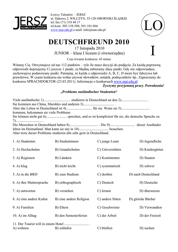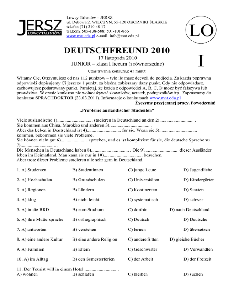 Łowcy Talentów – JERSZ ul. Dębowa 2, WILCZYN, 55-120 OBORNIKI ŚLĄSKIE tel./fax (71) 310 48 17 tel.kom. 505-138-588; 501-101-866 www.mat.edu.pl e-mail: [email protected] LO DEUTSCHFREUND 2010 17 listopada 2010 JUNIOR – klasa I liceum (i równorzędne) Czas trwania konkursu: 45 minut I Witamy Cię. Otrzymujesz od nas 112 punktów – tyle ile masz decyzji do podjęcia. Za każdą poprawną odpowiedź dopisujemy Ci jeszcze 1 punkt, za błędną zabieramy dany punkt. Gdy nie odpowiadasz, zachowujesz podarowany punkt. Pamiętaj, że każda z odpowiedzi A, B, C, D może być fałszywa lub prawdziwa. W czasie konkursu nie wolno używać słowników, notatek, podręczników itp.. Zapraszamy do konkursu SPRACHDOKTOR (23.03.2011). Informacje o konkursach www.mat.edu.pl Życzymy przyjemnej pracy. Powodzenia! „Probleme ausländischer Studenten“ Viele ausländische 1).............................. studieren in Deutschland an den 2)............................. . Sie kommen aus China, Marokko und anderen 3).................................. . Aber das Leben in Deutschland ist 4)............................. für sie. Wenn sie 5)................................ kommen, bekommen sie viele Probleme. Sie können nicht gut 6)....................... sprechen, und es ist kompliziert für sie, die deutsche Sprache zu 7).............................. . Die Menschen in Deutschland haben 8)................................ . Die 9)............................ dieser Ausländer leben im Heimatland. Man kann sie nur in 10)................................. besuchen. Aber trotz dieser Probleme studieren alle sehr gern in Deutschland. 1. A) Studenten B) Studentinnen C) junge Leute D) Jugendliche 2. A) Hochschulen B) Grundschulen C) Universitäten D) Kindergärten 3. A) Regionen B) Ländern C) Kontinenten D) Staaten 4. A) klug B) nicht leicht C) systematisch D) schwer 5. A) in die BRD B) zum Studium C) dorthin 6. A) ihre Muttersprache B) orthographisch C) Deutsch D) Deutsche 7. A) antworten B) verstehen C) lernen D) übersetzen 8. A) eine andere Kultur B) eine andere Religion C) andere Sitten 9. A) Familien B) Eltern C) Geschwister D) Verwandten 10. A) im Alltag B) den Semesterferien C) der Arbeit D) der Freizeit C) bleiben D) suchen 11. Der Tourist will in einem Hotel ........................... . A) wohnen B) schlafen D) nach Deutschland D) gleiche Bücher 12. „Sport“ – Assoziationen: A) Rodeln B) Reiten C) Turnen D) Müssen 13. blöd = ............................ A) doof B) dann C) dünn D) dumm 14. Manfred geht nicht zum Arzt, .................. er Fieber hat. A) wenn B) als C) obwohl D) dass 15. Ich kann heute für dich nichts ......................... . A) kaufen B) tun D) bitten C) geben 16. Heidi ist die ........................ Schülerin in der ganzen Gruppe. A) jungste B) klügste C) netteste D) ältste 17. Könntest du bitte die Tür ............................ ? A) aufmachen B) öffnen C) zumachen D) schließen 18. Er hat ...................... um Hilfe gebeten. A) ihn B) sie C) euch D) mir 19. Verneine richtig! „Das Kind hat ................. Zeit.“ A) kein B) nicht C) nie D) keine 20. Max hat sich ans Fenster ................................. . A) gesessen B) gelegen C) gesetzt D) gegangen 21. Welche Wortpaare sind richtig? A) Österreich – österreichisch C) Dänemark – dänisch B) England – engländerisch D) Russland – russisch 22. Milch ist im Kühlschrank fünf Tage …………………………….. A) gesund B) konservativ C) haltbar D) nötig 23. Der Vater trinkt am Morgen ....................... Kaffee oder Tee. A) eine Tasse B) zwei Tassen C) ein Glas D) zwei Gläser 24. Im Zimmer war es ....................... . A) dunkel B) leer C) hell D) klug 25. Es gibt .................... bei meiner Tante. A) viel Neue B) nichts Neue C) viel Neues D) nichts Neues 26. Ich ........................... eine Briefmarke nach Polen. A) möchte B) hätte gern C) suche D) brauche 27. Der Professor muss ......................... prüfen. A) den Student B) die Studentin C) die Studenten D) den Studenten 28. Wie benden wir einen Brief? A) Hallo! B) Schöne Grüße! C) Bis dann! © Copyright by ŁOWCY TALENTÓW – JERSZ, Wrocław 2010 D) Lieber Freund!