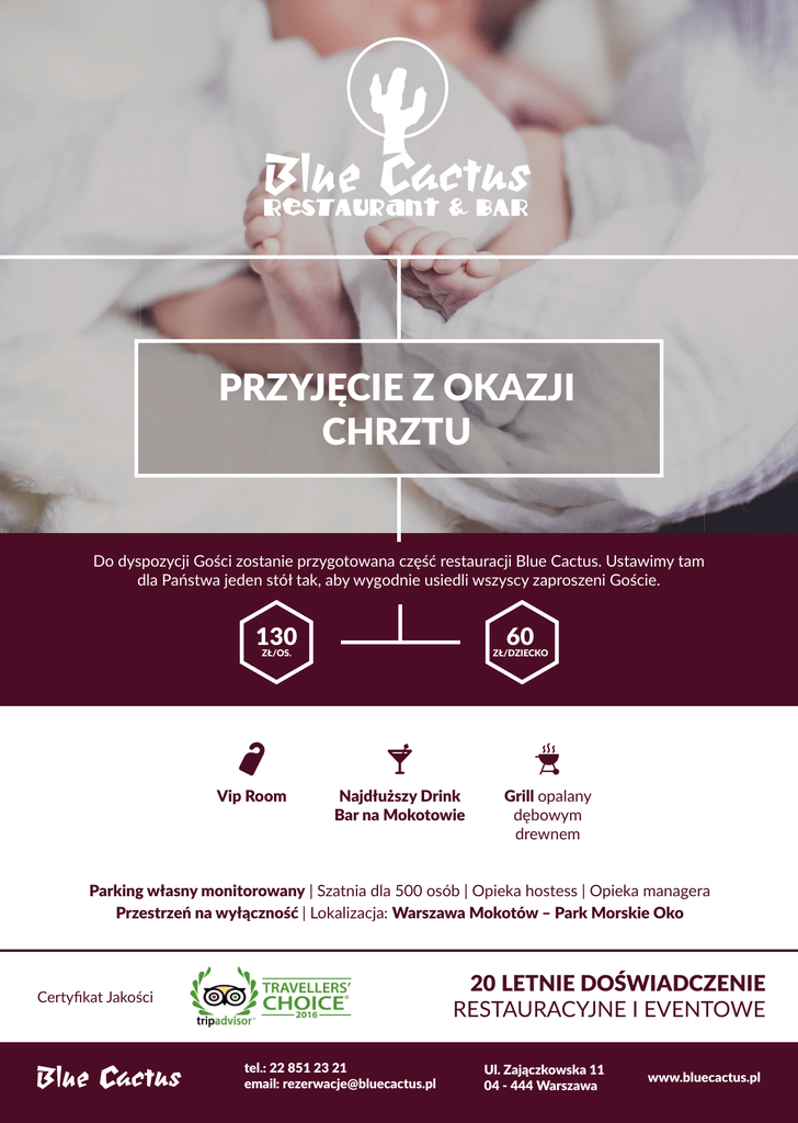 PRZYJĘCIE Z OKAZJI CHRZTU Do dyspozycji Gości zostanie przygotowana część restauracji Blue Cactus. Ustawimy tam dla Państwa jeden stół tak, aby wygodnie usiedli wszyscy zaproszeni Goście. 130 60 ZŁ/OS. Vip Room ZŁ/DZIECKO Najdłuższy Drink Bar na Mokotowie Grill opalany dębowym drewnem Parking własny monitorowany | Szatnia dla 500 osób | Opieka hostess | Opieka managera Przestrzeń na wyłączność | Lokalizacja: Warszawa Mokotów – Park Morskie Oko 20 LETNIE DOŚWIADCZENIE RESTAURACYJNE I EVENTOWE Certyfikat Jakości tel.: 22 851 23 21 email: [email protected] Ul. Zajączkowska 11 04 - 444 Warszawa www.bluecactus.pl tel.: 22 851 23 21 email: [email protected] Ul. Zajączkowska 11 04 - 444 Warszawa www.bluecactus.pl Menu dla dorosłych PRZYSTAWKI DANIA GŁÓWNE PÓŁMISEK RÓŻNEGO RODZAJU WĘDLIN RÓŻYCZKI Z WĘDZONEGO ŁOSOSIA Z SERKIEM PIECZONY DORSZ W ZIOŁOWYM PANCO Z MŁODYMI CHRZANOWYM SZYNKA PARMEŃSKA Z MELONEM I RUKOLĄ ROLADKI Z TORTILLI Z GRILLOWANYMI WARZYWAMI PASZTET DOMOWY Z GRZYBAMI I ŻURAWINĄ /do wyboru/ ZIEMNIAKAMI I MARCHEWKĄ Z IMBIREM ROLADA Z KURCZAKA Z SUSZONYMI POMIDORAMI, SZPINAKIEM I MOZARELLĄ Z KOPYTKAMI I BROKUŁAMI SAŁATKI DESERY SAŁATKA CESARSKA Z GRILLOWANYM KURCZAKIEM KLASYCZNA SAŁATKA GRECKA TIRAMISU SERNIK WANILIOWY ŚWIEŻE OWOCE ZUPA CENA: 130ZŁ OD OSOBY DOROSŁEJ KREM POMIDOROWY Z NUTĄ TEQUILI Menu dla dzieci do 10 lat DANIA GŁÓWNE ZUPA /do wyboru/ ROSÓŁ Z MAKARONEM PALUSZKI Z KURCZAKA Z DOMOWYMI FRYTKAMI I MIZERIĄ ZE ŚWIEŻEGO OGÓRKA HAMBURGER DZIECIĘCY Z SEREM I FRYTKAMI DESERY SAŁATKA OWOCOWA | GOFRY | NALEŚNIKI DODATKI: BITA ŚMIETANA, OWOCE, SEREK WANILIOWY SOS CZEKOLADOWY, TRUSKAWKOWY CENA: 60ZŁ OD OSOBY DOROSŁEJ ANIA WOJDAN / Event Manager MARTIN KRUIJSSE / Junior Event Manager MARIUSZ WITANOWSKI / Event Manager email: [email protected] tel. +48 606 242 597 email: [email protected] tel. +48 728 361 790 email: [email protected] tel. +48 509 103 176 tel.: 22 851 23 21 email: [email protected] Ul. Zajączkowska 11 04 - 444 Warszawa www.bluecactus.pl DODATKOWO PŁATNE: ALKOHOLE CENA ZAWIERA: Dwa napoje bezalkoholowe dla każdego gościa Szatnia Toalety Opieka hostess Opieka Managera Parking monitorowany – niestrzeżony ▪▪Wg spożycia zgodnie z cenami z karty ▪▪W formie open baru (z różnym asortymentem do wyboru) OBSŁUGA Zapewniamy profesjonalną obsługę kelnerską przez cały czas trwania imprezy. POWYŻSZE MENU JEST PRZYKŁADOWE. Zapraszamy do kontaktu, aby poznać inne warianty Serwis kelnerski w wysokości 10% wartości zamówienia zostanie doliczony do końcowego rachunku. WARUNKI PŁATNOŚCI Zaliczka w wysokości 40% przewidywanego zamówienia płatna przelewem przed przyjęciem. (np. menu za 115zł dla 20 osób – 115zł x 20 = 2300 -> 2300zł x 40% = 920zł zaliczka) Reszta rachunku uregulowana kartą lub gotówką w dniu przyjęcia. MOŻLIWOŚĆ ZAMÓWIENIA: Aranżacja stołu (białe obrusy, świeże kwiaty, świeczki) - 200zł. Napoje alkoholowe są dodatkowo płatne Istniej również możliwość zamówienia pakietu w formie open baru z nieograniczonym spożyciem napojów bezalkoholowych w cenie 30zł za osobę. W skład takiego zestawu wchodzą: ▪▪soki ▪▪napoje gazowane ▪▪woda gazowana i niegazowana ▪▪kawa i herbata ANIA WOJDAN / Event Manager MARTIN KRUIJSSE / Junior Event Manager MARIUSZ WITANOWSKI / Event Manager email: [email protected] tel. +48 606 242 597 email: [email protected] tel. +48 728 361 790 email: [email protected] tel. +48 509 103 176