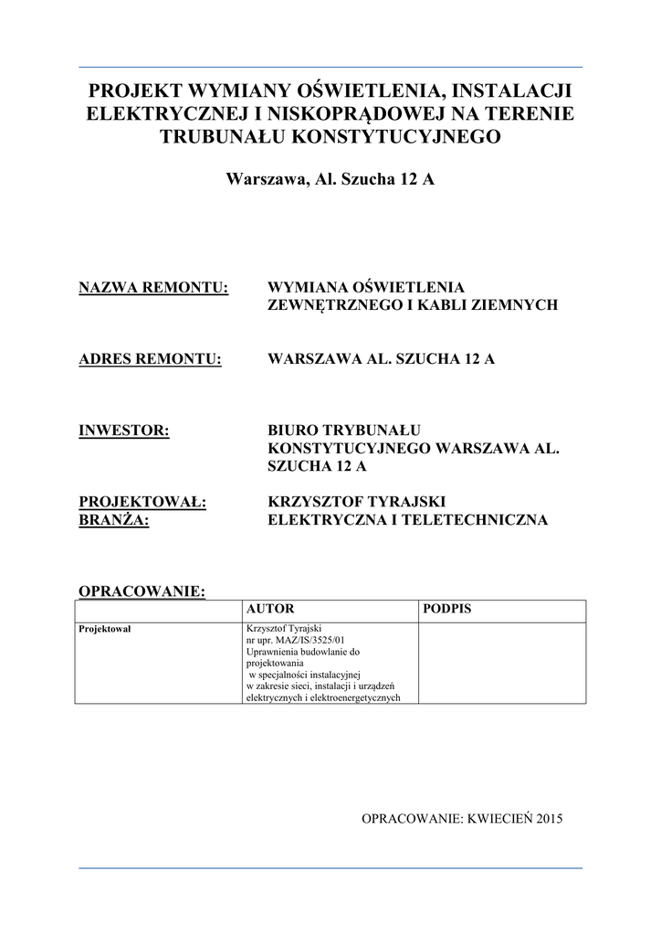 PROJEKT WYMIANY OŚWIETLENIA, INSTALACJI ELEKTRYCZNEJ I NISKOPRĄDOWEJ NA TERENIE TRUBUNAŁU KONSTYTUCYJNEGO Warszawa, Al. Szucha 12 A NAZWA REMONTU: WYMIANA OŚWIETLENIA ZEWNĘTRZNEGO I KABLI ZIEMNYCH ADRES REMONTU: WARSZAWA AL. SZUCHA 12 A INWESTOR: BIURO TRYBUNAŁU KONSTYTUCYJNEGO WARSZAWA AL. SZUCHA 12 A PROJEKTOWAŁ: BRANŻA: KRZYSZTOF TYRAJSKI ELEKTRYCZNA I TELETECHNICZNA OPRACOWANIE: AUTOR Projektował PODPIS Krzysztof Tyrajski nr upr. MAZ/IS/3525/01 Uprawnienia budowlanie do projektowania w specjalności instalacyjnej w zakresie sieci, instalacji i urządzeń elektrycznych i elektroenergetycznych OPRACOWANIE: KWIECIEŃ 2015 Spis treści Oświadczenie Projektanta ....................................................................................................... 3 Wstęp ......................................................................................................................................... 4 1. Przedmiot opracowania .................................................................................................. 4 2. Opis techniczny ............................................................................................................... 4 2.1. 2.2. 2.3. 2.4. 3. Wymiana słupów i opraw oświetleniowych .......................................................................................... 4 Wymiana kabli oświetlenia terenu. ........................................................................................................ 4 Wymiana zasilania i sterowania napędem bram wjazdowych. .............................................................. 5 Wymiana zasilania podświetlenia wystaw na ogrodzeniu ..................................................................... 5 Obliczenia techniczne ..................................................................................................... 6 3.1. Obliczenia .............................................................................................................................................. 6 3.1.1. Dobór przekroju przewodu ze względu na dopuszczalny spadek napięcia ................................... 6 3.1.2. Dobór zabezpieczenia kabli i przewodów przed skutkami przeciążenia ...................................... 7 4. 5. Zestawiane materiałów zasadniczych ........................................................................... 8 Rysunki ............................................................................................................................ 9 Oświadczenie Projektanta Ja, niżej podpisany Krzysztof Tyrajski Uprawniania budowlane nr 62/89 Sk-ce, jestem członkiem Mazowieckiej Izby Inżynierów Budownictwa pod numerem ewidencyjnym MAZ/IS/3525/01 po zapoznaniu się z przepisami ustawy z dnia 7 lipca 1994 r. – Prawo budowlane (jednolity tekst z 2003 r. Dz. U. nr 207, poz. 2016 z późniejszymi zmianami, zgodnie z art. 20 ust. 4 tej ustawy) oświadczam, że: Projekt wymiany oświetlenia zewnętrznego i kabli ziemnych na terenie Trybunału Konstytucyjnego Al. Szucha 12A w Warszawie Wykonany dla: Biura Trybunału Konstytucyjnego Sporządzony został zgodnie z obowiązującymi przepisami oraz zasadami wiedzy technicznej. Warszawa, kwiecień 2015 Wstęp 1. Przedmiot opracowania Przedmiotem opracowania jest projekt wymiany oświetlenia zewnętrznego i kabli ziemnych na terenie Trybunału Konstytucyjnego w Warszawie przy Al. Szucha 12 Podstawa opracowania − zlecenie inwestora, − uzgodnienia wstępne, − obowiązujące normy i przepisy, − projekty branżowe. Zakres opracowania − wymiana słupów i opraw oświetleniowych, − wymiana kabli ziemnych 0,4 kV − wymiana zasilania i sterowania napędem bram wjazdowych, − pozostała instalacja elektryczna, − ochrona przepięciowa, − ochrona od porażeń, 2. Opis techniczny 2.1. Wymiana słupów i opraw oświetleniowych Należy zdemontować istniejące słupy oświetleniowe. W miejscach demontażu słupów posadowić fundament pod nowe słupy wraz z oprawami oświetleniowymi. Słupy parkowe o wysokości 180-250 cm z fundamentem, tabliczką przyłączeniową zabezpieczającą oprawę ze źródłami światła LED z trzonkiem E-27. Stołeczny Konserwator Zabytków decyzją nr 495N/16 z dnia 21.03.2016 r., zezwolił na wymianę oświetlenia zewnętrznego, kabli ziemnych wskazując do zastosowania lampy parkowe LUND art. 275 z katalogu NORLYS zgodnie z załączonym rysunkiem. 2.2. Wymiana kabli oświetlenia terenu. Przed przystąpieniem do robót ziemnych należy szczegółowo zapoznać się z inwentaryzacją kabli zasilających oświetlenie terenu. Wykopy prowadzić wzdłuż tras istniejących kabli zachowując szczególną ostrożność na podziemne kolizje z innymi sieciami. Roboty prowadzić ręcznie. Przed wymianą kolejnych odcinków kabla należy dokonać ich oględzin oraz sprawdzić rezystancję izolacji kabli. W przypadku uzyskania pozytywnych wyników z oględzin i badań, badany odcinek należy pozostawić. Kosztorys inwestorski obejmuje wymianę całości kabli YKY 5x6 mm 2 . Na całej długości trasy należy ułożyć rurę arota DVK 75 dwuścienną, do której zostanie wciągany kabel. Linie zasilające oprawy mocowane na słupach wykonane będą kablem typu YKY 5x6 mm 2 . Kabel ułożyć w rurze na głębokości 70 cm na 10 cm podsypce z piasku. Kabel przysypać 10 cm warstwą piasku a następnie gruntem rodzimym. Przed uszkodzeniem mechanicznym kabel należy zabezpieczyć folią o barwie niebieskiej i grubości co najmniej 0,5 mm. Odległość foli od kabla powinna wynosić 25 cm. Przed wprowadzeniem kabla do budynku przewidzieć zapasy kabli. Na trasie kabla w odległości co 10 m oraz przy wprowadzeniu kabla na słup powinny być założone opaski informacyjne z danymi: − typ i przekrój kabla − trasa kabla, − użytkownik kabla, − napięcie, − rok ułożenia. 2.3. Wymiana zasilania i sterowania napędem bram wjazdowych. Wymienić kable zasilające i sterujące napędem bram wjazdowych.