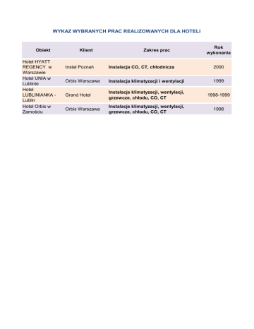 WYKAZ WYBRANYCH PRAC REALIZOWANYCH DLA HOTELI Obiekt Hotel HYATT REGENCY w Warszawie Hotel UNIA w Lublinie Hotel LUBLINIANKA Lublin Hotel Orbis w Zamościu Klient Zakres prac Rok wykonania Instal Poznań Instalacja CO, CT, chłodnicza 2000 Orbis Warszawa Instalacja klimatyzacji i wentylacji 1999 Grand Hotel Instalacje klimatyzacji, wentylacji, grzewcze, chłodu, CO, CT 1998-1999 Orbis Warszawa Instalacje klimatyzacji, wentylacji, grzewcze, chłodu, CO, CT 1998