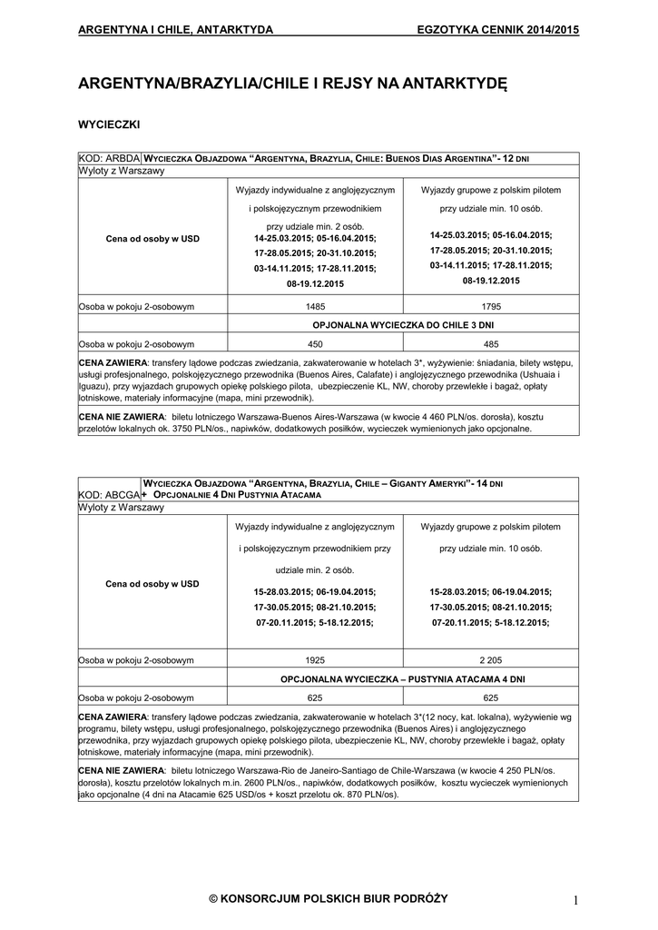 ARGENTYNA I CHILE, ANTARKTYDA EGZOTYKA CENNIK 2014/2015 ARGENTYNA/BRAZYLIA/CHILE I REJSY NA ANTARKTYDĘ WYCIECZKI KOD: ARBDA WYCIECZKA OBJAZDOWA “ARGENTYNA, BRAZYLIA, CHILE: BUENOS DIAS ARGENTINA”- 12 DNI Wyloty z Warszawy Cena od osoby w USD Osoba w pokoju 2-osobowym Wyjazdy indywidualne z anglojęzycznym Wyjazdy grupowe z polskim pilotem i polskojęzycznym przewodnikiem przy udziale min. 10 osób. przy udziale min. 2 osób. 14-25.03.2015; 05-16.04.2015; 14-25.03.2015; 05-16.04.2015; 17-28.05.2015; 20-31.10.2015; 17-28.05.2015; 20-31.10.2015; 03-14.11.2015; 17-28.11.2015; 03-14.11.2015; 17-28.11.2015; 08-19.12.2015 08-19.12.2015 1485 1795 OPJONALNA WYCIECZKA DO CHILE 3 DNI Osoba w pokoju 2-osobowym 450 485 CENA ZAWIERA: transfery lądowe podczas zwiedzania, zakwaterowanie w hotelach 3*, wyżywienie: śniadania, bilety wstępu, usługi profesjonalnego, polskojęzycznego przewodnika (Buenos Aires, Calafate) i anglojęzycznego przewodnika (Ushuaia i Iguazu), przy wyjazdach grupowych opiekę polskiego pilota, ubezpieczenie KL, NW, choroby przewlekłe i bagaż, opłaty lotniskowe, materiały informacyjne (mapa, mini przewodnik). CENA NIE ZAWIERA: biletu lotniczego Warszawa-Buenos Aires-Warszawa (w kwocie 4 460 PLN/os. dorosła), kosztu przelotów lokalnych ok. 3750 PLN/os., napiwków, dodatkowych posiłków, wycieczek wymienionych jako opcjonalne. WYCIECZKA OBJAZDOWA “ARGENTYNA, BRAZYLIA, CHILE – GIGANTY AMERYKI”- 14 DNI KOD: ABCGA + OPCJONALNIE 4 DNI PUSTYNIA ATACAMA Wyloty z Warszawy Wyjazdy indywidualne z anglojęzycznym Wyjazdy grupowe z polskim pilotem i polskojęzycznym przewodnikiem przy przy udziale min. 10 osób. udziale min. 2 osób. Cena od osoby w USD Osoba w pokoju 2-osobowym 15-28.03.2015; 06-19.04.2015; 15-28.03.2015; 06-19.04.2015; 17-30.05.2015; 08-21.10.2015; 17-30.05.2015; 08-21.10.2015; 07-20.11.2015; 5-18.12.2015; 07-20.11.2015; 5-18.12.2015; 1925 2 205 OPCJONALNA WYCIECZKA – PUSTYNIA ATACAMA 4 DNI Osoba w pokoju 2-osobowym 625 625 CENA ZAWIERA: transfery lądowe podczas zwiedzania, zakwaterowanie w hotelach 3*(12 nocy, kat. lokalna), wyżywienie wg programu, bilety wstępu, usługi profesjonalnego, polskojęzycznego przewodnika (Buenos Aires) i anglojęzycznego przewodnika, przy wyjazdach grupowych opiekę polskiego pilota, ubezpieczenie KL, NW, choroby przewlekłe i bagaż, opłaty lotniskowe, materiały informacyjne (mapa, mini przewodnik). CENA NIE ZAWIERA: biletu lotniczego Warszawa-Rio de Janeiro-Santiago de Chile-Warszawa (w kwocie 4 250 PLN/os. dorosła), kosztu przelotów lokalnych m.in. 2600 PLN/os., napiwków, dodatkowych posiłków, kosztu wycieczek wymienionych jako opcjonalne (4 dni na Atacamie 625 USD/os + koszt przelotu ok. 870 PLN/os). © KONSORCJUM POLSKICH BIUR PODRÓŻY 1 ARGENTYNA I CHILE, ANTARKTYDA KOD: ACPAT EGZOTYKA CENNIK 2014/2015 WYCIECZKA OBJAZDOWA “ARGENTYNA I CHILE – PATAGONIA TOUR”- 15 DNI + OPCJONALNIE 4 DNI WYSPA WIELKANOCNA Wyloty z Warszawy Cena od osoby w USD Wyjazdy indywidualne z anglojęzycznym Wyjazdy grupowe z polskim pilotem przy i polskojęzycznym przewodnikiem przy udziale min. 10 osób. udziale min. 2 osób 15-29.03.2015; 06-20.04.2015; 15-29.03.2015; 06-20.04.2015; 16-30.05.2015; 08-22.10.2015; 16-30.05.2015; 08-22.10.2015; 05-19.11.2015; 05-19.11.2015; Osoba w pokoju 2-osobowym 1989 2 405 OPCJONALNA WYCIECZKA – WYSPA WIELKANOCNA 4 DNI Osoba w pokoju 2-osobowym 600 600 CENA ZAWIERA: transfery lądowe podczas zwiedzania, zakwaterowanie w hotelach 3*(13 nocy, kat. Lokalna), wyżywienie wg programu, bilety wstępu, usługi profesjonalnego, polskojęzycznego przewodnika (Buenos Aires, Calafate) i anglojęzycznego przewodnika przy wyjazdach indywidualnych, przy wyjazdach grupowych opiekę polskiego pilota, ubezpieczenie KL, NW, choroby przewlekłe i bagaż, opłaty lotniskowe, materiały informacyjne (mapa, mini przewodnik). CENA NIE ZAWIERA: kosztu biletów : Warszawa- Buenos Aires-Santiago de Chile - Warszawa i przelotów lokalnych ok. 8000 PLN/os., napiwków, dodatkowych posiłków, kosztu wycieczek wymienionych jako opcjonalne (4 dni na Wyspie Wielkanocnej ok. 600 USD/os + koszt przelotu min. 1100 PLN/os). KOD: ARBUR WYCIECZKA OBJAZDOWA “ARGENTYNA, BRAZYLIA, URUGWAJ – NA STYKU KULTUR”- 13 DNI Wyloty z Warszawy Wyjazdy indywidualne z anglojęzycznym Wyjazdy grupowe z polskim pilotem i polskojęzycznym przewodnikiem przy udziale min. 10 osób. przy udziale min. 2 osób. Cena od osoby w USD Osoba w pokoju 2-osobowym 06-18.02.2015; 13-25.03.2015; 06-18.02.2015; 13-25.03.2015; 04-16.04.2015; 16-28.05.2015; 04-16.04.2015; 16-28.05.2015; 11-23.10.2015; 08-20.11.2015; 11-23.10.2015; 08-20.11.2015; 19.11.01.12.2015; 3-15.12.2015 19.11.01.12.2015; 3-15.12.2015 1945 2155 CENA ZAWIERA: transfery lądowe podczas zwiedzania, zakwaterowanie w hotelach 3*, wyżywienie: śniadania, bilety wstępu, bilety na promy, usługi profesjonalnego, polskojęzycznego przewodnika (Buenos Aires, Urugwaj) i anglojęzycznego przewodnika, polski pilot przy wyjazdach grupowych, ubezpieczenie KL, NW i bagażu, od chorób przewlekłych, opłaty lotniskowe, materiały informacyjne (mapa, mini przewodnik). CENA NIE ZAWIERA: kosztu biletu lotniczego Warszawa-Buenos Aires-Warszawa (w kwocie 4 460 PLN/os. dorosła), kosztu przelotów lokalnych ok. 2570 PLN/os., napiwków, dodatkowych posiłków, 2 © KONSORCJUM POLSKICH BIUR PODRÓŻY ARGENTYNA I CHILE, ANTARKTYDA EGZOTYKA CENNIK 2014/2015 KOD: ABPAR WYCIECZKA OBJAZDOWA “ARGENTYNA, BRAZYLIA, PARAGWAJ – TRZY KRAJE, JEDNA WODA”- 11 DNI Wyloty z Warszawy Wyjazdy indywidualne z anglojęzycznym przewodnikiem przy udziale min. 2 osób. Wyjazdy grupowe z polskim pilotem przy udziale min. 10 osób. 13-23.03.2015; 04-14.04.2015; Cena od osoby w USD 16-26.05.2015; 06-16.10.2015; 10-20.11.2015; 05-15.12.2015; 06-16.02.2015; 13-23.03.2015; 04-14.04.2015; 16-26.05.2015 Osoba w pokoju 2-osobowym 1845 2105 CENA ZAWIERA: transfery lądowe podczas zwiedzania, zakwaterowanie w hotelach 3* (9nocy, kat. 