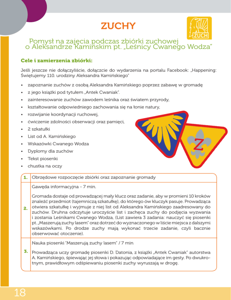 ZUCHY Pomysł na zajęcia podczas zbiórki zuchowej o Aleksandrze Kamińskim pt. „Leśnicy Cwanego Wodza” Cele i zamierzenia zbiórki: Jeśli jeszcze nie dołączyliście, dołączcie do wydarzenia na portalu Facebook: „Happening: Świętujemy 110. urodziny Aleksandra Kamińskiego” • zapoznanie zuchów z osobą Aleksandra Kamińskiego poprzez zabawę w gromadę • z jego książki pod tytułem „Antek Cwaniak”. • zainteresowanie zuchów zawodem leśnika oraz światem przyrody, • kształtowanie odpowiedniego zachowania się na łonie natury, • rozwijanie koordynacji ruchowej, • ćwiczenie zdolności obserwacji oraz pamięci, • 2 szkatułki • List od A. Kamińskiego • Wskazówki Cwanego Wodza • Dyplomy dla zuchów • Tekst piosenki • chustka na oczy 1. Obrzędowe rozpoczęcie zbiórki oraz zapoznanie gromady Gawęda informacyjna - 7 min. Gromada dostaje od prowadzącej mały klucz oraz zadanie, aby w promieni 10 kroków znaleźć przedmiot (tajemniczą szkatułkę), do którego ów kluczyk pasuje. Prowadząca 2. otwiera szkatułkę i wyjmuje z niej list od Aleksandra Kamińskiego zaadresowany do zuchów. Druhna odczytuje uroczyście list i zachęca zuchy do podjęcia wyzwania i zostania Leśnikami Cwanego Wodza, (List zawiera 3 zadania: nauczyć się piosenki pt. „Maszerują zuchy lasem” oraz dotrzeć do wyznaczonego w liście miejsca z dalszymi wskazówkami. Po drodze zuchy mają wykonać trzecie zadanie, czyli bacznie obserwować otoczenie). Nauka piosenki ”Maszerują zuchy lasem” / 7 min 3. Prowadząca uczy gromadę piosenki D. Datonia, z książki „Antek Cwaniak” autorstwa A. Kamińskiego, śpiewając jej słowa i pokazując odpowiadające im gesty. Po dwukrotnym, prawidłowym odśpiewaniu piosenki zuchy wyruszają w drogę. 18 KAMYK NA SZAŃCU Tekst piosenki ..Maszerują zuchy lasem” Maszeruj ą zuchy lasem, Słońce w górze lśni Przyśpiewują sobie czasem, Aby raźniej szli A pośród drzew, a pośród drzew Rozbrzmiewa ich radosny śpiew! / 2x Obserwacja podczas drogi do parku /10 min Każda szóstka w drodze do parku ma zwracać uwagę na szczegóły mijanego terenu. Zuchy mają policzyć poszczególne odległości w parokrokach, a także zapamiętać 4. charakterystyczne cechy terenu oraz przechodniów mijanych po drodze. Po dotarciu do miejsca wskazanego w liście Kamińskiego, prowadząca sprawdza, zadając zuchom odpowiednie pytania, która szóstka spisała się najlepiej w obserwacji otaczającego świata. Wskazówki Cwanego Wodza 7 min W miejscu wyznaczonym przez list Kamińskiego zuchy znajdują kolejną szkatułkę, 5. tym razem ze Wskazówkami Antka Cwaniaka, co do zadań, jakie należy wykonać, aby zostać prawdziwym Leśnikiem. Po przeczytaniu, przez jednego z zuchów, treści listu, gromada odśpiewuje poznaną wcześniej piosenkę (Wskazówki mówią o kolejnych 2 zadaniach: nauczyć się tropienia zwierzyny oraz znaleźć wyznaczone przez Cwanego Wodza przedmioty leśne. ) Tropienie /15 min Gromada siada w kręgu na trawie. W środku siedzi drużynowa z zakrytymi oczami. 6. Prowadząca zbiórkę stoi za kręgiem i po kolei wyznacza kolejne zuchy, które mają za zadanie podkraść się do osoby siedzącej w środku tak cicho, aby zdołać klepnąć ją w ramię, zanim ona wskaże źródło hałasu. Kiedy zuchowi uda się bezszelestnie podejść osobę siedzącą w środku kręgu, wymienia ją i zabawa trwa dalej. Poszukiwanie leśnych przedmiotów / 10 min Zuchy dostają 5 minut na znalezienie w okolicy 1 leśnego przedmiotu wydającego 7. dźwięk (trawa, szeleszczące liście, łamiące się gałązki itp) oraz 3 różnych liści drzew lub krzewów. Przed wyjściem prowadząca poucza gromadę, jak należy się zachowywać w parku oraz, że liście i przedmioty mają zbierać tylko z tych już leżących na ziemi. Po powrocie z poszukiwań zuchy demonstrują swoje przedmioty i wspólnie z druhnami nazywają przyniesione liście. Krąg Rady 8. Podsumowanie wszystkich zdań ze zbiórki oraz wspólne zastanowienie się nad cechami dobrego leśnika. Po skończeniu radzenia gromada odśpiewuje piosenkę zbiórkową. Powrót przed SP i obrzędowe zakończenie zbiórki 9. Po powrocie z parku prowadząca dziękuje zuchom za wspólna zabawę i rozdaje wszystkim dyplomy Leśników Cwanego Wodza. Następuję obrzędowe zakończenie zbiórki i rozejście się do domów. 19 Drogie Zuchy! Jeśli czytacie ten list to znaczy, że jakiś baczny obserwator poczynań waszej gromady uznał, że jesteście gotowi podjąć moje wyzwanie. Kiedy piszę te słowa jestem już wiekowym skautem, ale choć wiele lat minęło od czasu, kiedy zachwyciłem się ruchem zuchowym. Wciąż mam w pamięci te lata wspaniałej zabawy. Szczególnie warte zapamiętania były harce niepowtarzalnej gromady dh. Antka Cwaniakiewicza, która w zdobywaniu sprawności nia miała sobie równych. I właśnie po to, aby pamięć ich niezwykłych dokonań nie zanikła, zwracam się do wybranych gromad zuchowych naszego kraju, aby zmierzyły się ze swoimi słabościami i zdobybyły miano Leśników Cwanego Wódza. Aby udowodnić sobie i innym, że jesteście gotowi podjąć to wyzwanie musicie wykonać następujace zadania: 1. Nauczcie się śpiewać i pokazywać piosenkę “Maszerują zuchy lasem” 2.Odnajdźcie miejsce ukrycia szkatułki ze Wskazówkami Cwanego Wodza, która znajduje się w pobliskim parku koło dużej żółtej szkoły, przy sośnie oznaczonej szarfą. 3. Podczas drogi obserwujcie bacznie otoczenie. Zwróćcie uwagę szczwgólnie na mijanych przechodniów oraz charakterystyczne cechy terenu, a także policzcie pokonywanie przez was odległości w parokrokach. Życzę wam powodzenia w zmaganiach oraz zdobycia miana Leśników Cwanego Wodza, tak jak dwa pokolenia zuchów przed wami. Czuj! Aleksander Kamiński 20 KAMYK NA SZAŃCU Dzielne zuchy! Skoro dotarliście aż tutaj, prawidłowo wykonując powierzone wam zadania, znaczy to, że możecie przy