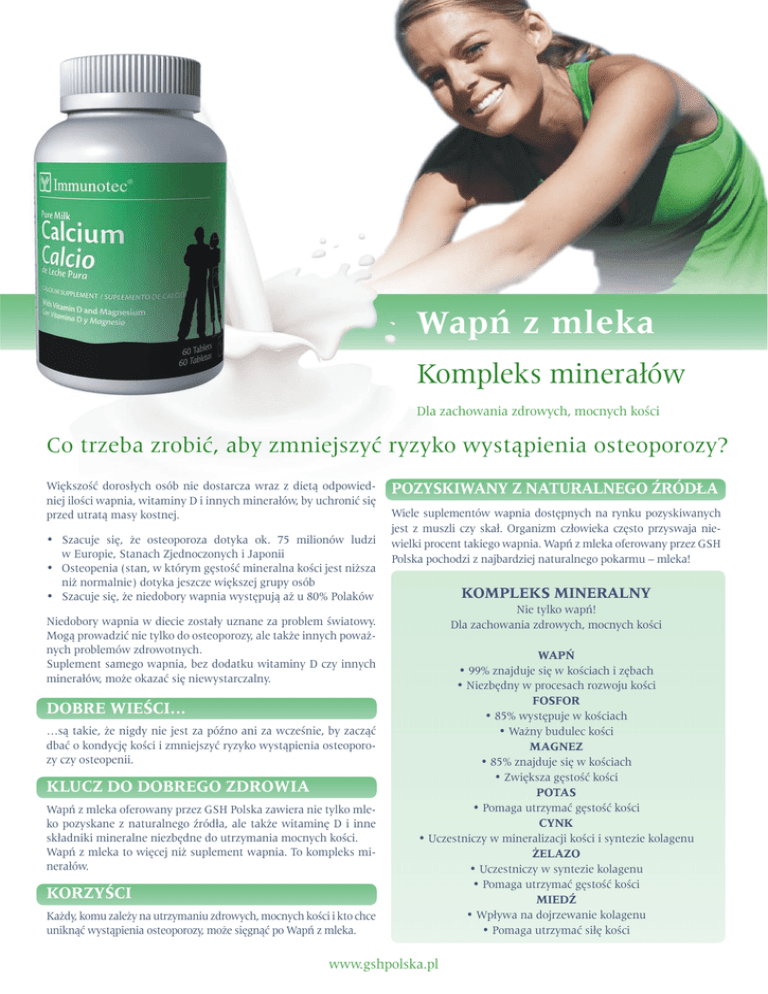 Wapń z mleka Kompleks minerałów Dla zachowania zdrowych, mocnych kości Co trzeba zrobić, aby zmniejszyć ryzyko wystąpienia osteoporozy? Większość dorosłych osób nie dostarcza wraz z dietą odpowiedniej ilości wapnia, witaminy D i innych minerałów, by uchronić się przed utratą masy kostnej. • • • Szacuje się, że osteoporoza dotyka ok. 75 milionów ludzi w Europie, Stanach Zjednoczonych i Japonii Osteopenia (stan, w którym gęstość mineralna kości jest niższa niż normalnie) dotyka jeszcze większej grupy osób Szacuje się, że niedobory wapnia występują aż u 80% Polaków Niedobory wapnia w diecie zostały uznane za problem światowy. Mogą prowadzić nie tylko do osteoporozy, ale także innych poważnych problemów zdrowotnych. Suplement samego wapnia, bez dodatku witaminy D czy innych minerałów, może okazać się niewystarczalny. DOBRE WIEŚCI… …są takie, że nigdy nie jest za późno ani za wcześnie, by zacząć dbać o kondycję kości i zmniejszyć ryzyko wystąpienia osteoporozy czy osteopenii. KLUCZ DO DOBREGO ZDROWIA Wapń z mleka oferowany przez GSH Polska zawiera nie tylko mleko pozyskane z naturalnego źródła, ale także witaminę D i inne składniki mineralne niezbędne do utrzymania mocnych kości. Wapń z mleka to więcej niż suplement wapnia. To kompleks minerałów. KORZYŚCI Każdy, komu zależy na utrzymaniu zdrowych, mocnych kości i kto chce uniknąć wystąpienia osteoporozy, może sięgnąć po Wapń z mleka. POZYSKIWANY Z NATURALNEGO ŹRÓDŁA Wiele suplementów wapnia dostępnych na rynku pozyskiwanych jest z muszli czy skał. Organizm człowieka często przyswaja niewielki procent takiego wapnia. Wapń z mleka oferowany przez GSH Polska pochodzi z najbardziej naturalnego pokarmu – mleka! KOMPLEKS MINERALNY Nie tylko wapń! Dla zachowania zdrowych, mocnych kości WAPŃ • 99% znajduje się w kościach i zębach • Niezbędny w procesach rozwoju kości FOSFOR • 85% występuje w kościach • Ważny budulec kości MAGNEZ • 85% znajduje się w kościach • Zwiększa gęstość kości POTAS • Pomaga utrzymać gęstość kości CYNK • Uczestniczy w mineralizacji kości i syntezie kolagenu ŻELAZO • Uczestniczy w syntezie kolagenu • Pomaga utrzymać gęstość kości MIEDŹ • Wpływa na dojrzewanie kolagenu • Pomaga utrzymać siłę kości www.gshpolska.pl