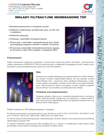 CERFILTR Urządzenia Filtracyjne 50-356 Wrocław, ul. Grunwaldzka 30a fax: (+48) 71 3282723; tel/fax: (+48) 71 3282800 e-mail: [email protected] www.cerfiltr.pl WKŁADY FILTRACYJNE MEMBRANOWE TSP ● Rzetelnie przetestowany w warunkach „in situ”. ● Możliwość wielokrotnego sterylizowania parą „in situ” lub w autoklawie. ● Możliwość sanityzacji. ● Wykonane z materiałów termozgrzewalnych. ● Wytworzone z materiałów rekomendowanych przez Komi- sję Europejską, mogących wchodzić w kontakt z żywnością. ● Wytworzone z materiałów rekomendowanych przez Agencję ds. Żywności i Leków (FDA) zgodnie z wymogami CFR21. Przeznaczenie Dzięki zastosowaniu unikatowej technologii i wykorzystaniu najwyższej jakości materiałów, wielowarstwowe wkłady membranowe STERYFLUS TSP są wykorzystywane w aplikacjach wymagających wody o bardzo wysokiej jakości: przemysł farmaceutyczny, spożywczy oraz browarnictwo. Opis Podstawowym medium filtrującym jest polieterosulfonowa (PES) membrana o bardzo wysokim współczynniku filtracji. Jest ona osłonięta warstwą mikrowłókniny boro - krzemowej, która zapobiega deformacjom i jednocześnie spełnia rolę prefiltra, chroniąc przed zanieczyszczeniami koloidalnymi. Wielowarstwowa budowa gwarantuje wysoką, stabilną wydajność procesu filtracji oraz przedłuża czas funkcjonowania wkładu. Produkcja oraz bezpieczeństwo Produkcja wkładów odbywa się w warunkach kontrolowanych i sterylnych. Każdy wkład przechodzi zintegrowany test jakościowy, a dopuszczalne limity zanieczyszczeń mikrobiologicznych są regularnie monitorowane przy pomocy testów bakteryjnych. Wkłady membranowe TSP spełniają następujące wymagania: W zakresie zastosowania w przemyśle spożywczym: Dyrektywy nr 82/711/ECC, 85/572/ECC, 89/109/ECC, 93/8/ ECC, 97/48/EC, 2001/61/EC, 2002/16/EC, 2002/72/EC oraz 2004/19/EC. W zakresie bezpieczeństwa biologicznego: media filtracyjne, elementy obudowy oraz skuteczność procesu filtracji odpowiadają wymogom USP. W zakresie standardów jakościowych: filtry produkowane są w oparciu o certyfikowany system jakości (QS), gwarantujący niezawodność technologii oraz rzetelność wyników testów. 4.12 CERFILTR Urządzenia Filtracyjne WKŁADY TSP MATERIAŁY KONSTRUKCYJNE SKUTECZNOŚĆ FILTRACJI Media filtrujące membrana polieterosulfonowa (PES) oraz mikrowłóknina boro krzemowa Osłona zewnętrzna polipropylen Osłona wewnętrzna polipropylen Rdzeń wewnętrzny polipropylen obudowa zewnętrzna polipropylen Nasadka/końcówka polipropylen kod produktu mikronaż [μm] zdolność zatrzymywania bakterii [>107 CFU/cm2] ZU 0,2 Brevundimonas diminuta ZR 0,45 Serratia marcescens Charakterystyka wkładów TSP 10" 0,35 ZU WARUNKI EKSPLOATACJI 0,30 maksymalnie 65°C dopuszczalny łączny czas sterylizacji parą wodną 20 godzin w 125°C, 40 godzin w 121°C w cyklach 30 minut sanityzacja gorącą wodą maksymalnie 80°C sanityzacja przy pomocy środków chemicznych możliwe stosowanie standardowych, dezynfekcyjnych środków chemicznych dopuszczalna różnica ciśnień maksymalnie 5,0 bar przy 25°C 0,05 rekomendowana różnica ciśnień 2,0 bar przy 25°C 0,00 rekomendowana objętość przepłukiwania 3 litry/wkład 10” Spadek ciśnienia [bar] dopuszczalna temperatura w pracy ciągłej 0,25 ZR 0,20 ZM 0,15 ZF 0,10 ZE 0 500 1000 1500 2000 Natężenie przepływu wody [l/godz.] Formuła zamawiania wkładów filtracyjnych: TSP - 207 Sposób mocowania DOE: oba końce otwarte, uszczelka płaska Kod 200 SOE: jedna końcówka otwarta z 1 Oringiem, druga zaślepiona 202 SOE: jedna końcówka otwarta z podwójnym O-ringiem 2.222”, druga zaślepiona 203 SOE: jedna końcówka otwarta z podwójnym O-ringiem 2.226” i zamknięciem z podwójnym bagnetem, druga zakończona statecznikiem 207 SOE: jedna końcówka otwarta z podwójnym O-ringiem 2.220”, druga zakończona statecznikiem 208 SOE: jedna końcówka otwarta z podwójnym O-ringiem 2.222” i zamknięciem z potrójnym bagnetem, druga zakończona statecznikiem 212 1- ZU - Kod Długość wkładu 1 10” 2 20” 3 30’’ 4 40’’ Mikronaż [μm] Kod 0,2 ZU 0,45 ZR 0,65 ZM 0,8 ZF 1,2 ZE Uszczelka PH - silikon standard brak na żądanie E teflon (tylko na żądanie dla kodu 200) T Kod Sposób pakowania brak Opakowanie pojedyncze M Opakowanie zbiorowe Kod Jakość produktu brak Bezpieczny biologicznie; przetestowany i przepłukany PH Bezpieczny biologicznie; przetestowany i odkażony, posiada certyfikat jakości z numerem seryjnym Kod EPDM M UZDATNIANIE WODY - SYSTEMY FILTRACYJNE DLA PRZEMYSŁU Produkcja: mikrofiltry, wkłady filtracyjne, złoża do usuwania żelaza i manganu, desorbery gazów, zestawy pompowe stałego ciśnienia, poziomu i przepływu. Handel: ozonatory, mikrofiltry, lampy UV, systemy odwróconej osmozy, automatyka przemysłowa, zawory wielodrożne Fleck-Siata, armatura przemysłowa, pompy. Usługi: projektowanie i wykonawstwo stacji usuwania: żelaza i manganu, zmiękczania, usuwania azotanów - azotynów, pierwiastków ciężkich, desorpcja gazów.