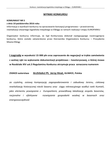 Konkurs: rewitalizacja kąpieliska miejskiego w Elblągu – EUROPARK I WYNIKI KONKURSU KOMUNIKAT NR 5 z dnia 10 października 2016 roku Informacja o wynikach konkursu na opracowanie koncepcji programowo – przestrzennej rewitalizacji otwartego kąpieliska miejskiego w Elblągu w ramach realizacji I etapu EUROPARKU Organizator konkursu informuje, że Sąd Konkursowy dokonał następującego rozstrzygnięcia konkursu, które zostało zatwierdzone przez Kierownika Organizatora Konkursu – Prezydenta Miasta Elbląg: I nagrodę w wysokości 15 000 pln oraz zaproszenie do negocjacji w trybie zamówienia z wolnej ręki na wykonanie dokumentacji projektowo – kosztorysowej, o której mowa w Rozdziale XIV ust.3 Regulaminu Konkursu otrzymuje praca oznaczona numerem 250423 autorstwa Architekci PL Jerzy Hnat, GLIWICE, Polska za czytelną, osiową kompozycję zagospodarowania i zabudowy terenu, ciekawą rewitalizację historycznej niecki basenu oraz ciągu rekreacyjnego wzdłuż rzeki Kumieli, jako elementu powiązania z Europarkiem, prawidłową lokalizację zespołu basenów, racjonalne i efektywne energooszczędność rozwiązanie gospodarki wodnej w basenach oraz Konkurs: rewitalizacja kąpieliska miejskiego w Elblągu – EUROPARK I ex aequo III nagrodę w wysokości po 10 000 pln otrzymują prace oznaczone numerami: 569882 autorstwa EURO-PROJEKT Grzegorz Latecki, ELBLĄG, Polska za szczególnie bogaty program funkcjonalno-użytkowy adresowany do różnych grup wiekowych, za oryginalną, pomysłową kompozycję zagospodarowania historycznej niecki basenu oraz wyróżniający się poziom projektu 167189 autorstwa AGS Architects International B.V., HEERLEN, Holandia za oryginalność i pomysłowość rozwiązań struktury funkcjonalno-przestrzennej, najciekawsze rozwiązanie zintegrowanych obszarów użyteczności publicznej, wysoki poziom architektury i urbanistyki 101100 autorstwa Maciej Kaufman, WARSZAWA, Polska Marcin Maraszek, WARSZAWA, Polska Tomasz Stanisławczyk, GDAŃSK, Polska za najciekawszą koncepcję krajobrazowo-urbanistyczną, integrację funkcji kąpieliska z terenem przyległym i obszarem Europarku, racjonalne rozwiązanie północnej pierzei niecki basenu Wyróżnienie honorowe otrzymuje praca oznaczona numerem 14079 autorstwa Only if Architecture, NOWY JORK, Stany Zjednoczone za nowatorski pomysł zagospodarowania historycznej niecki basenu, atrakcyjny, bardzo bogaty program funkcjonalno-użytkowy oraz profesjonalne rozwiązania technologiczne GRATULUJEMY!