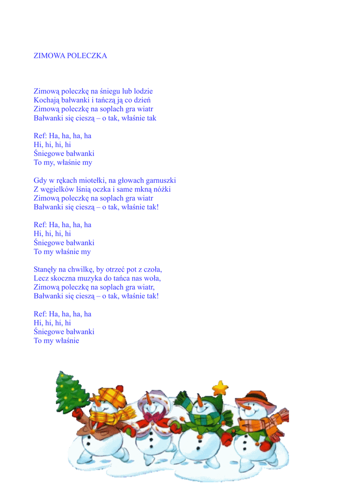 ZIMOWA POLECZKA Zimową poleczkę na śniegu lub lodzie Kochają bałwanki i tańczą ją co dzień Zimową poleczkę na soplach gra wiatr Bałwanki się cieszą – o tak, właśnie tak Ref: Ha, ha, ha, ha Hi, hi, hi, hi Śniegowe bałwanki To my, właśnie my Gdy w rękach miotełki, na głowach garnuszki Z węgielków lśnią oczka i same mkną nóżki Zimową poleczkę na soplach gra wiatr Bałwanki się cieszą – o tak, właśnie tak! Ref: Ha, ha, ha, ha Hi, hi, hi, hi Śniegowe bałwanki To my właśnie my Stanęły na chwilkę, by otrzeć pot z czoła, Lecz skoczna muzyka do tańca nas woła, Zimową poleczkę na soplach gra wiatr, Bałwanki się cieszą – o tak, właśnie tak! Ref: Ha, ha, ha, ha Hi, hi, hi, hi Śniegowe bałwanki To my właśnie