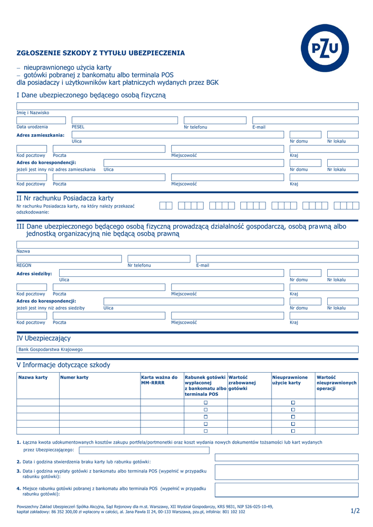 ZGŁOSZENIE SZKODY Z TYTUŁU UBEZPIECZENIA nieuprawnionego użycia karty gotówki pobranej z bankomatu albo terminala POS dla posiadaczy i użytkowników kart płatniczych wydanych przez BGK I Dane ubezpieczonego będącego osobą fizyczną Imię i Nazwisko Data urodzenia PESEL Nr telefonu E-mail Adres zamieszkania: Ulica Kod pocztowy Nr domu Poczta Miejscowość Nr lokalu Kraj Adres do korespondencji: jeżeli jest inny niż adres zamieszkania Kod pocztowy Ulica Nr domu Poczta Miejscowość Nr lokalu Kraj II Nr rachunku Posiadacza karty Nr rachunku Posiadacza karty, na który należy przekazać odszkodowanie: III Dane ubezpieczonego będącego osobą fizyczną prowadzącą działalność gospodarczą, osobą pra wną albo jednostką organizacyjną nie będącą osobą prawną Nazwa REGON Nr telefonu E-mail Adres siedziby: Ulica Kod pocztowy Nr domu Poczta Miejscowość Nr lokalu Kraj Adres do korespondencji: jeżeli jest inny niż adres siedziby Kod pocztowy Ulica Nr domu Poczta Miejscowość Nr lokalu Kraj IV Ubezpieczający Bank Gospodarstwa Krajowego V Informacje dotyczące szkody Nazwa karty Numer karty Karta ważna do MM-RRRR Rabunek gotówki Wartość wypłaconej zrabowanej z bankomatu albo gotówki terminala POS Nieuprawnione użycie karty Wartość nieuprawnionych operacji 1. Łączna kwota udokumentowanych kosztów zakupu portfela/portmonetki oraz koszt wydania nowych dokumentów tożsamości lub kart wydanych przez Ubezpieczającego: 2. Data i godzina stwierdzenia braku karty lub rabunku gotówki: 3. Data i godzina wypłaty gotówki z bankomatu albo terminala POS (wypełnić w przypadku rabunku gotówki): 4. Miejsce rabunku gotówki pobranej z bankomatu albo terminala POS (wypełnić w przypadku rabunku gotówki): Powszechny Zakład Ubezpieczeń Spółka Akcyjna, Sąd Rejonowy dla m.st. Warszawy, XII Wydział Gospodarczy, KRS 9831, NIP 526-025-10-49, kapitał zakładowy: 86 352 300,00 zł wpłacony w całości, al. Jana Pawła II 24, 00-133 Warszawa, pzu.pl, infolinia: 801 102 102 1/2 TAK NIE TAK NIE 7. Czy zdarzenie jest wynikiem umyślnego działania osób pozostających z Ubezpieczonym we wspólnym gospodarstwie domowym ? TAK NIE 8. Czy fakt stwierdzenia utraty karty został zgłoszony do Banku – kiedy? TAK NIE TAK NIE 5. Czy numer PIN był zapisany na karcie lub znajdował się w dokumentach utraconych razem z kartą? 6. Czy kradzież lub utrata dotyczy karty pozostawionej bez zabezpieczenia w ogólnie dostępnym miejscu publicznym? Jeśli tak, prosimy podać szczegóły w pkt 10 (wypełnić w przypadku nieuprawnionego użycia karty). Data/Godzina 9. Czy zdarzenie zgłoszono na Policję – kiedy? Data/Godzina 10. Szczegółowy i chronologiczny opis przebiegu zdarzenia: 11. Niniejszym informuję, że rabunek gotówki/straty finansowe wynikające z nieuprawnionego użycia karty* jest / nie jest* ubezpieczony w innym zakładzie ubezpieczeń; w przypadku zaznaczenia odpowiedzi „tak”, na podstawie przepisu art. 824 §2 Kodeksu cywilnego, prosimy o podanie następujących informacji: Nazwa i adres zakładu, w którym zawarto ubezpieczenie Nazwa ubezpieczenia Przedmiot ubezpieczenia Okres ochrony ubezpieczeniowej od Numer dokumentu ubezpieczenia (polisy): Rodzaj ryzyk (zdarzeń losowych) objętych ubezpieczeniem D D – M M – R R R R do D D – M M – R R R R Suma ubezpieczenia VI Informacja Podanie powyższych danych jest niezbędne do likwidacji przez PZU SA zgłaszanej szkody. Administratorem danych osobowych podanych w związku ze zgłosze niem szkody będzie Powszechny Zakład Ubezpieczeń Spółka Akcyjna z siedzibą 00-133 Warszawa, al. Jana Pawła II 24, w celu i zakresie realizacji umowy ubezpieczenia. Ma Pani/Pan prawo dostępu do swoich danych osobowych oraz ich poprawiania. Podanie powyższych danych jest dobrowolne, ale niezbędne do likwidacji zgłoszonej PZU SA szkody. VII Oświadczenie Oświadczam, iż wszystkie informacje podane przeze mnie w niniejszym formularzu są zgodne z prawdą. Ponadto upoważniam Bank Gospodarstwa Krajowego do udzielenia PZU SA, jako ubezpieczycielowi, wszelkich informacji, w tym informacji objętych tajemnicą bankową, dotyczących wymienionej w niniejszym wniosku karty, niezbędnych dla ustalenia prawa do żądanego odszkodowania, zawartych w szczególności w: Miejscowość, data wyciągu z rachunku posiadacza karty lub w zestawieniu operacji dokonanych przy użyciu karty, potwierdzeniu dokonania operacji pobrania gotówki z bankomatu, potwierdzeniu zgłoszenia Ubezpieczającemu utraty karty. Podpis Posiadacza karty Do wniosku powinny być załączone następujące dokumenty: a) w ubezpieczeniu nieuprawnionego użycia karty: miesięczny wyciąg lub zbiorcze zestawienie operacji z rachunku posiadacza karty, ze wskazaniem operacji dokonanych bez zgody i wiedzy po siadacza karty lub użytkownika karty, poświadczenie o zgłoszeniu zdarzenia ubezpieczeniowego wydane przez Policję, dokumenty potwierdzające poniesione przez Ubezpieczonego koszty zakupu nowego portfela, koszty wydania Ubezpieczonemu nowych dokumentów, na podstawie których można stwierdzić tożsamość Ubezpieczonego i koszty wydania nowych kart płatniczych, jeżeli dotyczy; b) w ubezpieczeniu gotówki pobranej z bankomatu albo terminala POS: poświadczenie o zgłoszeniu zdarzenia ubezpieczeniowego wydane przez Policję, dowód dokonania wypłaty gotówki z bankomatu albo terminala POS – wydruk z bankomatu albo terminala POS lub miesięczne zestawienie operacji, ze wskazaniem dnia, godziny, miejsca zdarzenia, dokumenty potwierdzające poniesione przez Ubezpieczonego koszty zakupu nowego portfela, koszty wydania Ubezpieczonemu nowych dokumentów, na podstawie których można stwierdzić tożsamość Ubezpieczonego i koszty wydania nowych kart płatniczych, jeżeli dotyczy. Wypełniony i podpisany formularz zgłoszenia szkody wraz z ww. dokumentami powinien zostać dostarczony do PZU SA na adres: Centrum Operacyjne Likwidacji Szkód i Świadczeń PZU SA 02-67