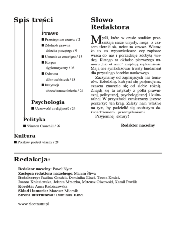 Spis treści Prawo ■ Przestępstwo czarów / 2 ■ Zdolność prawna dziecka poczętego / 9 ■ Uznanie za zmarłgeo / 13 ■ Korpus dyplomatyczny / 16 ■ Ochrona dóbr osobistych / 18 ■ Instytucja ubezwłasnowolnienia / 21 Psychologia ■ Uczciwość a religijność / 24 Polityka ■ Winston Churchill / 26 Słowo Redaktora M yśli, które w czasie studiów przesiąkają nasze umysły, mogą z czasem ulotnić się, uciec na zawsze. Wiemy, że to, co wypowiedziane czy zapisane wraca do nas i porządkuje zdobytą wiedzę. Dlatego na okładce pierwszego numeru „hic et nunc” znajdują się kamienie. Mają one symbolizować trwały fundament dla przyszłego dorobku naukowego. Zaczynamy od zajmujących nas tematów. Dziedziny, którymi się pasjonujemy, czasem znacznie się od siebie różnią. Znajdą się tu artykuły z półki prawniczej, politycznej, psychologicznej i kulturalnej. W przyszłości zamierzamy jeszcze poszerzyć ten krąg. Zależy nam właśnie na tym, by podzielić się osobistym doświadczeniem i przemyśleniami. Przyjemnej lektury! Redaktor naczelny Kultura ■ Polaków portret własny / 28 Redakcja: Redaktor naczelny: Paweł Nycz Zastępca redaktora naczelnego: Marcin Śliwa Redaktorzy: Paulina Gondek, Dominika Kinel, Teresa Kmieć, Joanna Kniaziowska, Jolanta Mroczka, Mateusz Olszewski, Kamil Pawlik Korekta: Anna Radziszewska Skład i łamanie: Mateusz Miernik Strona internetowa: Dominika Kinel www.hicetnunc.pl Prawo Przestępstwo czarów P Marcin Śliwa rzedmiotem niniejszej pracy będzie omówienie przestępstwa czarów ze szczególnym uwzględnieniem sprawy, toczącej się w XVII wieku w małopolskim mieście Biecz, przeciwko Gertrudzie Zagrodzkiej. Sprawa ta była już przedmiotem opracowania Mariana Mikołajczyka (pt. Jak obronić oskarżoną o czary. Mowy procesowe z 1655 roku w sprawie Gertrudy Zagrodzkiej), które w tejże pracy zostanie wykorzystane jako źródło wiedzy na temat czynów, jakich miała się dopuścić tytułowa mieszczka. Historia przestępstwa czarów jest bardzo długa. Sięga już czasów pierwszej znanej kodyfikacji, a więc Kodeksu Hammurabiego. Czyn ten opisywano też w Starym Testamencie. Kryminalizowało go również prawo rzymskie1 . Od początku wieków nowożytnych stało się przedmiotem zainteresowania europejskiego prawa karnego. Przyjmuje się, że procesy o czary zapoczątkowane zostały wskutek bulli Innocentego VIII Summis desiderantes, uznającej istnienie czarowniczej sekty2. W efekcie bardzo szybko zaczęło rozprzestrzeniać się zjawisko, określane powszechnie jako tzw. „polowanie na czarownice”. Gwoli ścisłości należy zaznaczyć, iż termin ten może wprowadzać pewne zamieszanie, gdyż nie dotyczył tylko i wyłącznie kobiet. Przedmiotem oskarżeń bywali również mężczyźni, choć liczba takich przypadków była zdecydowanie niższa3 . Wynikało to z obecnego od wieków średnich krzywdzącego 2 | www.hicetnunc.pl przekonania, iż kobieta ze swej natury jest istotą słabszego charakteru aniżeli mężczyzna, a w konsekwencji – łatwiejszym celem dla diabła4. Analizując przestępstwo czarów, warto odwołać się do językowego znaczenia tego pojęcia. Słownik języka polskiego przez „czar” rozumie „środek magiczny wywołujący nadzwyczajne zjawisko przypisywane działaniu sił nadprzyrodzonych” 5 . Kryminalizowane zachowanie w przypadku przestępstwa czarów miało więc sprowadzać się do działania w porozumieniu z siłami nieczystymi i ściągania za pomocą wymienionych magicznych środków różnego rodzaju nieszczęść na bliźnich, takich jak chociażby: choroby, śmierć i niepowodzenia6. Z uwagi na to czary uważane były nie tylko za grzech skierowany przeciwko wierze, ale również za czyn przestępczy7. Podstawę do ścigania czarownic dawały wierzenia ówczesnych ludzi, przekonanych o możliwości nawiązania przez człowieka osobistego kontaktu ze złym duchem8. Bez zagłębiania się w kwestie zasadności tego twierdzenia można przyjąć, że skala występowania tego przestępstwa sugeruje, iż w większości przypadków podstawą oskarżeń nie było jednak sprzymierzenie się z siłami nieczystymi, by szkodzić w ten sposób innym ludziom. Interesujących przykładów dostarcza w tej mierze publikacja T. Wiślicza, której przedmiotem jest proces o czary przed sądami wiejskimi9. Należy bowiem zwrócić uwagę, iż to głównie wiejskie kobiety oskarżane były o proceder czarów10. Najczęstszą grupę stanowiły czary polegające na szkodzeniu sąsiadom. Autor wspomina m.in., że dla rzucenia uroków na pole „wystarczyło chodzić po cudzych M. Śliwa polach w święto z rana, dając podobieństwo do czarów” (s. 56). Nierzadkie było też niszczenie w ten sposób wytwarzanych przez sąsiadów produktów. I tak „dzwonczychna, sołtyska kunkowska, została oskarżona o czary przez Jędrzeja Kocurzaka po tym, jak tylko w dom jego pewnego czasu przyszła pytając się o gorzałkę, jeśli się udaje, od tych czas zaraz wódka psować się mu poczęła” (s. 56) Podobna rzecz miała miejsce w sprawie przeciwko Kantorczynie oskarżonej przez szlachciankę, panią Rusicką, o psucie sera. Rozzłoszczona Rusicka wysłała jej zepsuty ser, grożąc, że jeśli ten się nie poprawi, odda kobietę katu. Według pani Kantorczyna zmartwiła się poważnie tą groźbą, gdyż ser się poprawił. „Zaprzestanie” czarów nie powstrzymało jednak szlachcianki od oskarżenia11 . Rzadszą grupę stanowiło szkodzenie zdrowiu. Wiślicz opisuje tu oskarżenie Oleny Baniaśki w Kilmkówce, przez wdowę po sołtysie o to, iż „nieboszczyka męża jej namówiła żeby przysiągł na nią, jako nie [jest] czarownica i gusłów nie umie. Co gdy nieboszczyk nie umiejąc się wymówić, uczynił i przysiągł, w tydzień po tym zaraz umarł z tey okazyjej” (s. 56–57). Do tego grona zaliczyć należy również sprawę Ewy Maksymowej, która zostawiła czary na ścieżce, 