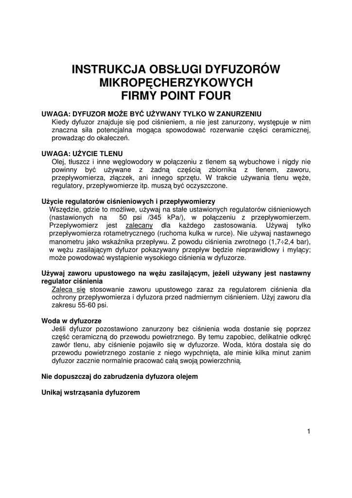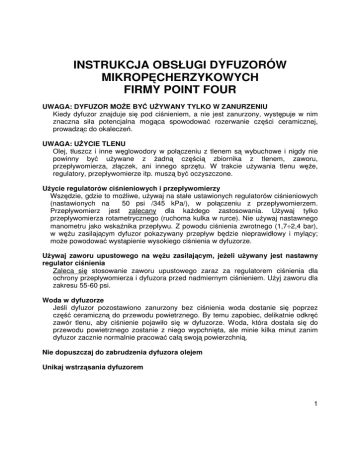 INSTRUKCJA OBSŁUGI DYFUZORÓW MIKROPĘCHERZYKOWYCH FIRMY POINT FOUR UWAGA: DYFUZOR MOŻE BYĆ UŻYWANY TYLKO W ZANURZENIU Kiedy dyfuzor znajduje się pod ciśnieniem, a nie jest zanurzony, występuje w nim znaczna siła potencjalna mogąca spowodować rozerwanie części ceramicznej, prowadząc do okaleczeń. UWAGA: UŻYCIE TLENU Olej, tłuszcz i inne węglowodory w połączeniu z tlenem są wybuchowe i nigdy nie powinny być używane z żadną częścią zbiornika z tlenem, zaworu, przepływomierza, złączek, ani innego sprzętu. W trakcie używania tlenu węże, regulatory, przepływomierze itp. muszą być oczyszczone. Użycie regulatorów ciśnieniowych i przepływomierzy Wszędzie, gdzie to możliwe, używaj na stałe ustawionych regulatorów ciśnieniowych (nastawionych na 50 psi /345 kPa/), w połączeniu z przepływomierzem. Przepływomierz jest zalecany dla każdego zastosowania. Używaj tylko przepływomierza rotametrycznego (ruchoma kulka w rurce). Nie używaj nastawnego manometru jako wskaźnika przepływu. Z powodu ciśnienia zwrotnego (1,7÷2,4 bar), w wężu zasilającym dyfuzor pokazywany przepływ będzie nieprawidłowy i mylący; może powodować wystąpienie wysokiego ciśnienia w dyfuzorze. Używaj zaworu upustowego na wężu zasilającym, jeżeli używany jest nastawny regulator ciśnienia Zaleca się stosowanie zaworu upustowego zaraz za regulatorem ciśnienia dla ochrony przepływomierza i dyfuzora przed nadmiernym ciśnieniem. Użyj zaworu dla zakresu 55-60 psi. Woda w dyfuzorze Jeśli dyfuzor pozostawiono zanurzony bez ciśnienia woda dostanie się poprzez część ceramiczną do przewodu powietrznego. By temu zapobiec, delikatnie odkręć zawór tlenu, aby ciśnienie pojawiło się w dyfuzorze. Woda, która dostała się do przewodu powietrznego zostanie z niego wypchnięta, ale minie kilka minut zanim dyfuzor zacznie normalnie pracować całą swoją powierzchnią. Nie dopuszczaj do zabrudzenia dyfuzora olejem Unikaj wstrząsania dyfuzorem 1 INSTALACJA W celu uniknięcia łączenia się pęcherzyków ułóż dyfuzor poziomo. Im głębiej będzie zanurzony, tym efektywniej będzie działał. Zamocuj dyfuzor za pomocą „rzepów”, silikonu lub śrub, ale nie dokręcaj ich zbyt mocno. Stosuj 6-mm wężyk z mosiężną lub plastikową armaturą. Stosuj taśmę teflonową lub gwintowane łączniki rur. Dowolna liczba dyfuzorów może być podłączona do wspólnego węża zasilającego. Doprowadzane ciśnienie nie może przekroczyć 50 psi (3,5 bar). Stosuj regulatory ustawione na stałe ciśnienie (50 psi) i przepływomierze o kompensowanym nadciśnieniu wraz z manometrem do kontroli przepływu. Alternatywnie (nie polecane) zastosować można nastawny manometr, koniecznie z zaworem upustowym ustawionym na 50 psi. URUCHAMIANIE Upewnij się, że ciśnienie dochodzące do dyfuzora nie przekracza 50 psi (3,5 bar). Uruchamiaj dyfuzor tylko jeśli jest zanurzony. Odkręć butlę z gazem i kontroluj przepływ gazu za pomocą przepływomierza. Jeśli używany jest nastawny regulator ciśnienia upewnij się, że jest on w pozycji zamkniętej (pokrętło jest całkowicie „wykręcone”, przeciwnie do ruchu wskazówek zegara) zanim odkręcisz gaz. Wolno zwiększ ciśnienie do żądanego zazwyczaj 20÷30 psi (1,5÷2,0 bar) - przez obrót pokrętła zgodnie z ruchem wskazówek zegara. Dyfuzor zacznie pracować normalnie z pewnym opóźnieniem, zwłaszcza gdy do części ceramicznej dostała się woda. Mosiężne złączki do dyfuzorów MBD600 i MBD300 2 Zalecane (po prawej stronie) i nie zalecane (po lewej) kombinacje regulatorów ciśnienia używane do zaopatrzenia w tlen dyfuzorów mikropęcherzykowych 3 KONSERWACJA Jedynym zabiegiem konserwacyjnym jest okresowe czyszczenie, zapewniające równomierną pracę całej powierzchni dyfuzora. Zabrudzenie lub zatkanie dyfuzora uwidacznia się poprzez zauważalny spadek przepływu gazu w porównaniu do wartości pierwotnie ustawionych na przepływomierzu. Spadek wydajności pracy spowodowany powolnym zatykaniem się dyfuzora może być kompensowany podwyższeniem ciśnienia gazu dochodzącego, ale wartość ta nie może przekroczyć 50 psi (3,5 bar). Częstotliwość czyszczenia dyfuzora zależy od warunków, w jakich urządzenie pracuje. Metody czyszczenia: 1. Podstawowe: przetrzyj powierzchnię szczotką o twardym włosiu lub umyj wodą pod ciśnieniem, aby pozbyć się szlamu i drobnych zanieczyszczeń. 2. Czyszczenie zatkanego dyfuzora: wysusz dyfuzor i przeszlifuj go papierem ściernym nr 40. W większości przypadków udrożni to dyfuzor. Jeśli tak się nie stanie, powtórz czynność lub zastosuj czyszczenie kwasem. 3. Czyszczenie kwasem: Może się zdarzyć, że czyszczenie papierem ściernym nie przynosi pożądanego efektu i konieczne jest użycie kwasu. Wysusz dyfuzor i ułóż go poziomo. Za pomocą kitu okiennego lub podobnej substancji stwórz ściankę po obrysie części ceramicznej dyfuzora. Zastosuj 10% roztwór kwasu solnego (HCI), wylewając go na powierzchnię dyfuzora i pozwól mu wsiąknąć. Kontynuuj, aż do zalania dyfuzora warstwą ok. 3 mm powyżej jego powierzchni. Pozostaw na 12 godzin, spłucz czystą wodą i napowietrzaj przez 15 minut, do całkowitego usunięcia kwasu i uzyskania równomiernego rozkładu pęcherzyków na całej powierzchni dyfuzora. Jeśli dyfuzor nie został całkowicie oczyszczony za pierwszym razem, konieczne może być powtórzenie procedury. Dezynfekcja Zanurz cały dyfuzor w środku dezynfekującym. Może to zabarwić część ceramiczną, ale nie wpłynie na działanie dyfuzora. Przechowywanie Nie używany dyfuzor powinien być wyczyszczony i przechowywany w stanie suchym. 4 NAPRAWY Pęknięcia i ubytki Może się zdarzyć, że pod wpływem nadmiernego ciśnienia lub nieostrożnego stosowania płytka ceramiczna pęknie lub odłamie się. W wielu przypadkach dyfuzor może być naprawiony. Co może być naprawione Jeśli pęknięcie jest wzdłużne - na środku, czy po b