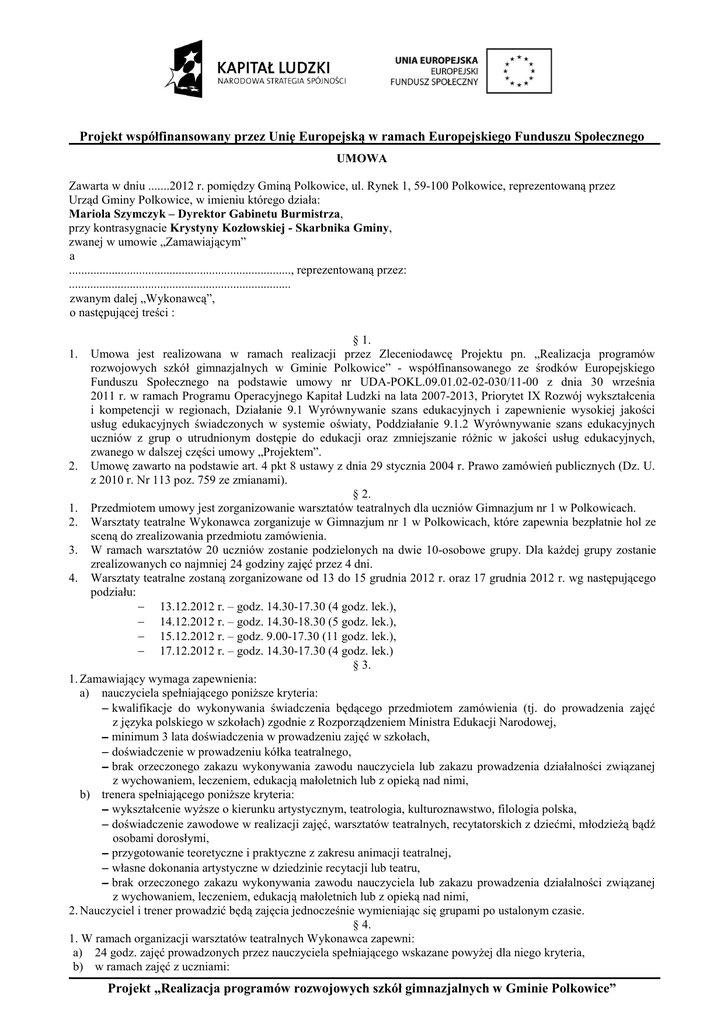 Projekt współfinansowany przez Unię Europejską w ramach Europejskiego Funduszu Społecznego UMOWA Zawarta w dniu .......2012 r. pomiędzy Gminą Polkowice, ul. Rynek 1, 59-100 Polkowice, reprezentowaną przez Urząd Gminy Polkowice, w imieniu którego działa: Mariola Szymczyk – Dyrektor Gabinetu Burmistrza, przy kontrasygnacie Krystyny Kozłowskiej - Skarbnika Gminy, zwanej w umowie „Zamawiającym” a ........................................................................., reprezentowaną przez: ......................................................................... zwanym dalej „Wykonawcą”, o następującej treści : § 1. Umowa jest realizowana w ramach realizacji przez Zleceniodawcę Projektu pn. „Realizacja programów rozwojowych szkół gimnazjalnych w Gminie Polkowice” - współfinansowanego ze środków Europejskiego Funduszu Społecznego na podstawie umowy nr UDA-POKL.09.01.02-02-030/11-00 z dnia 30 września 2011 r. w ramach Programu Operacyjnego Kapitał Ludzki na lata 2007-2013, Priorytet IX Rozwój wykształcenia i kompetencji w regionach, Działanie 9.1 Wyrównywanie szans edukacyjnych i zapewnienie wysokiej jakości usług edukacyjnych świadczonych w systemie oświaty, Poddziałanie 9.1.2 Wyrównywanie szans edukacyjnych uczniów z grup o utrudnionym dostępie do edukacji oraz zmniejszanie róŜnic w jakości usług edukacyjnych, zwanego w dalszej części umowy „Projektem”. 2. Umowę zawarto na podstawie art. 4 pkt 8 ustawy z dnia 29 stycznia 2004 r. Prawo zamówień publicznych (Dz. U. z 2010 r. Nr 113 poz. 759 ze zmianami). § 2. 1. Przedmiotem umowy jest zorganizowanie warsztatów teatralnych dla uczniów Gimnazjum nr 1 w Polkowicach. 2. Warsztaty teatralne Wykonawca zorganizuje w Gimnazjum nr 1 w Polkowicach, które zapewnia bezpłatnie hol ze sceną do zrealizowania przedmiotu zamówienia. 3. W ramach warsztatów 20 uczniów zostanie podzielonych na dwie 10-osobowe grupy. Dla kaŜdej grupy zostanie zrealizowanych co najmniej 24 godziny zajęć przez 4 dni. 4. Warsztaty teatralne zostaną zorganizowane od 13 do 15 grudnia 2012 r. oraz 17 grudnia 2012 r. wg następującego podziału: − 13.12.2012 r. – godz. 14.30-17.30 (4 godz. lek.), − 14.12.2012 r. – godz. 14.30-18.30 (5 godz. lek.), − 15.12.2012 r. – godz. 9.00-17.30 (11 godz. lek.), − 17.12.2012 r. – godz. 14.30-17.30 (4 godz. lek.) § 3. 1. Zamawiający wymaga zapewnienia: a) nauczyciela spełniającego poniŜsze kryteria: − kwalifikacje do wykonywania świadczenia będącego przedmiotem zamówienia (tj. do prowadzenia zajęć z języka polskiego w szkołach) zgodnie z Rozporządzeniem Ministra Edukacji Narodowej, − minimum 3 lata doświadczenia w prowadzeniu zajęć w szkołach, − doświadczenie w prowadzeniu kółka teatralnego, − brak orzeczonego zakazu wykonywania zawodu nauczyciela lub zakazu prowadzenia działalności związanej z wychowaniem, leczeniem, edukacją małoletnich lub z opieką nad nimi, b) trenera spełniającego poniŜsze kryteria: − wykształcenie wyŜsze o kierunku artystycznym, teatrologia, kulturoznawstwo, filologia polska, − doświadczenie zawodowe w realizacji zajęć, warsztatów teatralnych, recytatorskich z dziećmi, młodzieŜą bądź osobami dorosłymi, − przygotowanie teoretyczne i praktyczne z zakresu animacji teatralnej, − własne dokonania artystyczne w dziedzinie recytacji lub teatru, − brak orzeczonego zakazu wykonywania zawodu nauczyciela lub zakazu prowadzenia działalności związanej z wychowaniem, leczeniem, edukacją małoletnich lub z opieką nad nimi, 2. Nauczyciel i trener prowadzić będą zajęcia jednocześnie wymieniając się grupami po ustalonym czasie. § 4. 1. W ramach organizacji warsztatów teatralnych Wykonawca zapewni: a) 24 godz. zajęć prowadzonych przez nauczyciela spełniającego wskazane powyŜej dla niego kryteria, b) w ramach zajęć z uczniami: 1. Projekt „Realizacja programów rozwojowych szkół gimnazjalnych w Gminie Polkowice” Projekt współfinansowany przez Unię Europejską w ramach Europejskiego Funduszu Społecznego − pracę nad poprawnym mówieniem tekstu (ćwiczenia na dykcję/dzielenie długich wyrazów, zabawy z lustrem, korkiem), − ćwiczenie ruchu scenicznego poprzez zabawę, − badanie pozycji ruchu w przestrzeni scenicznej, − zabawy kształcące pracę zespołową, − próbę przedstawienia opracowanego podczas warsztatów (połączenie gry aktorskiej z muzyką i światłem), c) wyposaŜenie uczniów w niezbędne do przeprowadzenia ćwiczeń i spektaklu rekwizyty: − 10 szt. czarnych koszulek, − 6 szt. czarnych legginsów, − 30 m czarnej tkaniny, − 1 białe prześcieradło, − 5 szt. latarek, d) wyŜywienie – kaŜdego dnia ciastka, napoje w ilości 1 l na osobę dziennie (np. woda, soki, kawa, herbata), jeden ciepły posiłek dla kaŜdego uczestnika kaŜdego dnia (np. pizza). 2. W ramach wynagrodzenia trenera Wykonawca zapewni: a) 24 godz. zajęć prowadzonych przez trenera spełniającego wskazane powyŜej dla niego kryteria, b) w ramach zajęć z uczniami: − zabawy i ćwiczenia parateatralne integrujące zespół, − doskonalenie umiejętności regulowania oddechu i prawidłowej emisji głosu, − zabawy oparte na grze wyobraźni i skojarzeń, − zabawy z rekwizytami i elementami scenografii, − praca nad ruchem, mimiką, gestem, − indywidualne i zbiorowe etiudy twórcze, − na koniec warsztatów – scalenie opracowanych scen w całość (próba przedstawienia). 3. W ramach warsztatów teatralnych zakłada się osiągnięcie następujących celów warsztatów: − rozwój wraŜliwości estetycznej i świadomości teatralnej (artyzm, przeŜycie artystyczne), − rozbudzenie teatralnych zainteresowań uczniów, − rozwój umiejętności czystej, wyraźnej mowy: praca nad poprawną dykcją, akcentem, rytmem, tempem, intonacją, modulacja głosu, wyraŜaniem emocji, − zdobycie ogólnej wiedzy teoretycznej dotyczącej teatru (punktem odnie