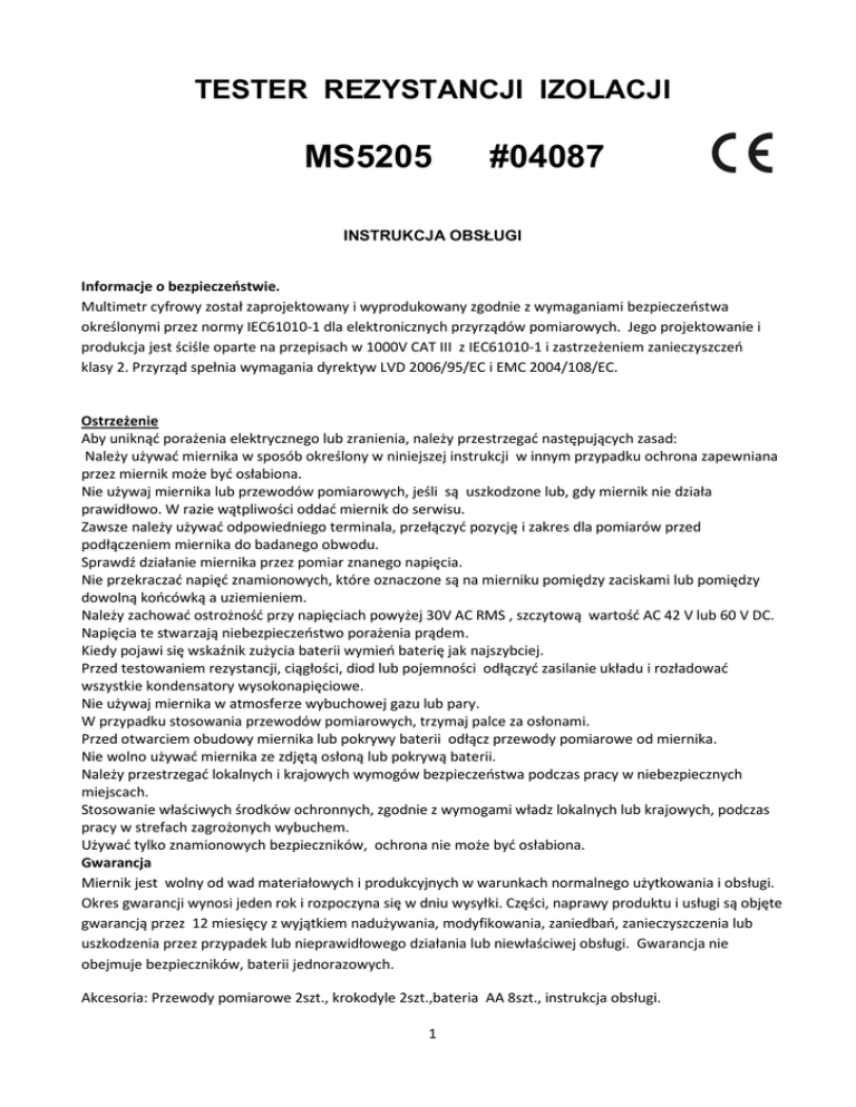 TESTER REZYSTANCJI IZOLACJI MS5205 #04087 INSTRUKCJA OBSŁUGI Informacje o bezpieczeństwie. Multimetr cyfrowy został zaprojektowany i wyprodukowany zgodnie z wymaganiami bezpieczeństwa określonymi przez normy IEC61010-1 dla elektronicznych przyrządów pomiarowych. Jego projektowanie i produkcja jest ściśle oparte na przepisach w 1000V CAT III z IEC61010-1 i zastrzeżeniem zanieczyszczeń klasy 2. Przyrząd spełnia wymagania dyrektyw LVD 2006/95/EC i EMC 2004/108/EC. Ostrzeżenie Aby uniknąć porażenia elektrycznego lub zranienia, należy przestrzegać następujących zasad: Należy używać miernika w sposób określony w niniejszej instrukcji w innym przypadku ochrona zapewniana przez miernik może być osłabiona. Nie używaj miernika lub przewodów pomiarowych, jeśli są uszkodzone lub, gdy miernik nie działa prawidłowo. W razie wątpliwości oddać miernik do serwisu. Zawsze należy używać odpowiedniego terminala, przełączyć pozycję i zakres dla pomiarów przed podłączeniem miernika do badanego obwodu. Sprawdź działanie miernika przez pomiar znanego napięcia. Nie przekraczać napięć znamionowych, które oznaczone są na mierniku pomiędzy zaciskami lub pomiędzy dowolną końcówką a uziemieniem. Należy zachować ostrożność przy napięciach powyżej 30V AC RMS , szczytową wartość AC 42 V lub 60 V DC. Napięcia te stwarzają niebezpieczeństwo porażenia prądem. Kiedy pojawi się wskaźnik zużycia baterii wymień baterię jak najszybciej. Przed testowaniem rezystancji, ciągłości, diod lub pojemności odłączyć zasilanie układu i rozładować wszystkie kondensatory wysokonapięciowe. Nie używaj miernika w atmosferze wybuchowej gazu lub pary. W przypadku stosowania przewodów pomiarowych, trzymaj palce za osłonami. Przed otwarciem obudowy miernika lub pokrywy baterii odłącz przewody pomiarowe od miernika. Nie wolno używać miernika ze zdjętą osłoną lub pokrywą baterii. Należy przestrzegać lokalnych i krajowych wymogów bezpieczeństwa podczas pracy w niebezpiecznych miejscach. Stosowanie właściwych środków ochronnych, zgodnie z wymogami władz lokalnych lub krajowych, podczas pracy w strefach zagrożonych wybuchem. Używać tylko znamionowych bezpieczników, ochrona nie może być osłabiona. Gwarancja Miernik jest wolny od wad materiałowych i produkcyjnych w warunkach normalnego użytkowania i obsługi. Okres gwarancji wynosi jeden rok i rozpoczyna się w dniu wysyłki. Części, naprawy produktu i usługi są objęte gwarancją przez 12 miesięcy z wyjątkiem nadużywania, modyfikowania, zaniedbań, zanieczyszczenia lub uszkodzenia przez przypadek lub nieprawidłowego działania lub niewłaściwej obsługi. Gwarancja nie obejmuje bezpieczników, baterii jednorazowych. Akcesoria: Przewody pomiarowe 2szt., krokodyle 2szt.,bateria AA 8szt., instrukcja obsługi. 1 Panel przedni. 1. 2. 3. 4. Wyświetlacz Przycisk Przełącznik obrotowy Przycisk Wyświetlacz. 1. Linijka analogowa (Bargraf) 2. wyświetlacz główny; 3. wyświetlacz pomocniczy Niski poziom naładowania baterii. Wskazuje, kiedy nadszedł czas, aby wymienić baterię. Aby uniknąć błędnych odczytów, które mogłyby doprowadzić do porażenia prądem lub obrażeń ciała, wymienić baterię, jak tylko pojawi się wskaźnik niskiego poziomu baterii. LOCK Wskazuje blokadę zostanie zastosowana po ponownym naciśnięciu przycisku HOLD/LOCK, blokada działa do momentu ponownego naciśnięcia przycisku MEASURE. HOLD Zatrzymanie wyniku, tester nie aktualizuje pomiaru. COMP Porównuje wybrane funkcje. PASS Wyświetla się ten znak, jeżeli wybrano funkcję porównania, gdy wartość mierzona znajduje się między górną i dolną wartością graniczną. REL Wybrano funkcję pomiarów względnych. DAR Wartość współczynnika absorpcji w trybie testu izolacji . PI Wartość wskaźnika polaryzacji w trybie testu izolacji. TIMER Aktywna funkcja timera. MEMO Wprowadzanie danych do pamięci . READ Przegląd danych w pamięci, gdy dane nie są prawidłowe ukaże się - ---. DC Pomiar napięć stałych DC AC Pomiar napięć zmiennych AC VDC W trybie testu izolacji wskazuje napięcie probiercze. Minus, gdy mierzona wartość poniżej zera 2 W trybie testu izolacji wskazuje przepełnienie. Ostrzeżenie Niebezpieczne Napięcie. W trybie testu izolacji, wykryto na zaciskach wejściowych przekraczające 20V. Test ciągłości obwodu Wybrano funkcję automatycznego wyłączenia testera Obecność napięcia probierczego Wartość napięcia probierczego. Wskazanie timera. Wskazania multimetru. Wartość max, min, średnia batt Pojawia się na wyświetlaczu głównym, wskazuje, że bateria jest rozładowana. bat Pojawia się na wyświetlacz pomocniczym , zbyt niski poziom baterii aby wykonać test izolacji. PrES Ustawienie wartości (np. czasu) POFF Funkcja Auto Power Off jest wyłączona. LIVE W trybie testu izolacji wykryto napięcie na zaciskach wejściowych. DISC W trybie testu izolacji, miernik wykonuje funkcję auto rozładowania DISC, Nie dotykać żadnych zacisków wejściowych w tym trybie. SAVE Zapamiętanie danych . dEL n: Kasowanie danych w pamięci. COMP Hi Przekroczona górna wartość graniczna. COMP Lo Poniżej dolnej wartości granicznej. ----COMP Nieprawidłowa wartość graniczna. Funkcja beep wyłączona. Przyciski 3 1. Aktywacja funkcji przechowywania danych pomiarowych w pamięci. 2. Aktywacja funkcji odczytu, aby korzystać ze składu danych w pamięci.; zmiana pozycji kursora. 3. 1: w trybie multimetru DCV i ACV przełączanie wyświetlania wartość max, wartość min, wartość średnia, górna i dolana wartość graniczna, wartość względna. 2: w trybie testu izolacji przełączanie aby wyświetlić wartość max / min / średnią, górną i dolną wartość graniczną, ustawienie timera, współczynnik DAR, PI 4. Przycisk zatwierdzania. 5. Podświetlenie wyświetlacza na 10 sekund. 6. Aktywacja funkcji timer. 7. Aktywacja funkcji HOLD w trybie multimetru (dla