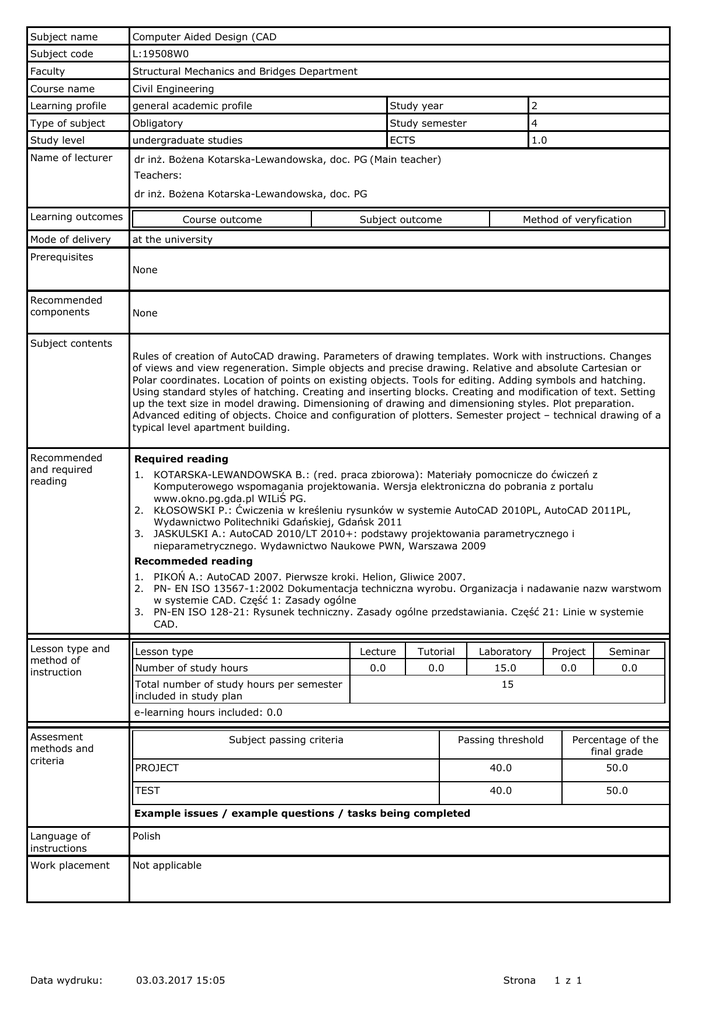 Subject name Computer Aided Design (CAD Subject code L:19508W0 Faculty Structural Mechanics and Bridges Department Course name Civil Engineering Learning profile general academic profile Study year 2 Type of subject Obligatory Study semester 4 Study level undergraduate studies ECTS 1.0 Name of lecturer dr inż. Bożena Kotarska-Lewandowska, doc. PG (Main teacher) Teachers: dr inż. Bożena Kotarska-Lewandowska, doc. PG Learning outcomes Mode of delivery Course outcome Subject outcome Method of veryfication at the university Prerequisites None Recommended components None Subject contents Rules of creation of AutoCAD drawing. Parameters of drawing templates. Work with instructions. Changes of views and view regeneration. Simple objects and precise drawing. Relative and absolute Cartesian or Polar coordinates. Location of points on existing objects. Tools for editing. Adding symbols and hatching. Using standard styles of hatching. Creating and inserting blocks. Creating and modification of text. Setting up the text size in model drawing. Dimensioning of drawing and dimensioning styles. Plot preparation. Advanced editing of objects. Choice and configuration of plotters. Semester project – technical drawing of a typical level apartment building. Recommended and required reading Required reading 1. 2. 3. KOTARSKA-LEWANDOWSKA B.: (red. praca zbiorowa): Materiały pomocnicze do ćwiczeń z Komputerowego wspomagania projektowania. Wersja elektroniczna do pobrania z portalu www.okno.pg.gda.pl WILiŚ PG. KŁOSOWSKI P.: Ćwiczenia w kreśleniu rysunków w systemie AutoCAD 2010PL, AutoCAD 2011PL, Wydawnictwo Politechniki Gdańskiej, Gdańsk 2011 JASKULSKI A.: AutoCAD 2010/LT 2010+: podstawy projektowania parametrycznego i nieparametrycznego. Wydawnictwo Naukowe PWN, Warszawa 2009 Recommeded reading 1. 2. 3. Lesson type and method of instruction PIKOŃ A.: AutoCAD 2007. Pierwsze kroki. Helion, Gliwice 2007. PN- EN ISO 13567-1:2002 Dokumentacja techniczna wyrobu. Organizacja i nadawanie nazw warstwom w systemie CAD. Część 1: Zasady ogólne PN-EN ISO 128-21: Rysunek techniczny. Zasady ogólne przedstawiania. Część 21: Linie w systemie CAD. Lesson type Number of study hours Lecture Tutorial Laboratory Project Seminar 0.0 0.0 15.0 0.0 0.0 Total number of study hours per semester included in study plan 15 e-learning hours included: 0.0 Assesment methods and criteria Subject passing criteria Passing threshold Percentage of the final grade PROJECT 40.0 50.0 TEST 40.0 50.0 Example issues / example questions / tasks being completed Language of instructions Polish Work placement Not applicable Data wydruku: 03.03.2017 15:05 Strona 1 z 1