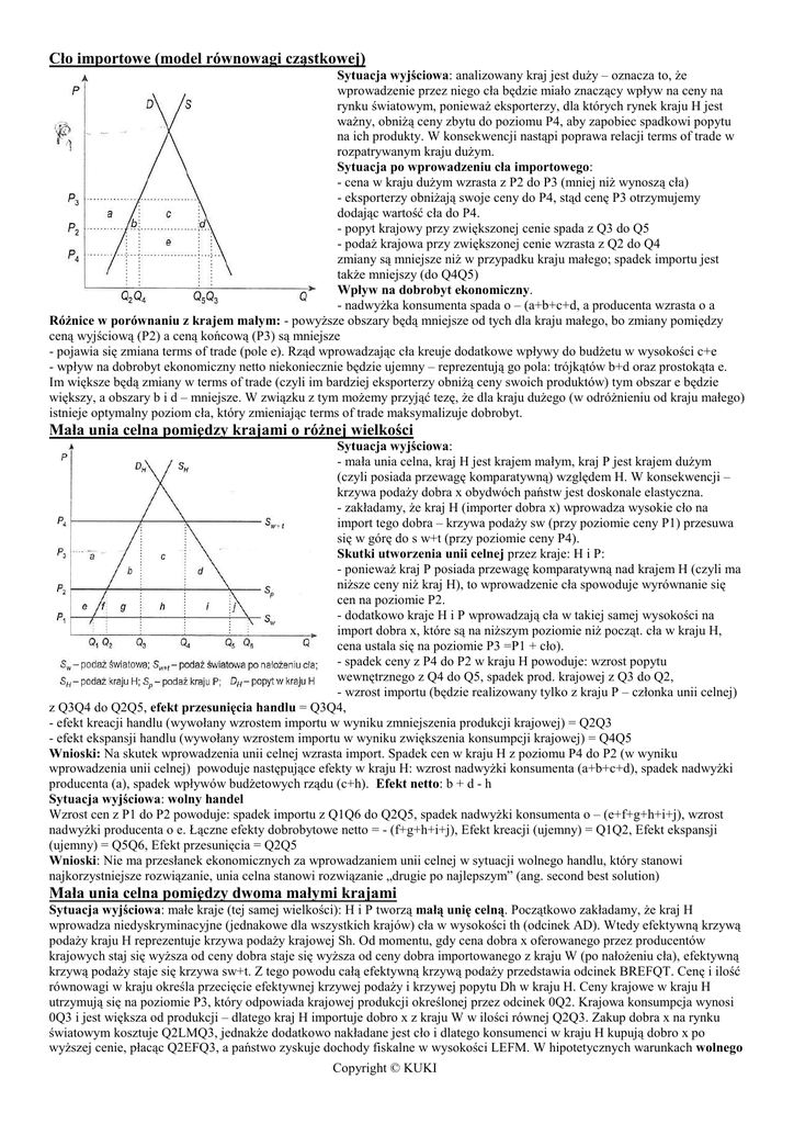 Cło importowe (model równowagi cząstkowej) Sytuacja wyjściowa: analizowany kraj jest duży – oznacza to, że wprowadzenie przez niego cła będzie miało znaczący wpływ na ceny na rynku światowym, ponieważ eksporterzy, dla których rynek kraju H jest ważny, obniżą ceny zbytu do poziomu P4, aby zapobiec spadkowi popytu na ich produkty. W konsekwencji nastąpi poprawa relacji terms of trade w rozpatrywanym kraju dużym. Sytuacja po wprowadzeniu cła importowego: - cena w kraju dużym wzrasta z P2 do P3 (mniej niż wynoszą cła) - eksporterzy obniżają swoje ceny do P4, stąd cenę P3 otrzymujemy dodając wartość cła do P4. - popyt krajowy przy zwiększonej cenie spada z Q3 do Q5 - podaż krajowa przy zwiększonej cenie wzrasta z Q2 do Q4 zmiany są mniejsze niż w przypadku kraju małego; spadek importu jest także mniejszy (do Q4Q5) Wpływ na dobrobyt ekonomiczny. - nadwyżka konsumenta spada o – (a+b+c+d, a producenta wzrasta o a Różnice w porównaniu z krajem małym: - powyższe obszary będą mniejsze od tych dla kraju małego, bo zmiany pomiędzy ceną wyjściową (P2) a ceną końcową (P3) są mniejsze - pojawia się zmiana terms of trade (pole e). Rząd wprowadzając cła kreuje dodatkowe wpływy do budżetu w wysokości c+e - wpływ na dobrobyt ekonomiczny netto niekoniecznie będzie ujemny – reprezentują go pola: trójkątów b+d oraz prostokąta e. Im większe będą zmiany w terms of trade (czyli im bardziej eksporterzy obniżą ceny swoich produktów) tym obszar e będzie większy, a obszary b i d – mniejsze. W związku z tym możemy przyjąć tezę, że dla kraju dużego (w odróżnieniu od kraju małego) istnieje optymalny poziom cła, który zmieniając terms of trade maksymalizuje dobrobyt. Mała unia celna pomiędzy krajami o różnej wielkości Sytuacja wyjściowa: - mała unia celna, kraj H jest krajem małym, kraj P jest krajem dużym (czyli posiada przewagę komparatywną) względem H. W konsekwencji – krzywa podaży dobra x obydwóch państw jest doskonale elastyczna. - zakładamy, że kraj H (importer dobra x) wprowadza wysokie cło na import tego dobra – krzywa podaży sw (przy poziomie ceny P1) przesuwa się w górę do s w+t (przy poziomie ceny P4). Skutki utworzenia unii celnej przez kraje: H i P: - ponieważ kraj P posiada przewagę komparatywną nad krajem H (czyli ma niższe ceny niż kraj H), to wprowadzenie cła spowoduje wyrównanie się cen na poziomie P2. - dodatkowo kraje H i P wprowadzają cła w takiej samej wysokości na import dobra x, które są na niższym poziomie niż począt. cła w kraju H, cena ustala się na poziomie P3 =P1 + cło). - spadek ceny z P4 do P2 w kraju H powoduje: wzrost popytu wewnętrznego z Q4 do Q5, spadek prod. krajowej z Q3 do Q2, - wzrost importu (będzie realizowany tylko z kraju P – członka unii celnej) z Q3Q4 do Q2Q5, efekt przesunięcia handlu = Q3Q4, - efekt kreacji handlu (wywołany wzrostem importu w wyniku zmniejszenia produkcji krajowej) = Q2Q3 - efekt ekspansji handlu (wywołany wzrostem importu w wyniku zwiększenia konsumpcji krajowej) = Q4Q5 Wnioski: Na skutek wprowadzenia unii celnej wzrasta import. Spadek cen w kraju H z poziomu P4 do P2 (w wyniku wprowadzenia unii celnej) powoduje następujące efekty w kraju H: wzrost nadwyżki konsumenta (a+b+c+d), spadek nadwyżki producenta (a), spadek wpływów budżetowych rządu (c+h). Efekt netto: b + d - h Sytuacja wyjściowa: wolny handel Wzrost cen z P1 do P2 powoduje: spadek importu z Q1Q6 do Q2Q5, spadek nadwyżki konsumenta o – (e+f+g+h+i+j), wzrost nadwyżki producenta o e. Łączne efekty dobrobytowe netto = - (f+g+h+i+j), Efekt kreacji (ujemny) = Q1Q2, Efekt ekspansji (ujemny) = Q5Q6, Efekt przesunięcia = Q2Q5 Wnioski: Nie ma przesłanek ekonomicznych za wprowadzaniem unii celnej w sytuacji wolnego handlu, który stanowi najkorzystniejsze rozwiązanie, unia celna stanowi rozwiązanie „drugie po najlepszym” (ang. second best solution) Mała unia celna pomiędzy dwoma małymi krajami Sytuacja wyjściowa: małe kraje (tej samej wielkości): H i P tworzą małą unię celną. Początkowo zakładamy, że kraj H wprowadza niedyskryminacyjne (jednakowe dla wszystkich krajów) cła w wysokości th (odcinek AD). Wtedy efektywną krzywą podaży kraju H reprezentuje krzywa podaży krajowej Sh. Od momentu, gdy cena dobra x oferowanego przez producentów krajowych staj się wyższa od ceny dobra staje się wyższa od ceny dobra importowanego z kraju W (po nałożeniu cła), efektywną krzywą podaży staje się krzywa sw+t. Z tego powodu całą efektywną krzywą podaży przedstawia odcinek BREFQT. Cenę i ilość równowagi w kraju określa przecięcie efektywnej krzywej podaży i krzywej popytu Dh w kraju H. Ceny krajowe w kraju H utrzymują się na poziomie P3, który odpowiada krajowej produkcji określonej przez odcinek 0Q2. Krajowa konsumpcja wynosi 0Q3 i jest większa od produkcji – dlatego kraj H importuje dobro x z kraju W w ilości równej Q2Q3. Zakup dobra x na rynku światowym kosztuje Q2LMQ3, jednakże dodatkowo nakładane jest cło i dlatego konsumenci w kraju H kupują dobro x po wyższej cenie, płacąc Q2EFQ3, a państwo zyskuje dochody fiskalne w wysokości LEFM. W hipotetycznych warunkach wolnego Copyright © KUKI handlu konsumpcja kraju H wyniosłaby 0Q5 i w całości byłaby importowana z W – wynika z tego, że wolny handel stanowi optymalne rozwiązanie Zakładamy, że kraje: H i P tworzą unię celną (zostaje wprowadzona wspólna zewnętrzna taryfa celna, przy czym stawka celna na towary z kraju W pozostaje bez zmian – AD = th). Efektywną krzywą podaży krajów unii (H i P) jest BRGQT. Ceny spadają z P3 do P2 , krajowa produkcja zmniejsza się do poziomu 0Q1, konsumpcja do 0Q4, natomiast import wzrasta do 0Q4 (cały import pochodzi teraz z kraju P). Wpływ unii celnej na poziom dobrobytu: - w wyniku spadku cen i wzrostu konsumpcji wzrasta nadwyżka konsumenta (o pole CDFG) - część tego przyro