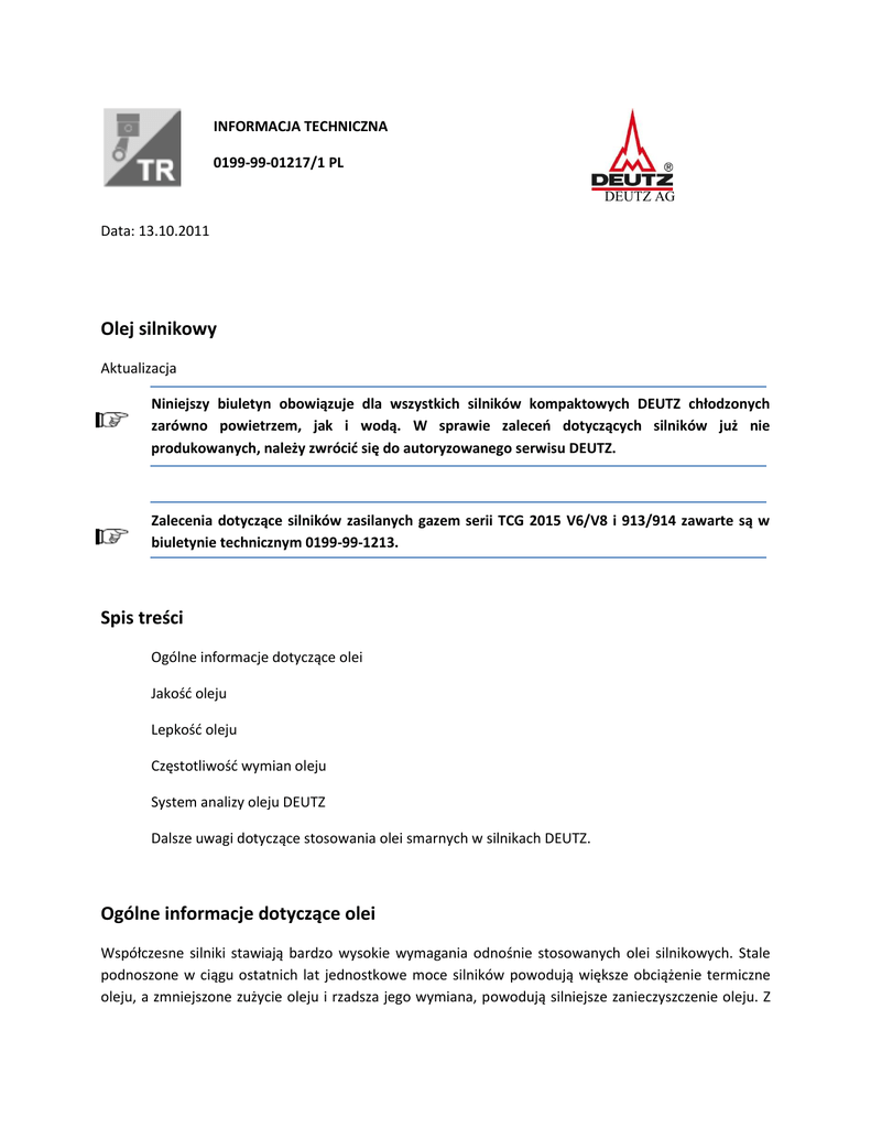 INFORMACJA TECHNICZNA 0199-99-01217/1 PL DEUTZ AG Data: 13.10.2011 Olej silnikowy Aktualizacja Niniejszy biuletyn obowiązuje dla wszystkich silników kompaktowych DEUTZ chłodzonych zarówno powietrzem, jak i wodą. W sprawie zaleceń dotyczących silników już nie produkowanych, należy zwrócić się do autoryzowanego serwisu DEUTZ. Zalecenia dotyczące silników zasilanych gazem serii TCG 2015 V6/V8 i 913/914 zawarte są w biuletynie technicznym 0199-99-1213. Spis treści Ogólne informacje dotyczące olei Jakość oleju Lepkość oleju Częstotliwość wymian oleju System analizy oleju DEUTZ Dalsze uwagi dotyczące stosowania olei smarnych w silnikach DEUTZ. Ogólne informacje dotyczące olei Współczesne silniki stawiają bardzo wysokie wymagania odnośnie stosowanych olei silnikowych. Stale podnoszone w ciągu ostatnich lat jednostkowe moce silników powodują większe obciążenie termiczne oleju, a zmniejszone zużycie oleju i rzadsza jego wymiana, powodują silniejsze zanieczyszczenie oleju. Z tego powodu konieczne jest przestrzeganie opisanych w tym dokumencie wymagań i zaleceń, aby nie spowodować skrócenia trwałości silnika. Oleje zawsze składają się z oleju bazowego oraz pakietu dodatków. Najważniejsze zadania olei silnikowych (ochrona przed zatarciami, korozją, neutralizacja kwasów pochodzących z produktów spalania, zmniejszanie odkładanych ilości nagaru oraz sadzy na poszczególnych elementach silnika) zostały przejęte przez dodatki do olei. Właściwości oleju bazowego mają jednak wysokie znaczenie dla jakości produktu, np. w zakresie obciążeń termicznych oraz pracy w niskich temperaturach. Należy unikać mieszania olei, ponieważ otrzymana mieszanka przejmuje cechy jakościowe oleju najniższej jakości. Zasadniczo oleje silnikowe są dowolnie mieszalne między sobą, tak aby w przypadku wymian oleju nie było problemów z ich mieszaniem. Zalecenia DEUTZ dotyczące olei Do stosowania w silnikach DEUTZ zaleca się następujące oleje DEUTZ odpowiednich klas jakościowych (patrz rozdział Jakość oleju). Te oleje są specjalnie przystosowane do wymagań silników i sprawdziły się najlepiej w najcięższych warunkach zastosowań. Klasa jakościowa DEUTZ DQC II-10 Opis oleju DEUTZ OLEJ DEUTZ TLS-15W40D DQC III-10 OLEJ DEUTZ TLX-10W40FE DQC IV-10 OLEJ DEUTZ DQC4-5W30-UHP Opakowanie Numer katalogowy Kanister 5 l Kanister 20 l Beczka 209 l Kanister 5 l Kanister 20 l Beczka 209 l Kanister 20 l Beczka 209 l 01016331 01016332 01016333 01016335 10106336 10106337 01017849 01017850 Tabela T1 oleje silnikowe DEUTZ Klasa jakościowa DEUTZ DQC III-10 LA Opis oleju Opakowanie DEUTZ OLEJ DEUTZ RODON 10W40 Kanister 20 l Low SAPS Beczka 209 l Tabela T2 oleje silnikowe DEUTZ do silników z układem oczyszczania spalin Numer katalogowy 01017976 01017977 Jakość oleju Jakość oleju ma bardzo duży wpływa na trwałość, osiągi oraz opłacalność pracy silników. Możliwości oleju określające jego jakość określana jest podczas badań laboratoryjnych i stanowiskowych. Oleje, które są przeznaczone do stosowania na rynku europejskim są sprawdzane i klasyfikowane według norm ACEA (ACEA = Association des Constructeurs European d'Automobiles). Sprawdzenie obejmuje testy laboratoryjne do określenia fizyczno-chemicznych właściwości olei oraz szeroko rozumiane testy silników, reprezentujących aktualny poziom zaawansowania technicznego. Analogicznie badane są oleje przeznaczone na rynek amerykański zgodnie z wytycznymi norm API (American Petroleum Institute). Powyższe normy te mają swoje zastosowanie na całym świecie. Zastosowanie klasyfikacji ACEA na rynku europejskim jest nadrzędne do specyfikacji API. Do zastosowań w silnikach DEUTZ oleje zostały podzielone na klasy jakości olei (DQC). Silniki bez układu oczyszczania spalin DQC I-02 Najniższa klasa jakościowa dla standardowych silników ze zwiększoną częstotliwością wymiany oleju DQC II-10 albo DQC II-05 Standardowa klasa jakości do standardowych silników DQC III-10 albo DQC III-05 Wysokowydajny olej silnikowy do silników z zamkniętym układem odpowietrzania skrzyni korbowej i/lub silników o podwyższonych osiągach DQC IV-10 albo DQC IV-05 Bardzo wysokowydajny olej silnikowy do silników o najwyższych osiągach i/lub silników z zamkniętym układem odpowietrzania skrzyni korbowej Uwagi 1) Oleje dopuszczone do stosowania zgodnie z dotychczasowymi klasami jakości DQC II-05, DQC III-05 i DQC IV-05, mogą dalej być stosowane 2) Oleje o niskiej zawartości popiołów / oleje low SAPS, mogą być stosowane w silnikach bez układów oczyszczania spalin tylko wtedy, gdy zawartość siarki w paliwie nie przekracza 50 mg/kg Oleje o niskiej zawartości popiołów mogą być stosowane jeśli zawartość siarki nie przekracza 500 mg/kg, jeśli liczba zasadowa (TBN) wynosi co najmniej 9 mg KOH/g. Odpowiednia uwaga zamieszczona jest na liście olei dopuszczonych przez DEUTZ AG 3) Oleje dopuszczone zgodnie z wyższymi klasami DQC, mogą być stosowane w niższych klasach jakościowych Tabela T3 silniki bez układu oczyszczania spalin Z powodu nowych, bardziej restrykcyjnych przepisów dotyczących czystości spalin w Europie (Stufe IIIB) oraz USA (Tier 4 interim) i powiązanym z nimi stosowaniem systemów oczyszczania spalin, takich jak filtry cząstek stałych (DPF) lub katalizatory utleniania cząstek stałych, konieczne było wprowadzenie nowych klas jakościowych (DQC) dla olei o niskiej zawartości popiołów. Popioły siarczanów i tlenków pochodzące z dodatków organicznych i metalicznych znacznie obniżają trwałość filtrów cząstek stałych. Fosforany pochodzący z dodatków chroniących przed zatarciami, tak samo siarka i związki siarki mogą mieć negatywny wpływ na działanie katalizatora w systemach oczyszczania spalin. Z tego też powodu powstały oleje silnikowe o niskiej zawartości popiołów (oleje low SAPS – low Sulphated Ash, Phosphorus, Sulphur), które to z