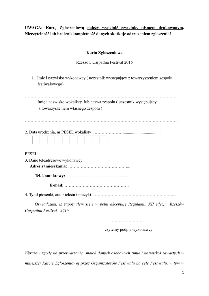UWAGA: Kartę Zgłoszeniową należy wypełnić czytelnie, pismem drukowanym. Nieczytelność lub brak/niekompletność danych skutkuje odrzuceniem zgłoszenia! Karta Zgłoszeniowa Rzeszów Carpathia Festival 2016 1. Imię i nazwisko wykonawcy ( uczestnik występujący z towarzyszeniem zespołu festiwalowego) ……………………………………………………………………………………………….. Imię i nazwisko wokalisty lub nazwa zespołu ( uczestnik występujący z towarzyszeniem własnego zespołu ) ……………………………………………………………………………………………….. 2. Data urodzenia, nr PESEL wokalisty ………………….................................... PESEL: 3. Dane teleadresowe wykonawcy Adres zamieszkania: ……………………………………... Tel. kontaktowy: ………………………………............ E-mail: ………………………………………. 4. Tytuł piosenki, autor tekstu i muzyki …………………………………………………...... Oświadczam, iż zapoznałem się i w pełni akceptuję Regulamin XII edycji ,,Rzeszów Carpathia Festival” 2016 …………………… czytelny podpis wykonawcy Wyrażam zgodę na przetwarzanie moich danych osobowych (imię i nazwisko) zawartych w niniejszej Karcie Zgłoszeniowej przez Organizatorów Festiwalu na cele Festiwalu, w tym w 1 celach informacyjno-reklamowych i promocyjnych (zgodnie z Ustawą z dnia 29.08.1997 roku o Ochronie Danych Osobowych; tekst jednolity: Dz. U. z 2002r. Nr 101, poz. 926 ze zm.) …………………… czytelny podpis wykonawcy 5. Czy zgłoszony utwór został skomponowany specjalnie na ,,Rzeszów Carpathia Festival” 2016 TAK / NIE (proszę podkreślić odpowiedź) 6. Pełny skład zespołu (imię i nazwisko oraz instrument): ………………………………………………… ………………………………………………… ………………………………………………… ………………………………………………… ………………………………………………… ………………………………………………… ………………………………………………… 7.Oświadczamy, iż zapoznaliśmy się i w pełni akceptujmy Regulamin XII edycji ,,Rzeszów Carpathia Festival” 2016. czytelne podpisy członków zespołu(wszyscy członkowie zespołu podpisują się osobiście): ……………………………………………… ……………………………………………… ……………………………………………… ……………………………………………… ……………………………………………… ……………………………………………… ……………………………………………… 8. Wyrażam zgodę na przetwarzanie moich danych osobowych (imię i nazwisko) zawartych w niniejszej Karcie Zgłoszeniowej przez Organizatorów Festiwalu na cele Festiwalu, w tym 2 w celach informacyjno-reklamowych i promocyjnych (zgodnie z Ustawą z dnia 29.08.1997 roku o Ochronie Danych Osobowych; tekst jednolity: Dz. U. z 2002r. Nr 101, poz. 926 ze zm czytelne podpisy członków zespołu( wszyscy członkowie zespołu podpisują się osobiście): ……………………………………………… ……………………………………………… ……………………………………………… ……………………………………………… ……………………………………………… ……………………………………………… ……………………………………………… 9. Dane teleadresowe instruktora/menagera/opiekuna (właściwe podkreślić) Imię i nazwisko: ……………………………………..... Tel. kontaktowy: ………………………………............ E-mail: ………………………………………. Oświadczam, iż zapoznałem się i w pełni akceptuję Regulamin XII edycji ,,Rzeszów Carpathia Festival” 2016 …………………… czytelny podpis instruktora/menagera/opiekuna Wyrażam zgodę na przetwarzanie moich danych osobowych (imię i nazwisko) zawartych w niniejszej Karcie Zgłoszeniowej przez Organizatorów Festiwalu na cele Festiwalu, w tym w celach informacyjno-reklamowych i promocyjnych (zgodnie z Ustawą z dnia 29.08.1997 roku o Ochronie Danych Osobowych; tekst jednolity: Dz. U. z 2002r. Nr 101, poz. 926 ze zm.) …………………… czytelny podpis instruktora/menagera/opiekuna 3