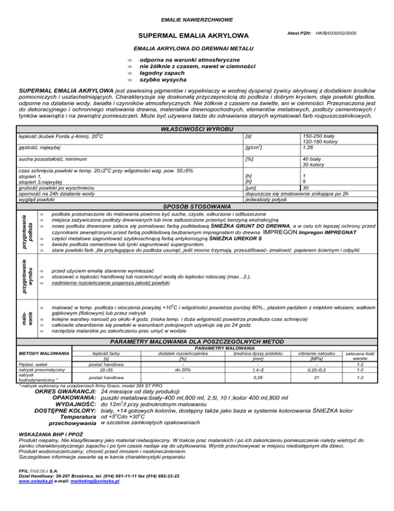 EMALIE NAWIERZCHNIOWE Atest PZH: SUPERMAL EMALIA AKRYLOWA HK/B/0330/02/2005 EMALIA AKRYLOWA DO DREWNAI METALU • • • • odporna na warunki atmosferyczne nie żółknie z czasem, nawet w ciemności łagodny zapach szybko wysycha SUPERMAL EMALIA AKRYLOWA jest zawiesiną pigmentów i wypełniaczy w wodnej dyspersji żywicy akrylowej z dodatkiem środków pomocniczych i uszlachetniających. Charakteryzuje się doskonałą przyczepnością do podłoża i dobrym kryciem, daje powłoki gładkie, odporne na działanie wody, światła i czynników atmosferycznych. Nie żółknie z czasem na świetle, ani w ciemności. Przeznaczona jest do dekoracyjnego i ochronnego malowania drewna, materiałów drewnopochodnych, elementów metalowych, podłoży cementowych i tynków wewnątrz i na zewnątrz pomieszczeń. Może być używana także do odnawiania starych wymalowań farb rozpuszczalnikowych. WŁAŚCIWOŚCI WYROBU lepkość (kubek Forda φ 4mm), 200C [s] gęstość, najwyżej [g/cm3] sucha pozostałość, minimum [%] czas schnięcia powłoki w temp. 20±20C przy wilgotności wzg. pow. 55±5% stopień 1, stopień 3,najwyżej grubość powłoki po wyschnieciu oporność na 24h działanie wody wygląd powłoki [h] 1 [h] 5 [µm] 30 dopuszcza się zmatowienie znikające po 2h jedwabisty połysk 150-250 biały 120-180 kolory 1,26 40 biały 30 kolory malowanie przygotowanie wyrobu przygotowanie podłoża SPOSÓB STOSOWANIA • • • • • • podłoże przeznaczone do malowania powinno być suche, czyste, odkurzone i odtłuszczone miejsca zażywiczone podłoży drewnianych lub inne zatłuszczone przemyć benzyną ekstrakcyjną nowe podłoża drewniane zaleca się pomalowac farbą podkładową ŚNIEŻKA GRUNT DO DREWNA, a w celu ich lepszej ochrony przed czynnikami zewnętrznymi przed farbą podkładową bezbarwnym impregnatem do drewna IMPREGON Impregon IMPREGNAT części metalowe zagruntować szybkoschnącą farbą antykorozyjną ŚNIEŻKA UREKOR S świeże podłoża cementowe lub tynki zagruntować supergruntem. stare powłoki farb ,źle przylegające do podłoża usunąć, jeśli mocno trzymają, przeszlifować- zmatowić papierem ściernym i odpylić • • • przed użyciem emalię starannie wymieszać stosować o lepkości handlowej lub rozcieńczyć wodą do lepkości roboczej (max...2.), nadmierne rozcieńczanie pogarsza jakość powłoki • malować w temp. podłoża i otoczenia powyżej +100C i wilgotności powietrza poniżej 80%., płaskim pędzlem z miękkim włosiem, wałkiem gąbkowym (flokowym) lub przez natrysk kolejne warstwy nanosić po około 4 godz. (niska temp. i duża wilgotność powietrza przedłuża czas schnięcia) całkowite utwardzenie się powłoki w warunkach pokojowych uzyskuje się po 24 godz. narzędzia malarskie po zakończeniu prac umyć w wodzie • • • PARAMETRY MALOWANIA DLA POSZCZEGÓLNYCH METOD METODY MALOWANIA lepkość farby [s] postać handlowa 25÷35 PARAMETRY MALOWANIA dodatek rozcieńczalnika średnica dyszy pistoletu [%] [mm] do 20% 1,4÷2 Pędzel, wałek natrysk pneumatyczny natrysk postać handlowa hydrodynamiczny * *-natrysk wykonany na urządzeniach firmy Graco, model 395 ST PRO OKRES GWARANCJI: OPAKOWANIA: WYDAJNOŚĆ: DOSTĘPNE KOLORY: Temperatura przechowywania - 0,26 ciśnienie natrysku [MPa] 0,25÷0,5 zalecana ilość warstw 1-2 1-2 21 1-2 24 miesiące od daty produkcji puszki metalowe:biały-400 ml,800 ml, 2,5l, 10 l ;kolor 400 ml,800 ml 2 do 12m /l przy jednokrotnym malowaniu biały, +14 gotowych kolorów, dostępny także jako baza w systemie kolorowania ŚNIEŻKA kolor od +50Cdo +300C w szczelnie zamkniętych opakowaniach WSKAZANIA BHP i PPOŻ Produkt niepalny. Nie klasyfikowany jako materiał niebezpieczny. W trakcie prac malarskich i po ich zakończeniu pomieszczenie należy wietrzyć do zaniku charakterystycznego zapachu i po tym czasie nadaje się do użytkowania. Wyrób przechowywać w miejscu niedostępnym dla dzieci. Produkt wodorozcieńczalny, chronić przed mrozem i nasłonecznieniem. Szczegółowe informacje zawarte są w karcie charakterystyki preparatu. FFiL ŚNIEŻKA S.A. Dział Handlowy: 39-207 Brzeźnica, tel. (014) 681-11-11 fax (014) 682-22-22 www.sniezka.pl e-mail: [email protected]