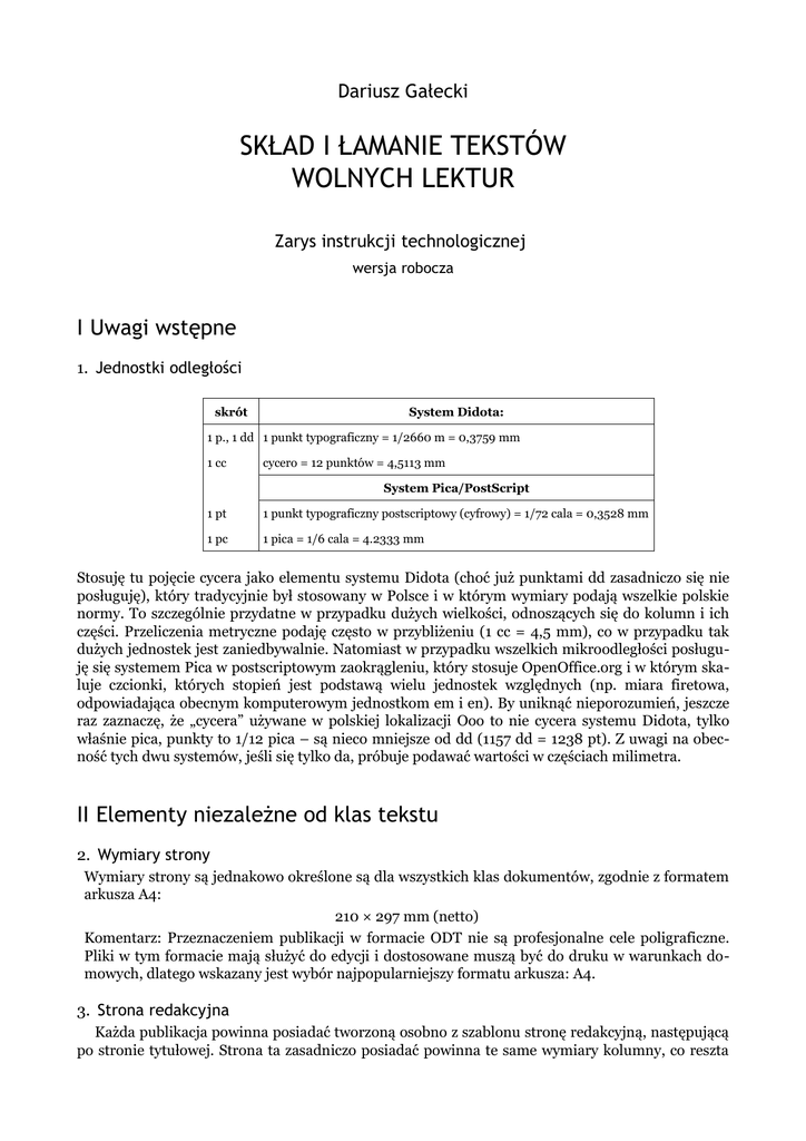 Dariusz Gałecki SKŁAD I ŁAMANIE TEKSTÓW WOLNYCH LEKTUR Zarys instrukcji technologicznej wersja robocza I Uwagi wstępne 1. Jednostki odległości skrót System Didota: 1 p., 1 dd 1 punkt typograficzny = 1/2660 m = 0,3759 mm 1 cc cycero = 12 punktów = 4,5113 mm System Pica/PostScript 1 pt 1 punkt typograficzny postscriptowy (cyfrowy) = 1/72 cala = 0,3528 mm 1 pc 1 pica = 1/6 cala = 4.2333 mm Stosuję tu pojęcie cycera jako elementu systemu Didota (choć już punktami dd zasadniczo się nie posługuję), który tradycyjnie był stosowany w Polsce i w którym wymiary podają wszelkie polskie normy. To szczególnie przydatne w przypadku dużych wielkości, odnoszących się do kolumn i ich części. Przeliczenia metryczne podaję często w przybliżeniu (1 cc = 4,5 mm), co w przypadku tak dużych jednostek jest zaniedbywalnie. Natomiast w przypadku wszelkich mikroodległości posługuję się systemem Pica w postscriptowym zaokrągleniu, który stosuje OpenOffice.org i w którym skaluje czcionki, których stopień jest podstawą wielu jednostek względnych (np. miara firetowa, odpowiadająca obecnym komputerowym jednostkom em i en). By uniknąć nieporozumień, jeszcze raz zaznaczę, że „cycera” używane w polskiej lokalizacji Ooo to nie cycera systemu Didota, tylko właśnie pica, punkty to 1/12 pica – są nieco mniejsze od dd (1157 dd = 1238 pt). Z uwagi na obecność tych dwu systemów, jeśli się tylko da, próbuje podawać wartości w częściach milimetra. II Elementy niezależne od klas tekstu 2. Wymiary strony Wymiary strony są jednakowo określone są dla wszystkich klas dokumentów, zgodnie z formatem arkusza A4: 210 × 297 mm (netto) Komentarz: Przeznaczeniem publikacji w formacie ODT nie są profesjonalne cele poligraficzne. Pliki w tym formacie mają służyć do edycji i dostosowane muszą być do druku w warunkach domowych, dlatego wskazany jest wybór najpopularniejszy formatu arkusza: A4. 3. Strona redakcyjna Każda publikacja powinna posiadać tworzoną osobno z szablonu stronę redakcyjną, następującą po stronie tytułowej. Strona ta zasadniczo posiadać powinna te same wymiary kolumny, co reszta dokumentu. W przypadku bardzo krótkich utworów (zazwyczaj należących do klasy opowiadania lub klas utworów poetyckich) można połączyć ją ze strona tytułową, wyraźnie graficznie oddzielając tytułową część kolumny od części redakcyjnej (szczegóły określać powinien projekt graficzny szablonu). Cześć redakcyjna powinna być wówczas składana stopniem pisma o punkt lub 2 punkty mniejszym od domyślnego stopnia pisma dla dokumentu danej klasy. Strona redakcyjna zawierać powinna: 3.1. Informacje o oryginale w przypadku przekładu (zasadniczo przejmowane z podstawy wydania): 3.1.1. Nagłówek: Tytuł oryginału: lub Oryginał: 3.1.2. Dane skrócone: a) nazwa autora podana w transliteracji (transkrypcja dopuszczalna tu tylko przy równoczesnym podaniu zapisu oryg.) – konieczna tylko w przypadku, w którym na stronie tytułowej nazwa autora podana w transkrypcji; b) tytuł i podtytuł (w przypadku konieczności transkrypcji lub transliteracji, należy wybrać transliterację, transkrypcja dopuszczalna tu tylko przy równoczesnym podaniu zapisu oryg.); c) dodatkowe informacje w przypadkach szczególnych (niejednoznacznych, np. gdy istnieją odmienne wersje oryginału – różne wersje autorskie, wersje rekonstrukcji, istotne różnice pomiędzy kolejnymi wydaniami oryginału). KOMENTARZ: Dane skrócone wystarczają w przypadku przekładu przejętego z podstawy wydania (a z takimi mamy do czynienia w przypadku Wolnych Lektur) – można oczywiście dla większej skrupulatności podać pełny zestaw danych (jak w 2.2.2.). 3.2. Informacje o podstawie wydania 3.2.1. nagłówek: Podstawa niniejszego wydania lub Tekst za: 3.2.2. dane: a) w przypadku wyd. jednotomowego: — autor (w przypadku zbiorów/antologii: autor wyboru), — tytuł i podtytuł, — główni współtwórcy (tłumacze, autorzy opracowania, redaktorzy merytoryczni), — oznaczenie wydania, — nazwa wydawcy, — miejsce i data wydania, — ISBN (jeśli posiada; ew. także ISSN serii, do której należy) — link do podstrony serwisu biblioteki Polona (jeśli tekst udostępniany w tej bibliotece); b) w przypadku wydawnictwa wielotomowego dodatkowo: — nr tomu, — obok tytułu całości także tytuł tomu (np. Adam Mickiewicz, Dzieła zebrane, t. II: Poezje; wyd. 1...); 3.2.3. ew. informacje o istotnych zmianach względem podstawy wyd. (Tekst uwspółcześniono, Ponownie porównano z oryginałem i uwspółcześniono, Dodano wstęp autora pominięty w podstawie niniejszego wydania itp.). 3.3. Notka informacyjna (o przedsięwzięciu Wolne Lektury i obecnym wydaniu). 3.4. Dane obecnego wydania: 3.4.1. nazwy współtwórców obecnego wydania niewymienione na stronie tytułowej (lub obszarze tytułowym) z podaniem ich roli (autor uwspółcześnienia, redaktor językowy, red. techniczny itp.); 3.4.2. linki do źródła wiki i serwisu Wolnych Lektur; 3.4.3. oznaczenie wydania i/lub wersja pliku danego typu; 3.4.4. data i miejsce wydania; 3.4.5. informacje o prawach autorskich do wydania i licencji je regulującej. 3.5. Informacje o przeznaczeniu do użytku szkolnego. 3.6. Dane wydawcy: 3.6.1. logo (przedsięwzięcia Wolne Lektury lub Fundacji); 3.6.2. formalne określenie wydawcy wraz z adresem, adresami e-mail itd. (Fundacja Nowoczesna Polska). 3.7. Logo i informacje o sponsorach/partnerach. 4. Domyślne własności typograficzne tekstu całego dokumentu: 4.1. domyślny font szeryfowy: np. któraś z wersji krojów antykw renesansowych lub barokowych, np. Palatino, Garamond, Caslon, ew. Bookman (wskazany raczej w tekstach dla najmłodszych czytelników) 4.2. domyślny font bezszeryfowy: np. któraś z bezszeryfowych linearnych antykw renesansowych (Myriad Pro, Optima, Verdana) 4.3. domyślny krój pisma tekstu głównego: domyślny font szeryfowy 4.4. domyślna odmiana kroju tekstu g