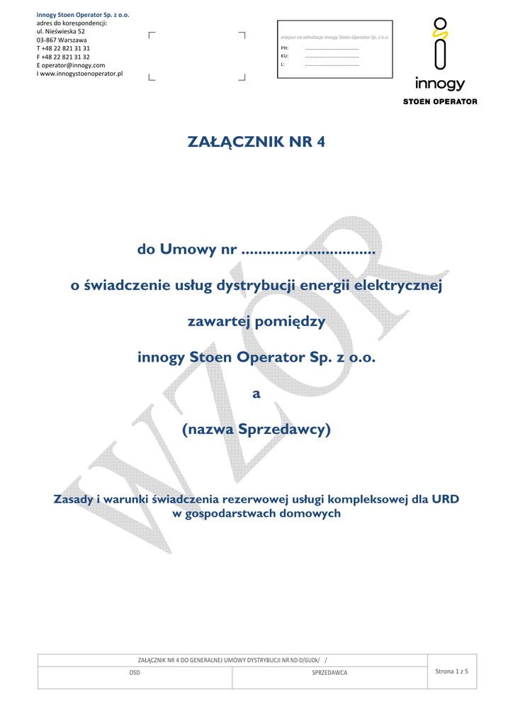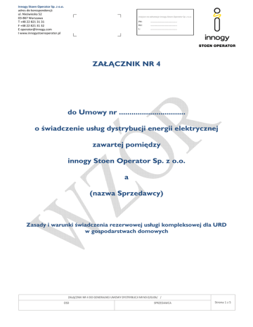 innogy Stoen Operator Sp. z o.o. adres do korespondencji: ul. Nieświeska 52 03-867 Warszawa T +48 22 821 31 31 F +48 22 821 31 32 E [email protected] I www.innogystoenoperator.pl miejsce na adnotacje innogy Stoen Operator Sp. z o.o. PH: ……………………………………… KU: ……………………………………… L: ……………………………………… ZAŁĄCZNIK NR 4 do Umowy nr ................................ o świadczenie usług dystrybucji energii elektrycznej zawartej pomiędzy innogy Stoen Operator Sp. z o.o. a (nazwa Sprzedawcy) Zasady i warunki świadczenia rezerwowej usługi kompleksowej dla URD w gospodarstwach domowych ZAŁĄCZNIK NR 4 DO GENERALNEJ UMOWY DYSTRYBUCJI NR ND-D/GUDk/ / OSD SPRZEDAWCA Strona 1 z 5 §1 1. Sprzedawca niniejszym składa w stosunku do URD w gospodarstwach domowych (zwanymi dalej „URDSR”), którzy udzielili OSD pełnomocnictwa i wskazali Sprzedawcę jako sprzedawcę rezerwowego, ofertę zawarcia rezerwowych umów kompleksowych z przyczyn wskazanych w IRiESD na warunkach określonych w: 2. a. IRiESD, b. wzorze rezerwowej umowy kompleksowej przekazanym OSD przez Sprzedawcę, c. cenniku sprzedaży rezerwowej Sprzedawcy przekazanym OSD przez Sprzedawcę, d. niniejszym załączniku. Jeżeli Sprzedawca wykonuje zadania sprzedawcy z urzędu na obszarze działania OSD, oferta o której mowa w ust. 1 powyżej jest wiążąca również w okolicznościach wskazanych w IRiESD. 3. W razie zaistnienia podstaw do rozpoczęcia przez Sprzedawcę świadczenia rezerwowej usługi kompleksowej na rzecz URDSR, OSD złoży Sprzedawcy w imieniu i na rzecz URDSR oświadczenie, którego wzór określono w §3, o przyjęciu oferty na warunkach określonych w ust. 1. 4. Cena energii elektrycznej sprzedawanej w ramach świadczenia rezerwowej usługi kompleksowej oraz stawki opłat wynikają z aktualnego w chwili rozpoczęcia świadczenia rezerwowej usługi kompleksowej Cennika sprzedaży rezerwowej Sprzedawcy. 5. Cena energii elektrycznej sprzedawanej w ramach świadczenia rezerwowej usługi kompleksowej nie może być wyższa niż iloczyn współczynnika 2,5 i średniej ceny sprzedaży energii elektrycznej na rynku konkurencyjnym, o której mowa w art. 23 ust. 2 pkt 18 lit. b) ustawy Prawo energetyczne. 6. 7. Sprzedawca publikuje na swojej stronie internetowej: a. cennik sprzedaży rezerwowej, b. wzór rezerwowej umowy kompleksowej. Sprzedawca jest zobowiązany do przekazania OSD dokumentów o których mowa w ust. 1 b) i c), w chwili zawarcia Umowy oraz do przekazywania OSD aktualizacji powyższych dokumentów z co najmniej pięciodniowym wyprzedzeniem przed datą początku ich obowiązywania. Przekazanie OSD powyższych dokumentów wraz z odnośnikiem do miejsca ich opublikowania na stronie internetowej Sprzedawcy, następuje na adresy poczty elektronicznej o których mowa w Załączniku do Umowy. §2 Sprzedawca zobowiązuje się w treści umowy kompleksowej z URDSR zamieścić następujące postanowienia: „Rezerwowa usługa kompleksowa 1. W przypadku, gdy Sprzedawca nie rozpoczął lub zaprzestał świadczenia usługi kompleksowej na rzecz Odbiorcy z następujących przyczyn: a) trwałej lub przemijającej utraty przez Sprzedawcę lub przez podmiot odpowiedzialny za bilansowanie handlowe wskazany przez Sprzedawcę możliwości działania na rynku bilansującym; b) utraty przez Sprzedawcę możliwości świadczenia usługi kompleksowej; ZAŁĄCZNIK NR 4 DO GENERALNEJ UMOWY DYSTRYBUCJI NR ND-D/GUDk/ / OSD SPRZEDAWCA Strona 2 z 5 c) zakończenia świadczenia usługi kompleksowej zgodnie z IRiESD i niezgłoszenia lub nieskutecznego zgłoszenia do realizacji OSD przez Sprzedawcę umowy kompleksowej zawartej z Odbiorcą; z zastrzeżeniem okoliczności wskazanych w ust. 2; OSD zawrze z imieniu i na rzecz Odbiorcy rezerwową umowę kompleksową ze wskazanym przez Odbiorcę sprzedawcą rezerwowym. 2. OSD nie zawrze rezerwowej umowy kompleksowej w sytuacji: a) wstrzymania dostarczania energii elektrycznej Odbiorcy zgodnie z umową kompleksową albo wydania przez sąd polubowny wyroku dotyczącego wstrzymania dostarczania na niekorzyść Odbiorcy lub wydania niekorzystnej dla Odbiorcy decyzji przez Prezesa URE; b) wyprowadzenia Odbiorcy z punktu poboru energii (PPE) - zakończenia na wniosek Odbiorcy świadczenia usługi kompleksowej wraz z fizycznym odłączeniem PPE od sieci OSD. 3. W celu umożliwienia OSD zawarcia rezerwowej umowy kompleksowej ze sprzedawcą rezerwowym, w tym ze sprzedawcą wykonującym na obszarze OSD zadania sprzedawcy z urzędu, Odbiorca upoważnia OSD do zawarcia w imieniu i na rzecz Odbiorcy rezerwowej umowy kompleksowej, udzielając OSD pisemnego pełnomocnictwa ze wskazaniem wybranego sprzedawcy rezerwowego innego niż sprzedawca będący stroną zawartej umowy kompleksowej. Wzór pełnomocnictwa określony przez OSD stanowi załącznik do umowy kompleksowej oraz jest dostępny na stronie internetowej OSD. 4. Wykaz sprzedawców rezerwowych, którzy zawierają rezerwowe umowy kompleksowe i działających na terenie OSD publikowany jest na stronie internetowej OSD. 5. Odbiorca ma prawo do zmiany wskazanego w pełnomocnictwie sprzedawcy rezerwowego - w takim przypadku zmianie ulega wyłącznie treść pełnomocnictwa udzielonego OSD, bez wpływu na treść umowy kompleksowej. 6. W przypadku, gdy zaistnieje przesłanka do zawarcia rezerwowej umowy kompleksowej, z zastrzeżeniem ust. 2, a: a) Odbiorca nie wskaże sprzedawcy rezerwowego, albo b) wybrany sprzedawca rezerwowy nie będzie mógł zrealizować rezerwowej umowy kompleksowej, albo c) OSD wstrzymał realizację umowy zawartej z wybranym sprzedawcą rezerwowym w zakresie przyjmowania zgłoszeń nowych umów kompleksowych, OSD zawrze w imieniu Odbiorcy rezerwową umowę kompleksową ze sprzedawcą wykonującym na jego obszarze zadania sprzedawcy z urzędu. 7. W terminie 5 dni roboczych od złożenia sprzedawcy rezerwowemu przez OSD oświadczenia o przyjęciu oferty zawarcia