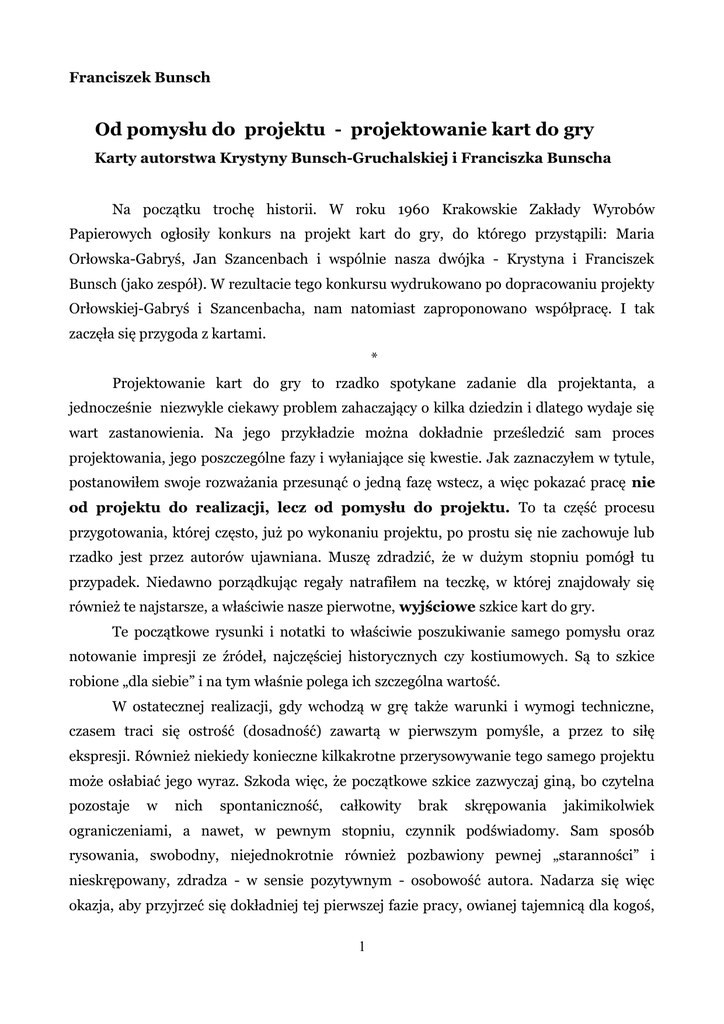 Franciszek Bunsch Od pomysłu do projektu - projektowanie kart do gry Karty autorstwa Krystyny Bunsch-Gruchalskiej i Franciszka Bunscha Na początku trochę historii. W roku 1960 Krakowskie Zakłady Wyrobów Papierowych ogłosiły konkurs na projekt kart do gry, do którego przystąpili: Maria Orłowska-Gabryś, Jan Szancenbach i wspólnie nasza dwójka - Krystyna i Franciszek Bunsch (jako zespół). W rezultacie tego konkursu wydrukowano po dopracowaniu projekty Orłowskiej-Gabryś i Szancenbacha, nam natomiast zaproponowano współpracę. I tak zaczęła się przygoda z kartami. * Projektowanie kart do gry to rzadko spotykane zadanie dla projektanta, a jednocześnie niezwykle ciekawy problem zahaczający o kilka dziedzin i dlatego wydaje się wart zastanowienia. Na jego przykładzie można dokładnie prześledzić sam proces projektowania, jego poszczególne fazy i wyłaniające się kwestie. Jak zaznaczyłem w tytule, postanowiłem swoje rozważania przesunąć o jedną fazę wstecz, a więc pokazać pracę nie od projektu do realizacji, lecz od pomysłu do projektu. To ta część procesu przygotowania, której często, już po wykonaniu projektu, po prostu się nie zachowuje lub rzadko jest przez autorów ujawniana. Muszę zdradzić, że w dużym stopniu pomógł tu przypadek. Niedawno porządkując regały natrafiłem na teczkę, w której znajdowały się również te najstarsze, a właściwie nasze pierwotne, wyjściowe szkice kart do gry. Te początkowe rysunki i notatki to właściwie poszukiwanie samego pomysłu oraz notowanie impresji ze źródeł, najczęściej historycznych czy kostiumowych. Są to szkice robione „dla siebie” i na tym właśnie polega ich szczególna wartość. W ostatecznej realizacji, gdy wchodzą w grę także warunki i wymogi techniczne, czasem traci się ostrość (dosadność) zawartą w pierwszym pomyśle, a przez to siłę ekspresji. Również niekiedy konieczne kilkakrotne przerysowywanie tego samego projektu może osłabiać jego wyraz. Szkoda więc, że początkowe szkice zazwyczaj giną, bo czytelna pozostaje w nich spontaniczność, całkowity brak skrępowania jakimikolwiek ograniczeniami, a nawet, w pewnym stopniu, czynnik podświadomy. Sam sposób rysowania, swobodny, niejednokrotnie również pozbawiony pewnej „staranności” i nieskrępowany, zdradza - w sensie pozytywnym - osobowość autora. Nadarza się więc okazja, aby przyjrzeć się dokładniej tej pierwszej fazie pracy, owianej tajemnicą dla kogoś, 1 kto trzyma w ręce wydrukowaną już kartę. Jak kiedyś przekazywali nam nasi pedagodzy, w samej twórczości i jej publicznym pokazywaniu jest coś z ujawniania spraw bardzo osobistych, zazwyczaj ukrywanych – porównywanego do striptizu – odsłaniania własnego charakteru łącznie z wadami czy ułomnościami. Coś zbliżonego do tego, na czym opiera się także grafologia. Dalsze fazy projektowania to wybór i podejmowanie decyzji, na jakich cechach pierwszego szkicu oprzemy się w postępach pracy, konieczność dopracowywania szczegółów choćby dotyczących stroju, znaków kostiumologicznych, rodzajów i wyglądu wprowadzanych przedmiotów, przykładowo - broni, symboli władzy lub dodatków stroju kobiecego. Następnie pojawiają się uwarunkowania wynikające z charakteru przedmiotu projektowanego, bo inne wymagania stawia np. ilustracja książkowa, opracowanie opakowania i okładki książki, a zupełnie odmienne i specyficzne - karta do gry. Tu także do głosu dochodzi dotychczasowa bogata tradycja istniejąca w tej dziedzinie. Nakładają się na to jeszcze ograniczenia wynikające z konieczności ścisłego dostosowania się do przewidzianej techniki druku. Na tym etapie pracy dużą trudność może sprawiać bardzo istotne dążenie do zachowania wcześniejszej swobody, a nawet spontaniczności szkicu pierwotnego. Dzisiaj, oglądając po latach dawne szkice i projekty dostrzegam niekiedy, że w rysunkach postaci przygotowanych już do realizacji należało w większym stopniu zachować pewną ostrość, mocniejszą ekspresję, nawet posuniętą do granic karykatury czy satyry, która widnieje w pierwszych szkicach. Zamawiający często, ze względu na oczekiwania odbiorcy, skłaniają się raczej w kierunku pewnej idealizacji oraz stylizacji, unikania zbyt ostrego, dobitnego określania postaci w rysunku. W wielu szkicach natomiast tylko kilkoma kreskami nakreślona została dosadność twarzy czy sylwetki, ale gdzieś rodzi się obawa, czy przeciętny odbiorca to zaakceptuje – czy jego oczekiwania nie są nakierowane w stronę upiększania? Gdzie są wobec tego jakieś granice kompromisu? Dla unaocznienia omawianych kwestii spróbujmy przykładowo przyjrzeć się szkicowi oraz gotowej figurze. Mogę tu pozwolić sobie na krytyczne i nieskrępowane omówienie, ponieważ nie był to mój szkic. Dwa obrazy – karta ludowa, strój górali śląskich. Spójrzmy na twarz postaci. W szkicu tylko czarna kreska nosa, ust, brwi i dwie kropki oczu – a jakie napięcie, ile wyrazu. Na wydrukowanej karcie pójście w kierunku realizmu zagubiło całą ostrość charakteru. Dzięki zachowanemu rysunkowi znów więc powraca pytanie: czy w tym wypadku nie zostały naruszone granice kompromisu między oczekiwaniami i gustem odbiorcy – tu 2 reprezentowanym przez zamawiającego - a wizją i wyobraźnią autorki początkowego projektu? Mówimy dotychczas o pracy czysto plastycznej. Trzeba jednak powrócić do założeń podstawowych, które przecież poprzedzają samo rysowanie. W wypadku tego rodzaju zadania jak karty do gry w rezultacie do projektanta należy wybór i decyzja o treści – stworzenie programu - w tym określenie rodzaju, epoki, postaci, kostiumu, rekwizytów. Dopiero po tym zaczyna się dyskusja z zamawiającym. Nie zawsze wystarcza także przyjęty na wstępie temat. Najczęściej w trakcie projektowania pojawiają się sprawy wymagające dalszych ustaleń, a nawet zmian, np. w przypadku figur - pr