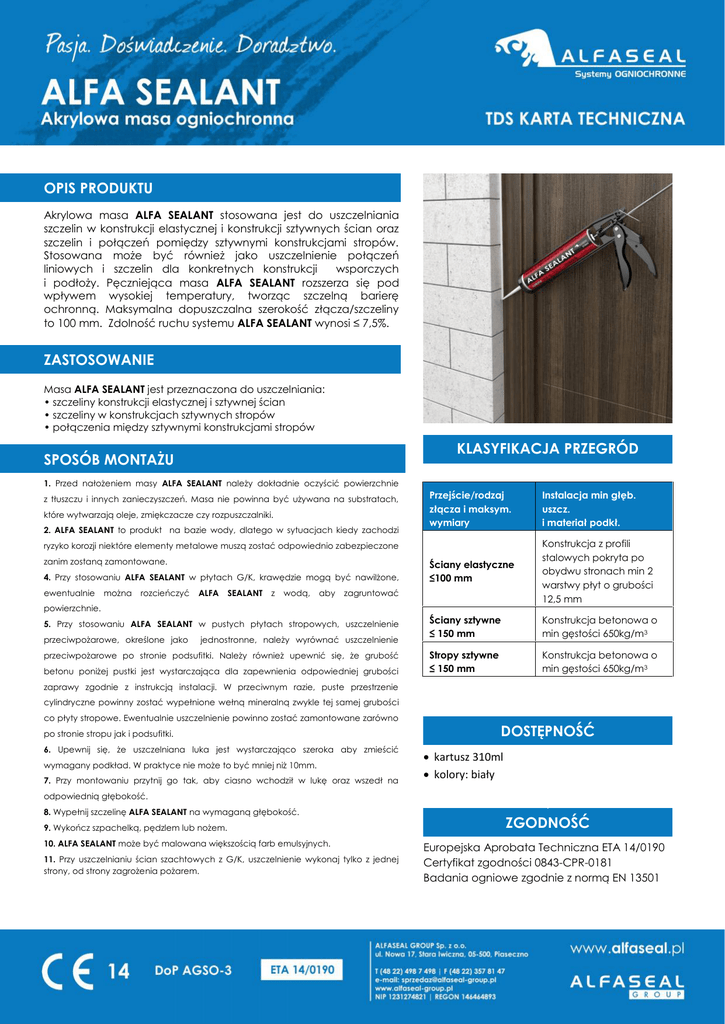 . OPIS PRODUKTU Akrylowa masa ALFA SEALANT stosowana jest do uszczelniania szczelin w konstrukcji elastycznej i konstrukcji sztywnych ścian oraz szczelin i połączeń pomiędzy sztywnymi konstrukcjami stropów. Stosowana może być również jako uszczelnienie połączeń liniowych i szczelin dla konkretnych konstrukcji wsporczych i podłoży. Pęczniejąca masa ALFA SEALANT rozszerza się pod wpływem wysokiej temperatury, tworząc szczelną barierę ochronną. Maksymalna dopuszczalna szerokość złącza/szczeliny to 100 mm. Zdolność ruchu systemu ALFA SEALANT wynosi ≤ 7,5%. ZASTOSOWANIE Masa ALFA SEALANT jest przeznaczona do uszczelniania: • szczeliny konstrukcji elastycznej i sztywnej ścian • szczeliny w konstrukcjach sztywnych stropów • połączenia między sztywnymi konstrukcjami stropów . KLASYFIKACJA PRZEGRÓD SPOSÓB MONTAŻU 1. Przed nałożeniem masy ALFA SEALANT należy dokładnie oczyścić powierzchnie z tłuszczu i innych zanieczyszczeń. Masa nie powinna być używana na substratach, które wytwarzają oleje, zmiękczacze czy rozpuszczalniki. 2. ALFA SEALANT to produkt na bazie wody, dlatego w sytuacjach kiedy zachodzi Przejście/rodzaj złącza i maksym. wymiary Instalacja min głęb. uszcz. i materiał podkł. Ściany elastyczne ≤100 mm Konstrukcja z profili stalowych pokryta po obydwu stronach min 2 warstwy płyt o grubości 12,5 mm Ściany sztywne ≤ 150 mm Konstrukcja betonowa o min gęstości 650kg/m3 Stropy sztywne ≤ 150 mm Konstrukcja betonowa o min gęstości 650kg/m3 ryzyko korozji niektóre elementy metalowe muszą zostać odpowiednio zabezpieczone zanim zostaną zamontowane. 4. Przy stosowaniu ALFA SEALANT w płytach G/K, krawędzie mogą być nawilżone, ewentualnie można rozcieńczyć ALFA SEALANT z wodą, aby zagruntować powierzchnie. 5. Przy stosowaniu ALFA SEALANT w pustych płytach stropowych, uszczelnienie przeciwpożarowe, określone jako jednostronne, należy wyrównać uszczelnienie przeciwpożarowe po stronie podsufitki. Należy również upewnić się, że grubość betonu poniżej pustki jest wystarczająca dla zapewnienia odpowiedniej grubości zaprawy zgodnie z instrukcją instalacji. W przeciwnym razie, puste przestrzenie cylindryczne powinny zostać wypełnione wełną mineralną zwykle tej samej grubości co płyty stropowe. Ewentualnie uszczelnienie powinno zostać zamontowane zarówno po stronie stropu jak i podsufitki. 6. Upewnij się, że uszczelniana luka jest wystarczająco szeroka aby zmieścić wymagany podkład. W praktyce nie może to być mniej niż 10mm. 7. Przy montowaniu przytnij go tak, aby ciasno wchodził w lukę oraz wszedł na odpowiednią głębokość. 8. Wypełnij szczelinę ALFA SEALANT na wymaganą głębokość. 9. Wykończ szpachelką, pędzlem lub nożem. 10. ALFA SEALANT może być malowana większością farb emulsyjnych. 11. Przy uszczelnianiu ścian szachtowych z G/K, uszczelnienie wykonaj tylko z jednej strony, od strony zagrożenia pożarem. . DOSTĘPNOŚĆ kartusz 310ml kolory: biały . ZGODNOŚĆ Europejska Aprobata Techniczna ETA 14/0190 Certyfikat zgodności 0843-CPR-0181 Badania ogniowe zgodnie z normą EN 13501 KLASYFIKACJA OGNIOWA TYP Instalacja Podkład Klasyfikacja Uszczelnienie liniowe szczelin w elastycznych lub sztywnych konstrukcjach o grubośc ściany i≥100mm Min. 9 mm Wełna mineralna 20 mm, gęstość 40kg/m3 EI 90–V–X–F–W30 Min. 20 mm Pręt PE EI 120–T–X–F–W30 Płyta GK/beton Uszczelnienie liniowe szczelin w elastycznych lub sztywnych konstrukcjach o grubości ściany ≥130mm Min. 15 Wełna mineralna Knauf Rocksilk 33, 15mm EI 120–V–X–F–W30 Min. 30 Płyta GK/beton Arkusz tektury Min 15 Min 30 EI 120-V-X-F-W30 Pręt PE EI 90-V-X-F-W30 Uszczelnienie w sztywnej konstrukcji stropu o grubości ≥150mm Beton Min. 25 Wełna mineralna 25 mm, 40kg/m3 EI 120-H-X-F-W100