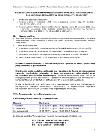 Załącznik nr 7 do Zarządzenia nr 41/2016 Pomorskiego Kuratora Oświaty z dnia 8 września 2016 r. SZCZEGÓŁOWY REGULAMIN WOJEWÓDZKIEGO KONKURSU HISTORYCZNEGO DLA UCZNIÓW GIMNAZJÓW W ROKU SZKOLNYM 2016/2017 Podstawa prawna konkursów: I. 1. Ustawa z dnia 7 września 1991 roku o systemie oświaty (Dz. U. z 2015 r. poz. 2156 z późn. zm.). 2. Rozporządzenie Ministra Edukacji Narodowej i Sportu z dnia 29 stycznia 2002 roku w sprawie organizacji oraz sposobu przeprowadzania konkursów, turniejów i olimpiad (Dz. U. z 2002 r., Nr 13, poz.125 z późn. zm.). II. Uwagi ogólne: 1. Pomorski Kurator Oświaty organizuje na terenie województwa pomorskiego konkursy przedmiotowe, które obejmują i poszerzają treści podstawy programowej jednego przedmiotu. 2. Celem konkursów jest: 1) rozwijanie uzdolnień i zainteresowań uczniów szkół podstawowych i gimnazjów, 2) rozwijanie zdolności stosowania zdobytej wiedzy w praktycznym działaniu, 3) tworzenie płaszczyzny pozytywnej i twórczej rywalizacji uczniów i ich szkół, 4) promowanie nauczycieli i szkół wspierających uzdolnienia uczniów. Konkurs przedmiotowy z historii obejmuje i poszerza treści podstawy programowej z przedmiotu. Eliminacje wojewódzkie polegają na rozwiązaniu testu zawierającego zadania zamknięte, otwarte, w tym rozszerzonej odpowiedzi oraz na analizie materiałów źródłowych. Zadania konkursowe (np. testy) są zweryfikowane przez nauczycieli - doradców metodycznych lub nauczycieli – konsultantów lub dydaktyków zatrudnionych w uczelniach wyższych. Udział w konkursie jest jednoznaczny z wyrażeniem zgody na opublikowanie niezbędnych danych osobowych związanych z ogłoszeniem wyników na stronach Kuratorium Oświaty oraz organizatora Konkursu. III . Organizacja i przebieg konkursu: 1.Eliminacje konkursu są trzystopniowe: Stopień I - szkolny II - rejonowy III - wojewódzki Eliminacje 18.11.2016 r. godz. 14.00 szkoły macierzyste 10.02.2017 r. godz. 14.00 szkoły z Tabeli 1 10.03.2017 r. godz. 12.00 IX LO Gdańsk 2. Główną siedzibą Wojewódzkiej Komisji Konkursowej z historii jest: IX LICEUM OGÓLNOKSZTAŁCACE ul. Wilka – Krzyżanowskiego 8 80 – 271 Gdańsk – Wrzeszcz 1 Załącznik nr 7 do Zarządzenia nr 41/2016 Pomorskiego Kuratora Oświaty z dnia 8 września 2016 r. 3. Eliminacje stopnia II (dla rejonu Gdańsk i powiat gdański), oraz stopnia III (eliminacje wojewódzkie) odbywają się w siedzibie WKK 4.Przewodniczący komisji na każdym stopniu konkursu są odpowiedzialni za dostosowanie warunków technicznych do zgłoszonych wcześniej szczególnych potrzeb uczestników konkursu (np. przygotowanie stanowiska dla ucznia poruszającego się na wózku inwalidzkim). Nie przewiduje się zmian merytorycznych testu, ani czasu przeznaczonego na rozwiązywanie zadań konkursowych. 5. Warunkiem koniecznym przystąpienia szkoły do konkursu i organizacji na jej terenie eliminacji szkolnych jest dokonanie zgłoszenia poprzez elektroniczny formularz dostępny na stronie IX LO w Gdańsku w nieprzekraczalnym terminie do 12 października 2016 r. na adres [email protected] Po dokonaniu zgłoszenia na podany w formularzu adres e-mail szkoły zostanie wysłane potwierdzenie rejestracji. Korespondencja WKK ze zgłoszoną szkołą będzie prowadzona tylko poprzez wskazany w formularzu adres mailowy szkoły. 6.Wszelkie pytania (nie zgłoszenia szkół na konkurs) można kierować na adres przewodniczącego WKK w Gdańsku: [email protected] 7. Warunkiem koniecznym udziału ucznia w konkursie jest wypełnienie komputerowo „Karty zgłoszenia ucznia do konkursu” i przekazanie jej Szkolnej Komisji Konkursowej (załącznik nr 1 do Ramowego regulaminu konkursu). Karta musi być podpisana przez dyrektora szkoły, do której uczęszcza uczeń i przez rodzica (prawnego opiekuna). Podpis rodzica automatycznie jest zgodą na uczestnictwo dziecka w konkursie i na przetwarzanie jego danych na potrzeby konkursu oraz na publikację wyników konkursowych w Internecie. 8. Uczeń może przystąpić do odpowiedniego stopnia konkursu po okazaniu komisji konkursowej aktualnej legitymacji szkolnej. 9.Uczestnicy stopnia II i III winni stawić się w miejscu odbywania konkursu na pół godziny przed jego rozpoczęciem. Niestawienie się ucznia o godzinie rozpoczęcia konkursu oznacza rezygnację z udziału w konkursie. 10.Dokumentację związaną z konkursem przechowuje się w Wojewódzkiej Komisji Konkursowej (WKK) do końca roku szkolnego. siedzibie 11. Zadania stopnia II i III są ogłaszane przez przewodniczącego WKK na stronie internetowej WKK w następnym dniu roboczym po przeprowadzeniu eliminacji, a klucz odpowiedzi w dniu ogłoszenia wyników odpowiednio II i III stopnia. 12. Przewodniczący WKK mają prawo do weryfikacji prac uczestników na każdym stopniu konkursu. 2 Załącznik nr 7 do Zarządzenia nr 41/2016 Pomorskiego Kuratora Oświaty z dnia 8 września 2016 r. IV. Organizacja i przebieg eliminacji I stopnia (szkolnych) - 18 listopada 2016 r. godz. 14.00. 1. Do 12 października br. nauczyciele historii informują zainteresowanych uczniów o założeniach konkursu i warunkach uczestnictwa. Uczniowie pragnący wziąć udział w konkursie zgłoszą chęć uczestnictwa nauczycielowi historii. 2. Eliminacje szkolne są organizowane przez Szkolną Komisję Konkursową (SKK) powołaną przez dyrektora szkoły, który do ukończenia eliminacji I stopnia odpowiada za prawidłowy przebieg konkursu oraz nadzoruje właściwe punktowanie i ocenianie prac konkursowych. 3. Eliminacje I stopnia polegają na rozwiązaniu przez uczniów testu z historii, zawierającego zadania typu zamkniętego i otwartego. 4. Czas trwania eliminacji nie może przekroczyć 90 minut. Podczas ich trwania uczniowie nie mogą korzystać z pomocy przedmiotowych, np.: tablic historycznych, atlasów, itp. 5. Dla SKK zestaw zadań z historii przygotowuje Wojewódzka Komisja Konkursowa. Zadania zostaną przekazane drogą elektroniczną Przewodniczą