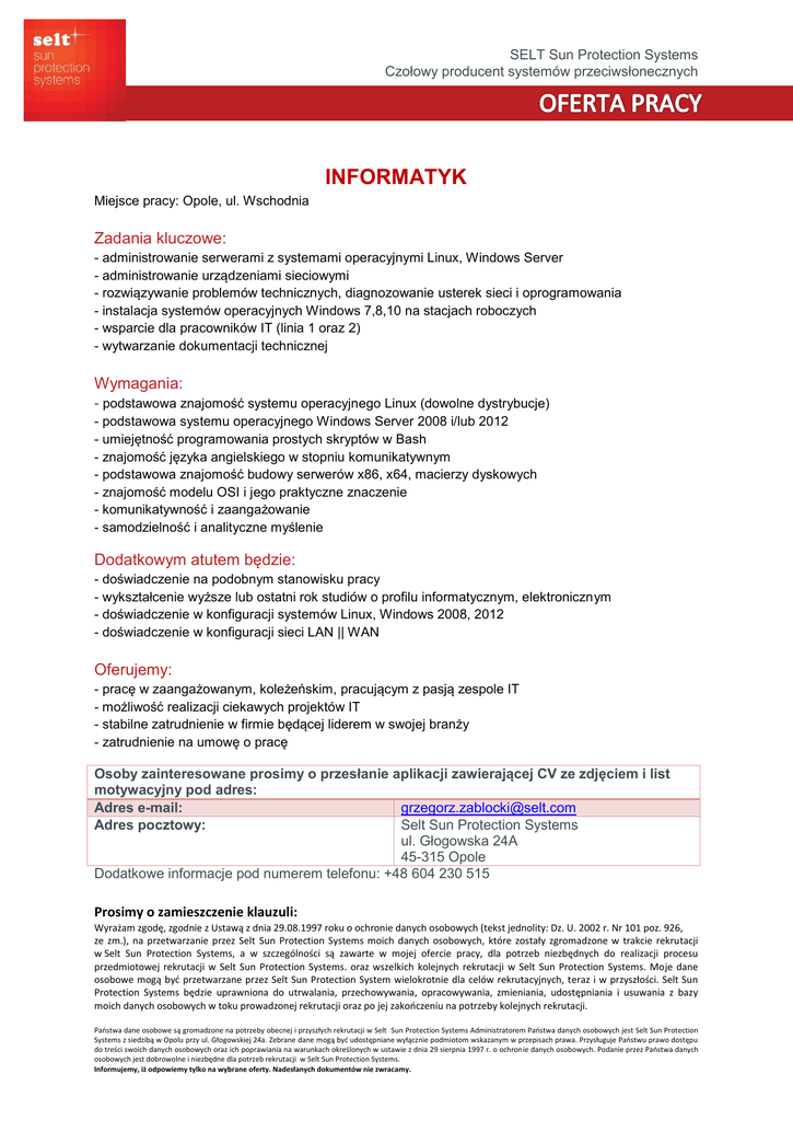 SELT Sun Protection Systems Czołowy producent systemów przeciwsłonecznych INFORMATYK Miejsce pracy: Opole, ul. Wschodnia Zadania kluczowe: - administrowanie serwerami z systemami operacyjnymi Linux, Windows Server - administrowanie urządzeniami sieciowymi - rozwiązywanie problemów technicznych, diagnozowanie usterek sieci i oprogramowania - instalacja systemów operacyjnych Windows 7,8,10 na stacjach roboczych - wsparcie dla pracowników IT (linia 1 oraz 2) - wytwarzanie dokumentacji technicznej Wymagania: - podstawowa znajomość systemu operacyjnego Linux (dowolne dystrybucje) - podstawowa systemu operacyjnego Windows Server 2008 i/lub 2012 - umiejętność programowania prostych skryptów w Bash - znajomość języka angielskiego w stopniu komunikatywnym - podstawowa znajomość budowy serwerów x86, x64, macierzy dyskowych - znajomość modelu OSI i jego praktyczne znaczenie - komunikatywność i zaangażowanie - samodzielność i analityczne myślenie Dodatkowym atutem będzie: - doświadczenie na podobnym stanowisku pracy - wykształcenie wyższe lub ostatni rok studiów o profilu informatycznym, elektronicznym - doświadczenie w konfiguracji systemów Linux, Windows 2008, 2012 - doświadczenie w konfiguracji sieci LAN || WAN Oferujemy: - pracę w zaangażowanym, koleżeńskim, pracującym z pasją zespole IT - możliwość realizacji ciekawych projektów IT - stabilne zatrudnienie w firmie będącej liderem w swojej branży - zatrudnienie na umowę o pracę Osoby zainteresowane prosimy o przesłanie aplikacji zawierającej CV ze zdjęciem i list motywacyjny pod adres: Adres e-mail: [email protected] Adres pocztowy: Selt Sun Protection Systems ul. Głogowska 24A 45-315 Opole Dodatkowe informacje pod numerem telefonu: +48 604 230 515 Prosimy o zamieszczenie klauzuli: Wyrażam zgodę, zgodnie z Ustawą z dnia 29.08.1997 roku o ochronie danych osobowych (tekst jednolity: Dz. U. 2002 r. Nr 101 poz. 926, ze zm.), na przetwarzanie przez Selt Sun Protection Systems moich danych osobowych, które zostały zgromadzone w trakcie rekrutacji w Selt Sun Protection Systems, a w szczególności są zawarte w mojej ofercie pracy, dla potrzeb niezbędnych do realizacji procesu przedmiotowej rekrutacji w Selt Sun Protection Systems. oraz wszelkich kolejnych rekrutacji w Selt Sun Protection Systems. Moje dane osobowe mogą być przetwarzane przez Selt Sun Protection System wielokrotnie dla celów rekrutacyjnych, teraz i w przyszłości. Selt Sun Protection Systems będzie uprawniona do utrwalania, przechowywania, opracowywania, zmieniania, udostępniania i usuwania z bazy moich danych osobowych w toku prowadzonej rekrutacji oraz po jej zakończeniu na potrzeby kolejnych rekrutacji. Państwa dane osobowe są gromadzone na potrzeby obecnej i przyszłych rekrutacji w Selt Sun Protection Systems Administratorem Państwa danych osobowych jest Selt Sun Protection Systems z siedzibą w Opolu przy ul. Głogowskiej 24a. Zebrane dane mogą być udostępniane wyłącznie podmiotom wskazanym w przepisach prawa. Przysługuje Państwu prawo dostępu do treści swoich danych osobowych oraz ich poprawiania na warunkach określonych w ustawie z dnia 29 sierpnia 1997 r. o ochronie danych osobowych. Podanie przez Państwa danych osobowych jest dobrowolne i niezbędne dla potrzeb rekrutacji w Selt Sun Protection Systems. Informujemy, iż odpowiemy tylko na wybrane oferty. Nadesłanych dokumentów nie zwracamy.