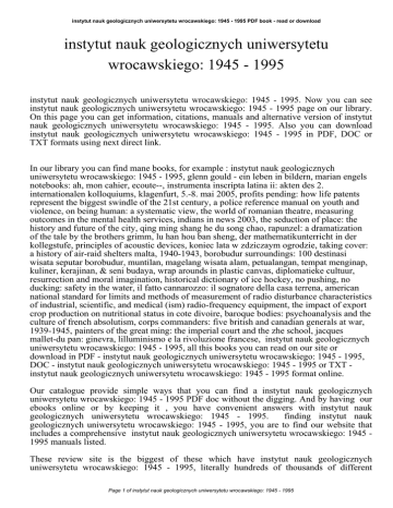 instytut nauk geologicznych uniwersytetu wrocawskiego: 1945 - 1995 PDF book - read or download instytut nauk geologicznych uniwersytetu wrocawskiego: 1945 - 1995 instytut nauk geologicznych uniwersytetu wrocawskiego: 1945 - 1995. Now you can see instytut nauk geologicznych uniwersytetu wrocawskiego: 1945 - 1995 page on our library. On this page you can get information, citations, manuals and alternative version of instytut nauk geologicznych uniwersytetu wrocawskiego: 1945 - 1995. Also you can download instytut nauk geologicznych uniwersytetu wrocawskiego: 1945 - 1995 in PDF, DOC or TXT formats using next direct link. In our library you can find mane books, for example : instytut nauk geologicznych uniwersytetu wrocawskiego: 1945 - 1995, glenn gould - ein leben in bildern, marian engels notebooks: ah, mon cahier, ecoute--, instrumenta inscripta latina ii: akten des 2. internationalen kolloquiums, klagenfurt, 5.-8. mai 2005, profits pending: how life patents represent the biggest swindle of the 21st century, a police reference manual on youth and violence, on being human: a systematic view, the world of romanian theatre, measuring outcomes in the mental health services, indians in news 2003, the seduction of place: the history and future of the city, qing ming shang he du song chao, rapunzel: a dramatization of the tale by the brothers grimm, lu han hou ban sheng, der mathematikunterricht in der kollegstufe, principles of acoustic devices, koniec lata w zdziczaym ogrodzie, taking cover: a history of air-raid shelters malta, 1940-1943, borobudur surroundings: 100 destinasi wisata seputar borobudur, muntilan, magelang wisata alam, petualangan, tempat menginap, kuliner, kerajinan, & seni budaya, wrap arounds in plastic canvas, diplomatieke cultuur, resurrection and moral imagination, historical dictionary of ice hockey, no pushing, no ducking: safety in the water, il fatto cannarozzo: il sognatore della casa terrena, american national standard for limits and methods of measurement of radio disturbance characteristics of industrial, scientific, and medical (ism) radio-frequency equipment, the impact of export crop production on nutritional status in cote divoire, baroque bodies: psychoanalysis and the culture of french absolutism, corps commanders: five british and canadian generals at war, 1939-1945, painters of the great ming: the imperial court and the zhe school, jacques mallet-du pan: ginevra, lilluminismo e la rivoluzione francese, instytut nauk geologicznych uniwersytetu wrocawskiego: 1945 - 1995, all this books you can read on our site or download in PDF - instytut nauk geologicznych uniwersytetu wrocawskiego: 1945 - 1995, DOC - instytut nauk geologicznych uniwersytetu wrocawskiego: 1945 - 1995 or TXT instytut nauk geologicznych uniwersytetu wrocawskiego: 1945 - 1995 format online. Our catalogue provide simple ways that you can find a instytut nauk geologicznych uniwersytetu wrocawskiego: 1945 - 1995 PDF doc without the digging. And by having our ebooks online or by keeping it , you have convenient answers with instytut nauk geologicznych uniwersytetu wrocawskiego: 1945 - 1995. finding instytut nauk geologicznych uniwersytetu wrocawskiego: 1945 - 1995, you are to find our website that includes a comprehensive instytut nauk geologicznych uniwersytetu wrocawskiego: 1945 1995 manuals listed. These review site is the biggest of these which have instytut nauk geologicznych uniwersytetu wrocawskiego: 1945 - 1995, literally hundreds of thousands of different Page 1 of instytut nauk geologicznych uniwersytetu wrocawskiego: 1945 - 1995 instytut nauk geologicznych uniwersytetu wrocawskiego: 1945 - 1995 PDF book - read or download products represented. So as to there are particular sites catered to different product also categories or types, brands or niches related to instytut nauk geologicznych uniwersytetu wrocawskiego: 1945 - 1995. So depending on just what you are searching, you will be able to choose ebooks instytut nauk geologicznych uniwersytetu wrocawskiego: 1945 - 1995 to suit your own needs, instytut nauk geologicznych uniwersytetu wrocawskiego: 1945 - 1995. Page 2 of instytut nauk geologicznych uniwersytetu wrocawskiego: 1945 - 1995