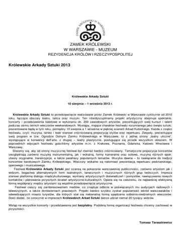 ZAMEK KRÓLEWSKI W WARSZAWIE - MUZEUM REZYDENCJA KRÓLÓW I RZECZYPOSPOLITEJ Królewskie Arkady Sztuki 2013 Królewskie Arkady Sztuki 10 sierpnia – 1 września 2013 r. Królewskie Arkady Sztuki to przedsięwzięcie realizowane przez Zamek Królewski w Warszawie cyklicznie od 2010 roku, łączące obszary teatru, tańca oraz muzyki. Ten interdyscyplinarny projekt artystyczny obejmuje spektakle, koncerty i przedstawienia baletowe w wykonaniu ok. 200 zawodowych artystów, prezentujących swój kunszt i talent podczas ośmiu letnich wieczorów weekendowych. Występy, mające charakter festiwalu rozumianego jako święto sztuki, prezentowane będą w tym roku, pomiędzy 10 sierpnia a 1 września w pięknej scenerii Arkad Kubickiego. Każda z części festiwalu, czyli: muzyka, taniec i teatr stanowi zróżnicowaną propozycję stylów oraz repertuaru. Zespoły, prezentujące swój program w tzw. Ogrodzie Dolnym Zamku Królewskiego w Warszawie, to z jednej strony „teatry uliczne”, występujące w konwencji dell’arte, z drugiej – teatry plastyczne, posługujące się przede wszystkim obrazem. W poprzednich edycjach festiwalu gościliśmy artystów m.in. z Krakowa, Poznania, Gdańska, Katowic Wrocławia i Warszawy. Staramy się, aby od strony muzycznej festiwal był również bardzo zróżnicowany. Tematyczne propozycje koncertów uwzględniają zarówno muzykę instrumentalną, jak i wokalną, formy kameralne oraz solowe, muzykę różnych epok: utwory oryginalne, transkrypcje, a także parafrazy popularnych tematów. Muzyka dawna – to nawiązanie do tradycji koncertów barokowych Zamku Królewskiego. Wieczory wokalne są natomiast prezentacją repertuaru pieśniarskiego, operowego i musicalowego. Festiwal Królewskie Arkady Sztuki jest szansą na pokazanie warszawskiej publiczności, zarówno artystom jak i widzom, bogactwa alternatywnych form teatralnych, tanecznych i muzycznych różnych grup twórczych. Impreza stanowi platformę dialogu międzykulturowego, wymiany artystycznych doświadczeń i pomysłów, nawiązywania nowych kontaktów i planowania przyszłych działań artystyczno-kulturalnych. Opiera się na założeniu, że najbardziej efektywną formą współpracy między artystami są wspólne przedsięwzięcia artystyczne. Festiwal cieszy się zainteresowaniem mediów, co znajduje odbicie w poświęcanych mu audycjach radiowych i telewizyjnych, a także doniesieniach prasowych. Projekt bardzo szybko zyskał popularność wśród warszawiaków i odwiedzających miasto turystów, dla których stał się niebanalną formą spędzania sobotnio-niedzielnych wieczorów. Dość dodać, że corocznie w imprezach Królewskich Arkad Sztuki bierze udział niemal 20 tysięcy widzów. Wstęp na wszystkie koncerty i przedstawienia jest bezpłatny. Podobną formę organizacji festiwalu chcemy zachować w przyszłości. Tomasz Taraszkiewicz autor projektu i dyrektor festiwalu Królewskie Arkady Sztuki; tel. 22 35 55 357; 883 357 414 Dokumenty do pobrania Królewskie Arkady Sztuki - repertuar (81.7 KB) - Zamek Królewski w Warszawie - Muzeum. Rezydencja Królów i Rzeczypospolitej www.zamek-krolewski.pl